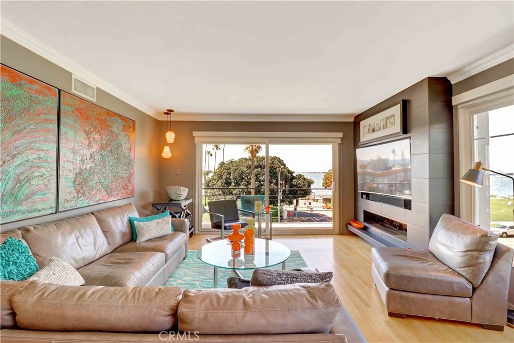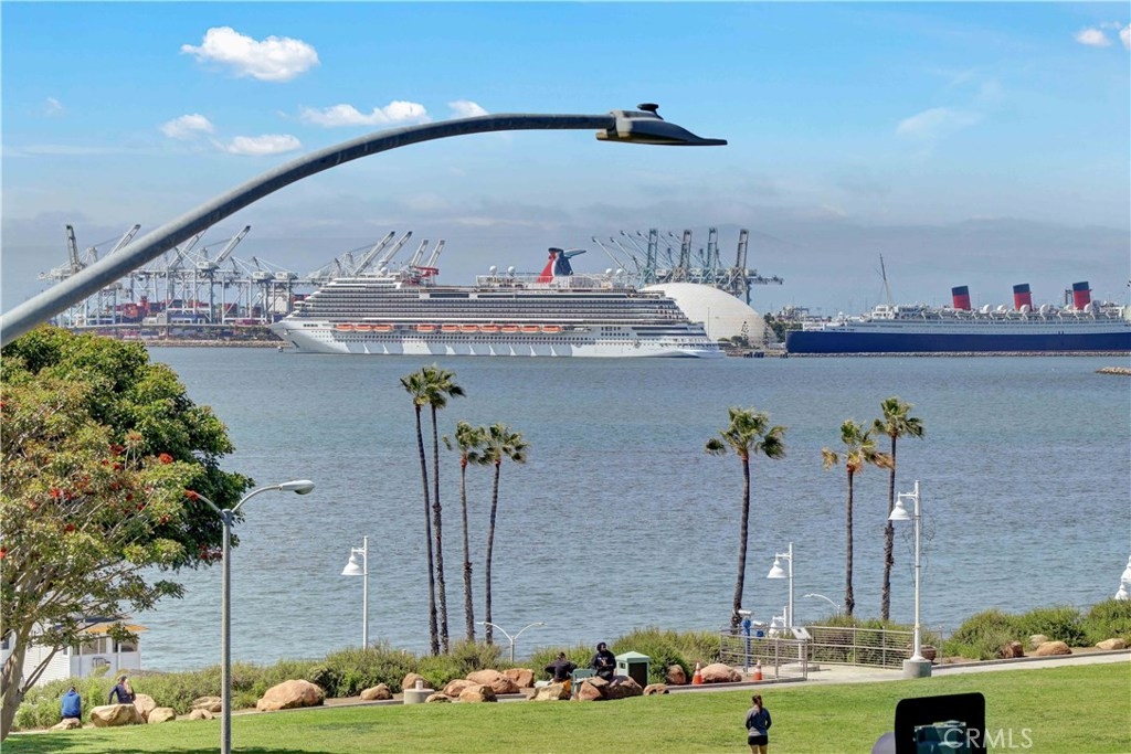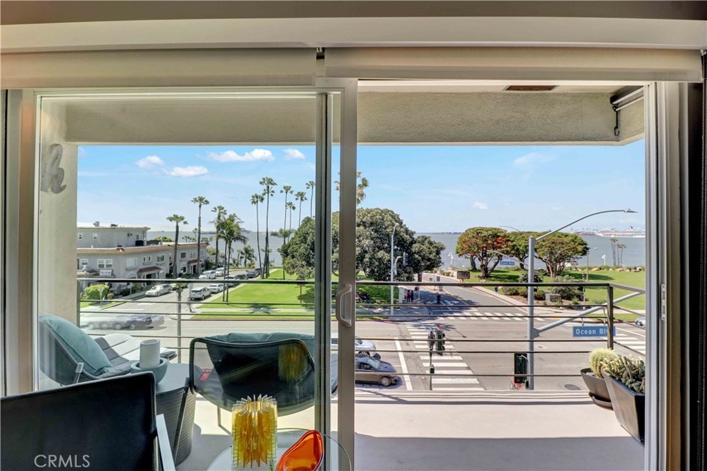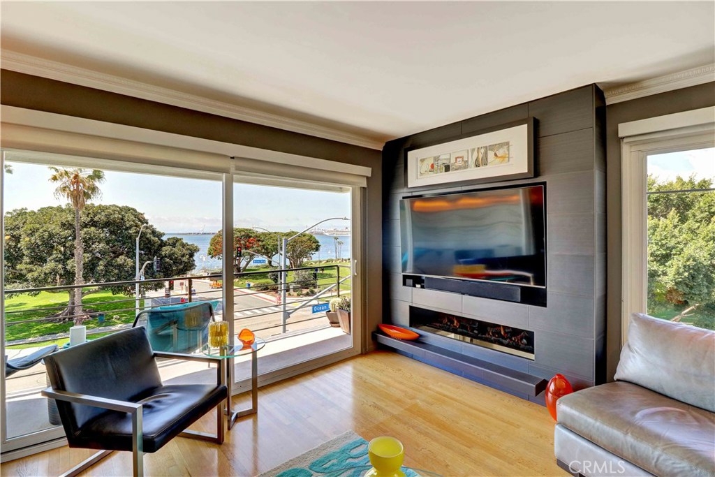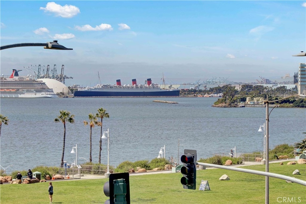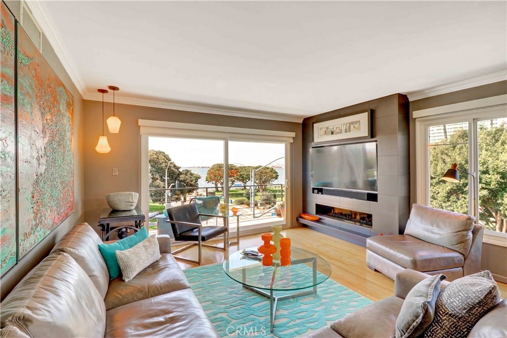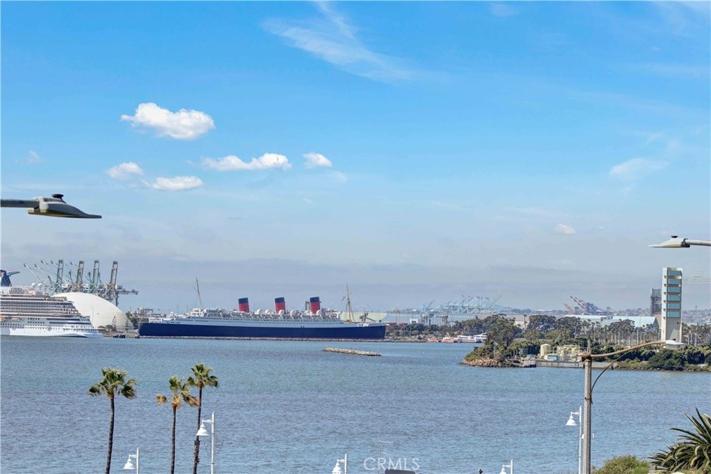 Truly once in a lifetime opportunity! Impeccably remodeled top floor corner 2 bed/2 bath condo with spectacular 180-degree views of the Pacific Ocean and Bixby Park. This mid-century modern 1459 sq ft condo features expansive views of the Iconic Queen Mary from the living room, dining room, kitchen and master bedroom. The open concept living space features custom fireplace with linear electric insert. There are three sliding doors that spill onto the two extra large balconies facing both south and west for incredible sunrises and sunsets. The remodeled kitchen features tons of European gray cabinetry, gray quartz counters, custom glass backsplash, LED lighting, high-end appliances including Bertazzoni gas cooktop, built-in oven and microwave, Perlick beverage cooler and Bosch refrigerator. Both mid-century period bathrooms are tastefully upgraded with modern lighting/fixtures and tile accents. Wake up every morning with blue ocean and green treetop views from your extra large master bedroom with tons of closet space. The second bedroom is also spacious with large closets and attached bathroom. Additional features include new designer lighting thru-out, laminated glass doors, orig hardwood floors, newer central HVAC system and walk-in laundry room with tons of storage. Located in desirable Bluff Park, the Beach Park HOA is a well-maintained, pet friendly building with low HOA fee. It has incredible access to the beach, bike path, farmers market, yoga, LB Art Museum and more!