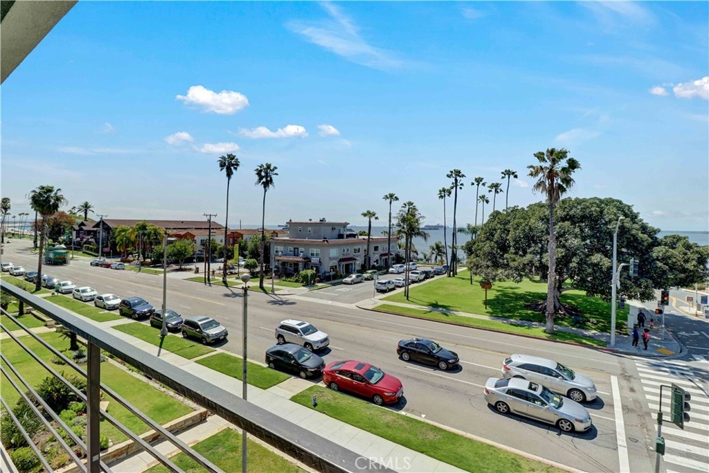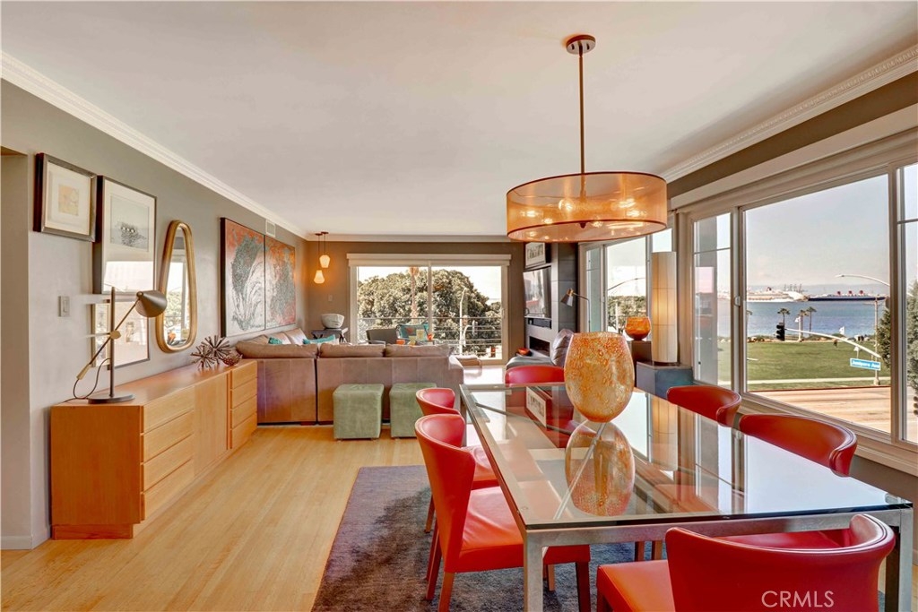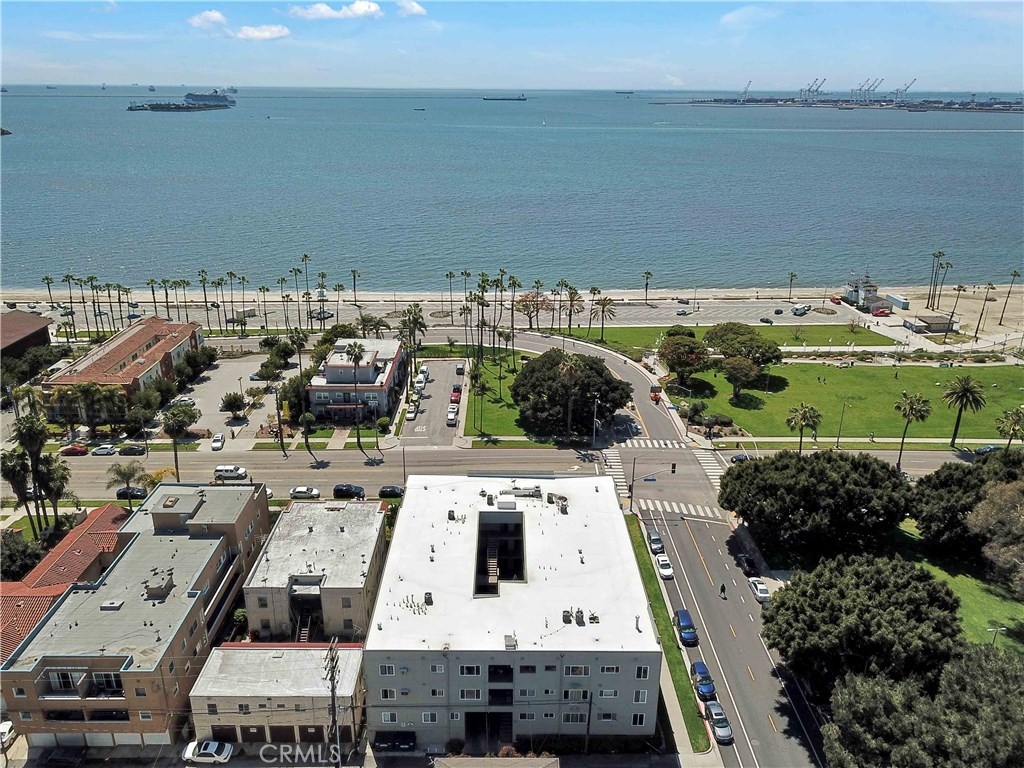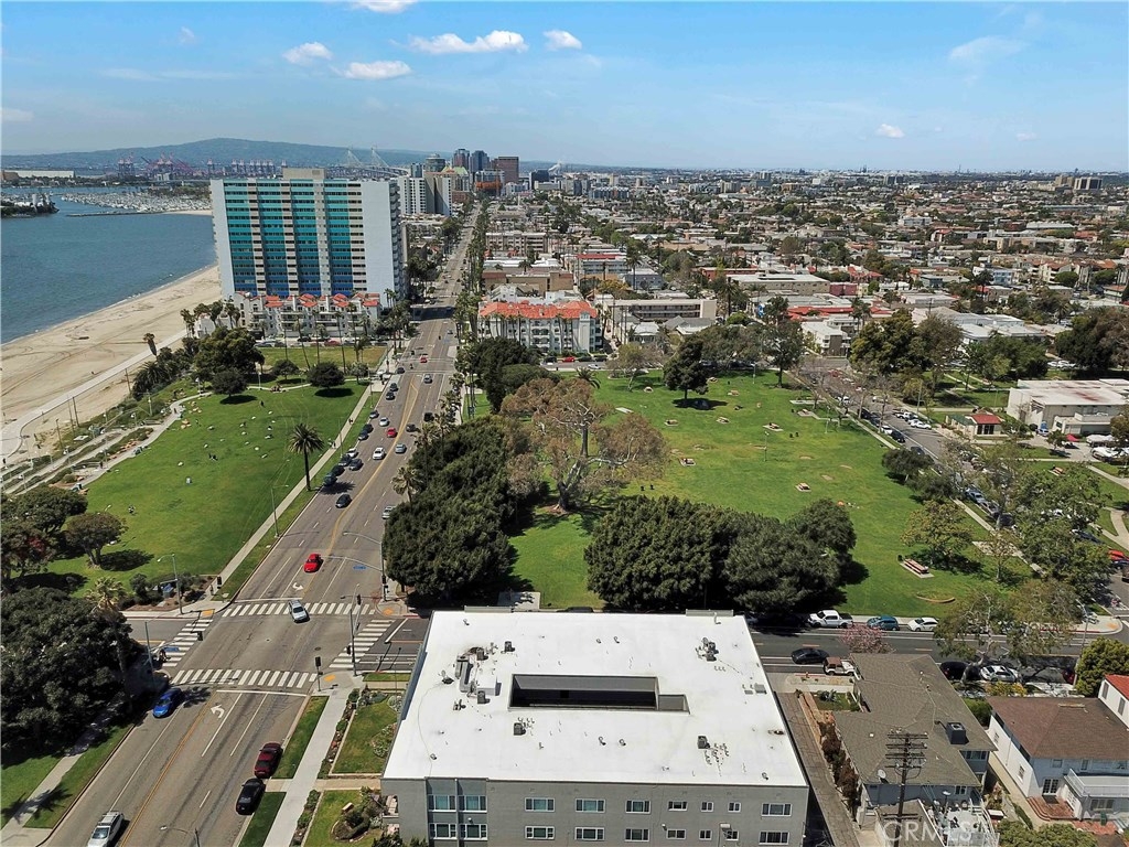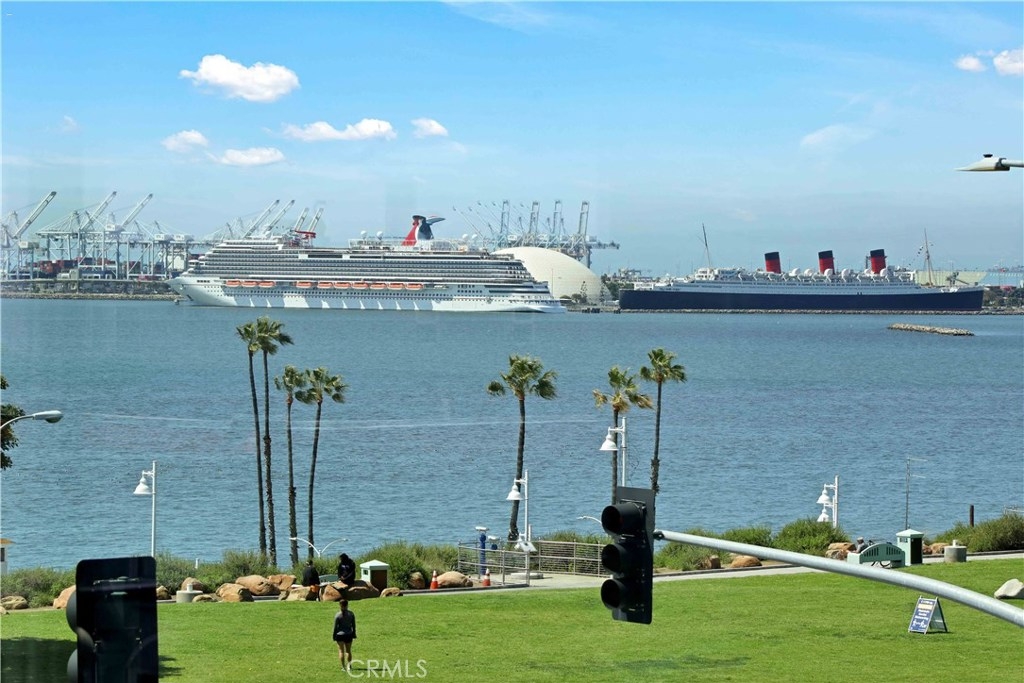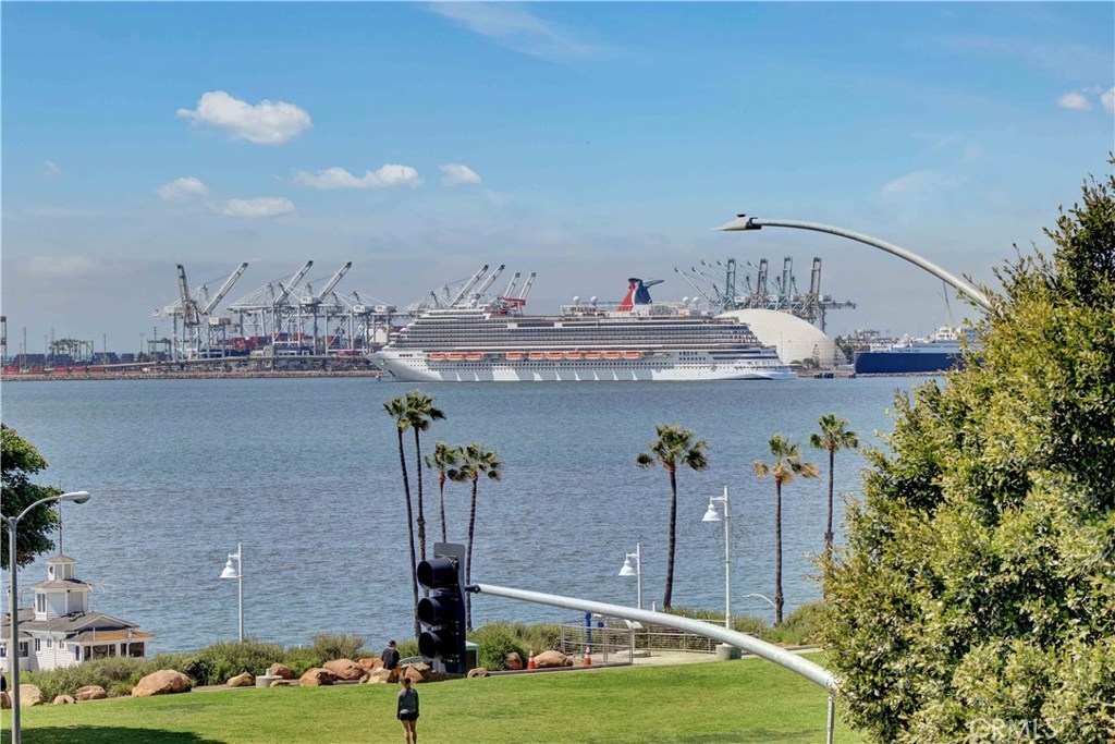 Truly once in a lifetime opportunity! Impeccably remodeled top floor corner 2 bed/2 bath condo with spectacular 180-degree views of the Pacific Ocean and Bixby Park. This mid-century modern 1459 sq ft condo features expansive views of the Iconic Queen Mary from the living room, dining room, kitchen and master bedroom. The open concept living space features custom fireplace with linear electric insert. There are three sliding doors that spill onto the two extra large balconies facing both south and west for incredible sunrises and sunsets. The remodeled kitchen features tons of European gray cabinetry, gray quartz counters, custom glass backsplash, LED lighting, high-end appliances including Bertazzoni gas cooktop, built-in oven and microwave, Perlick beverage cooler and Bosch refrigerator. Both mid-century period bathrooms are tastefully upgraded with modern lighting/fixtures and tile accents. Wake up every morning with blue ocean and green treetop views from your extra large master bedroom with tons of closet space. The second bedroom is also spacious with large closets and attached bathroom. Additional features include new designer lighting thru-out, laminated glass doors, orig hardwood floors, newer central HVAC system and walk-in laundry room with tons of storage. Located in desirable Bluff Park, the Beach Park HOA is a well-maintained, pet friendly building with low HOA fee. It has incredible access to the beach, bike path, farmers market, yoga, LB Art Museum and more!