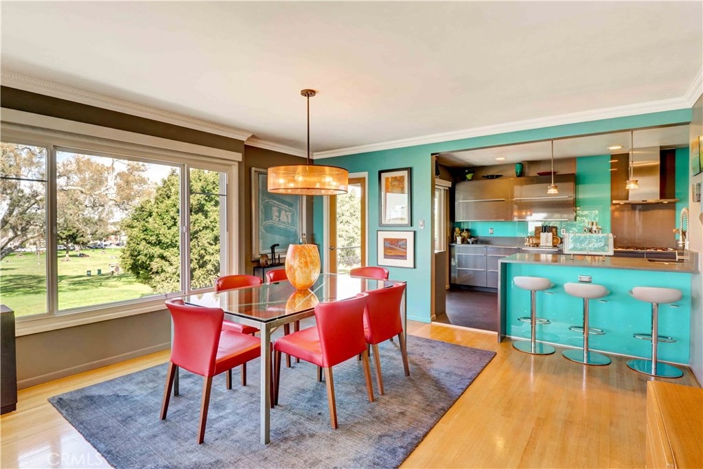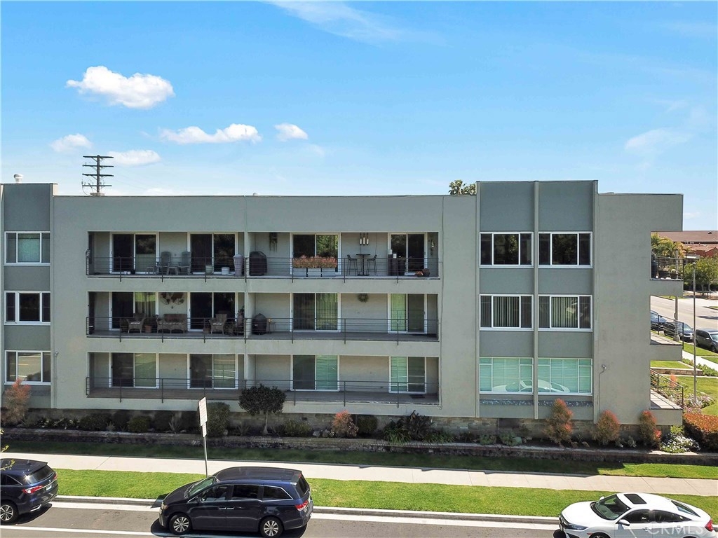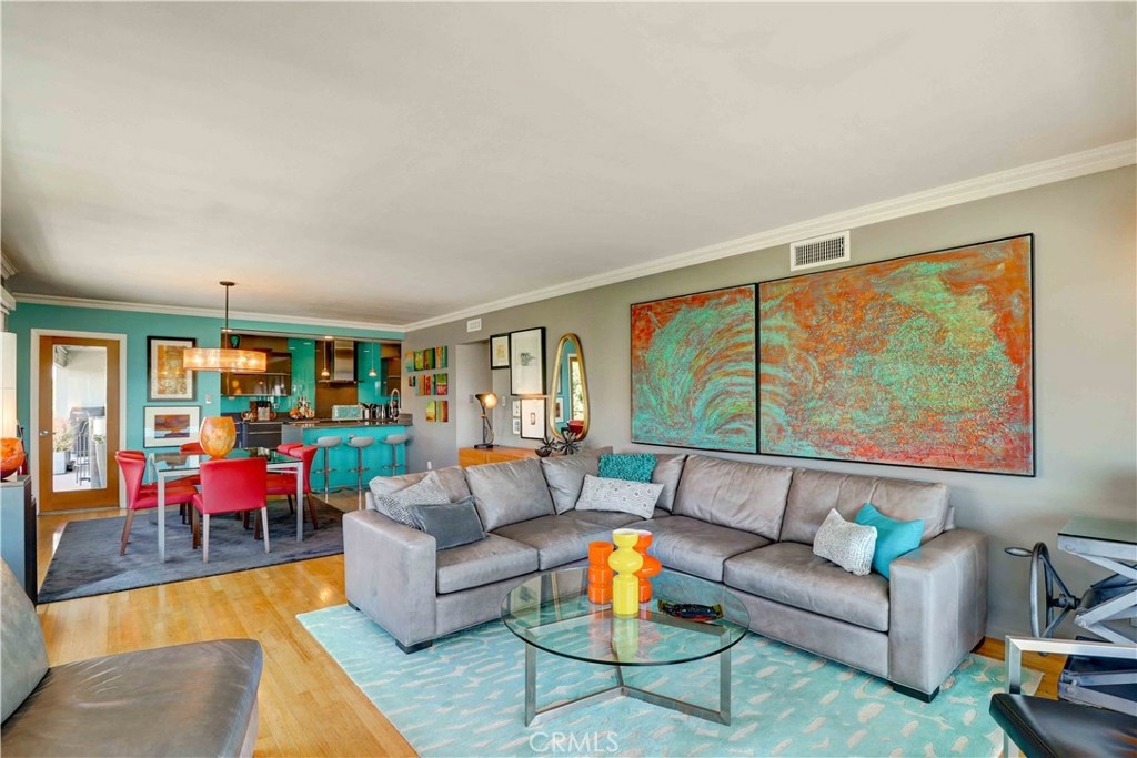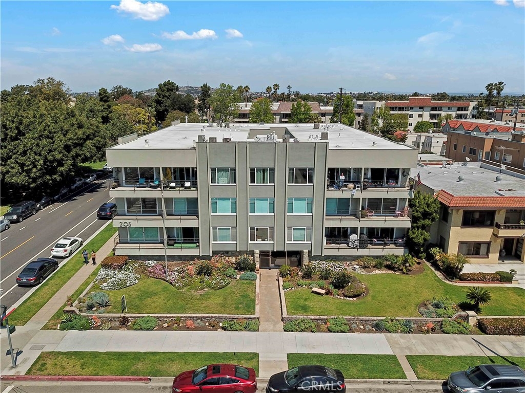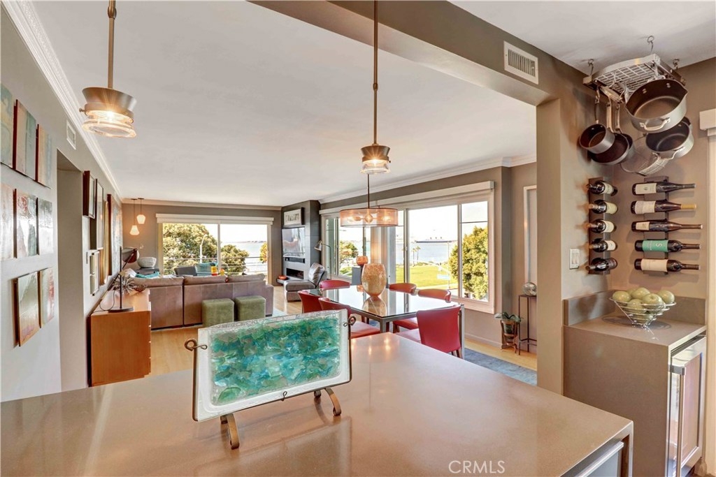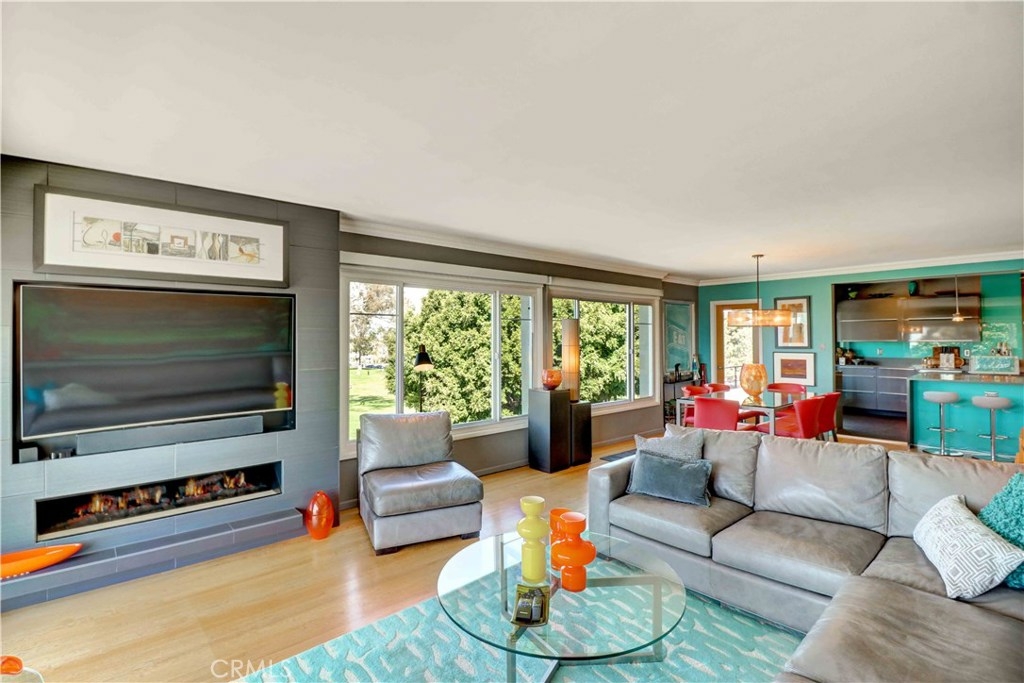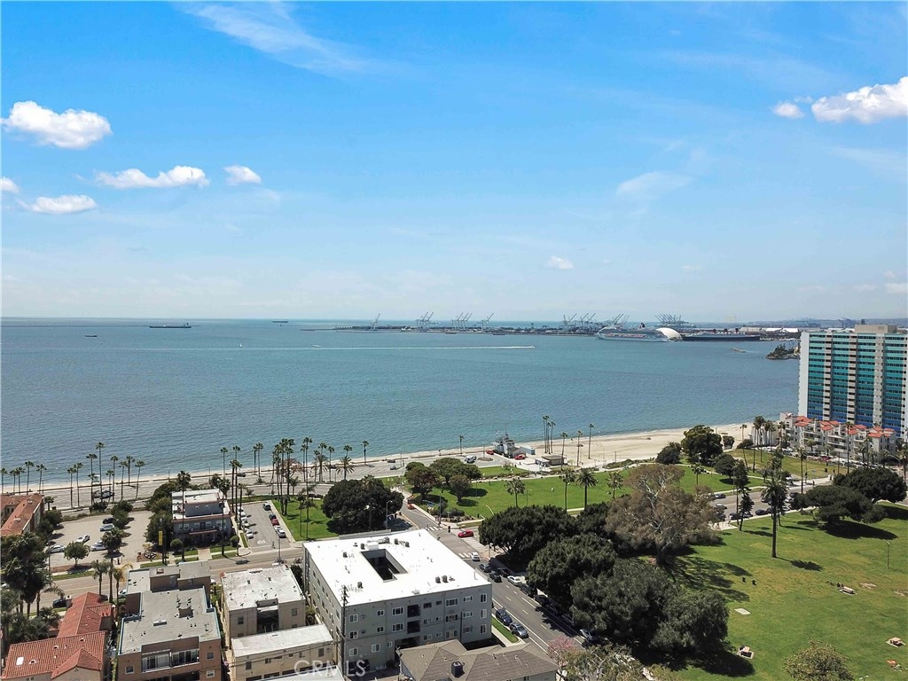 Truly once in a lifetime opportunity! Impeccably remodeled top floor corner 2 bed/2 bath condo with spectacular 180-degree views of the Pacific Ocean and Bixby Park. This mid-century modern 1459 sq ft condo features expansive views of the Iconic Queen Mary from the living room, dining room, kitchen and master bedroom. The open concept living space features custom fireplace with linear electric insert. There are three sliding doors that spill onto the two extra large balconies facing both south and west for incredible sunrises and sunsets. The remodeled kitchen features tons of European gray cabinetry, gray quartz counters, custom glass backsplash, LED lighting, high-end appliances including Bertazzoni gas cooktop, built-in oven and microwave, Perlick beverage cooler and Bosch refrigerator. Both mid-century period bathrooms are tastefully upgraded with modern lighting/fixtures and tile accents. Wake up every morning with blue ocean and green treetop views from your extra large master bedroom with tons of closet space. The second bedroom is also spacious with large closets and attached bathroom. Additional features include new designer lighting thru-out, laminated glass doors, orig hardwood floors, newer central HVAC system and walk-in laundry room with tons of storage. Located in desirable Bluff Park, the Beach Park HOA is a well-maintained, pet friendly building with low HOA fee. It has incredible access to the beach, bike path, farmers market, yoga, LB Art Museum and more!
