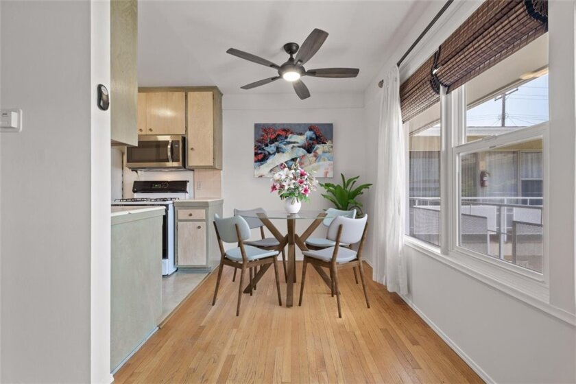 Back on Market. Freshly painted one bedroom with an enclosed GARAGE with storage, and FREE laundry! This is an upstairs unit overlooking the beautifully landscaped courtyard of the Belmont Capri. Wood floors throughout, upgraded windows, Low HOA dues, $139 a month. Wall of windows adorn the spacious living room and dining area. Ceiling fan in dining area. Nice kitchen with tiled counters and plenty of storage. The bedroom will fit a king size bed and furniture, and has a large closet. The vintage bathroom has a full size tub, and tile counters. This location in Bluff Heights is 1/2 mile to the beach. Walking distance to restaurants, shops, galleries, the Colorado Lagoon, and the biweekly farmers market. Don't miss this slice of paradise. Property appraised at $400,000!
