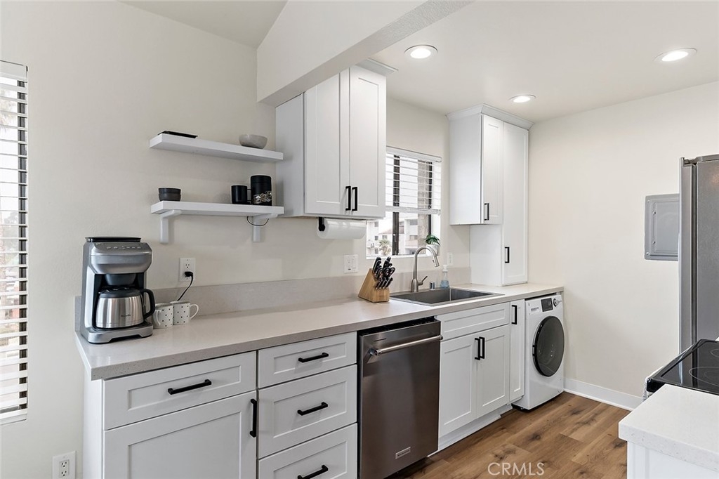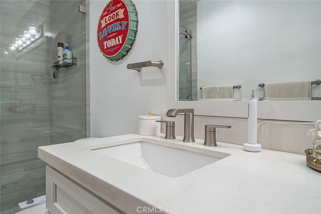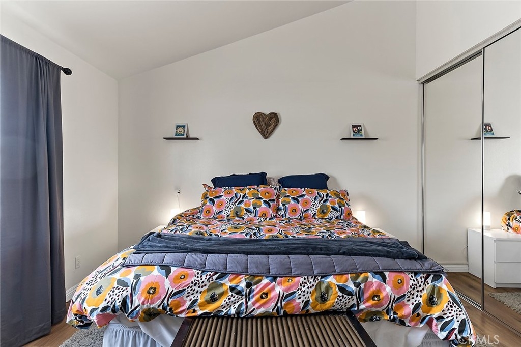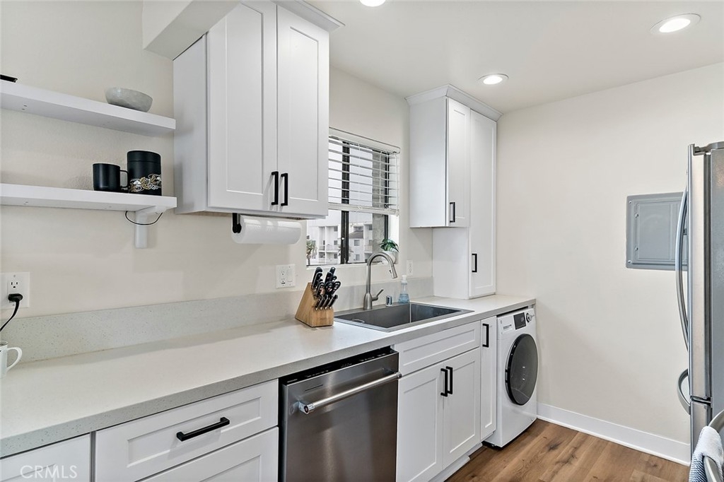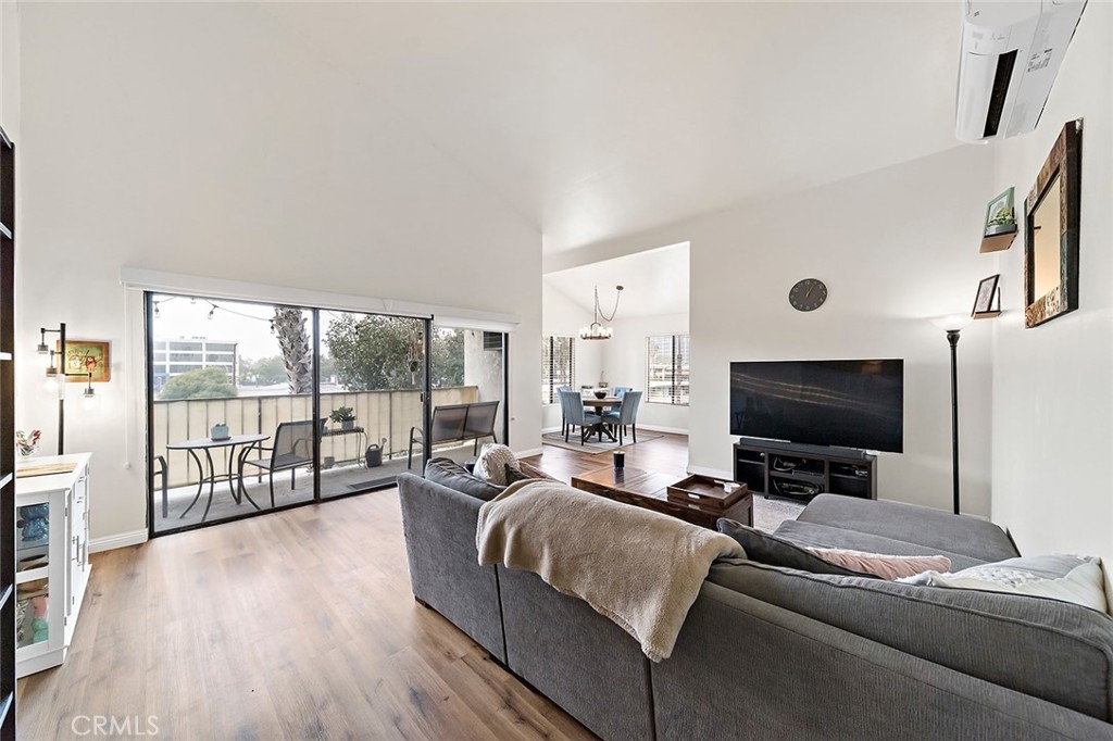 Welcome to this bright and airy, beautifully updated top-floor corner unit condo in Bixby Knolls! This 2-bedroom, 2-bathroom home has 1136 square feet of comfortable and well-designed living space. With numerous upgrades completed in 2020, this unit is turnkey and move-in ready. Just past the entryway, you’ll find the beautifully appointed built-in wet bar with granite counter, bar sink and ample cabinet storage. The living room has vaulted ceilings and a three-panel glass sliding door to the outside balcony, enhancing the open and spacious feel. Gorgeous wood flooring blends the living area seamlessly with the dining area and galley kitchen with redone electrical including new panel. The stainless steel refrigerator and stove are included, along with a built-in dishwasher and microwave. The combination washer/dryer unit conserves space while offering the convenience of in-unit laundry. (Plus, the building also has a community laundry area.) The primary bedroom has a remodeled en suite three-quarter bath with dual sinks and newer tile flooring. Across the hall you’ll find the second bedroom and another full bathroom. The original heating system has been upgraded to a mini-split style HVAC for heating and cooling with a unit in each room. Along with ceiling fans in both bedrooms, you can maintain a comfortable temperature year-round. Smart switches for lighting are also installed throughout the unit. The secure building has a lovely inside courtyard and patio area with grills and picnic tables for resident use. This unit comes with 2 assigned parking spaces in the shared garage. The building is in a great area of Bixby Knolls, walking distance to shopping and restaurants, and with easy access to freeways.