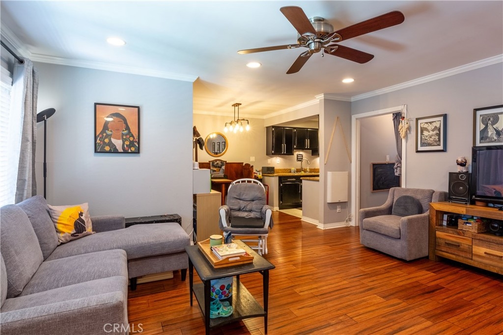 Discover the perfect blend of comfort and style in this beautifully appointed 700 sq. ft. open floor plan one-bedroom, one-bath condo. This inviting space boasts bamboo laminate flooring and elegant crown molding throughout, recessed lighting with dimmers creating a warm and sophisticated ambiance. Step into the spacious bedroom, featuring a large walk-in closet that provides ample storage for all your belongings. Enjoy your morning coffee or unwind after a long day on your private balcony, offering serene mountain views on clear days. The living area is enhanced with ceiling fans for your comfort and custom blinds on the dual-pane windows, ensuring peace, quiet, and excellent insulation. The bathroom is generously sized, providing plenty of room to get ready for your day. The modern kitchen has granite counters and is equipped with stainless steel appliances including microwave and dishwasher that make cooking and cleaning up a pleasure. The seller has thoughtfully replaced the windows and sliding door, adding to the overall efficiency and tranquility of this lovely home. Comes with one parking space in covered garage with storage cabinets above. Come take a look and see how roomy 700 square feet can truly feel. Situated just 2 blocks from all things Bixby Knolls, First Fridays, restaurants, breweries, and craft stores. This condo is more than just a place to live—it's a place to call home.