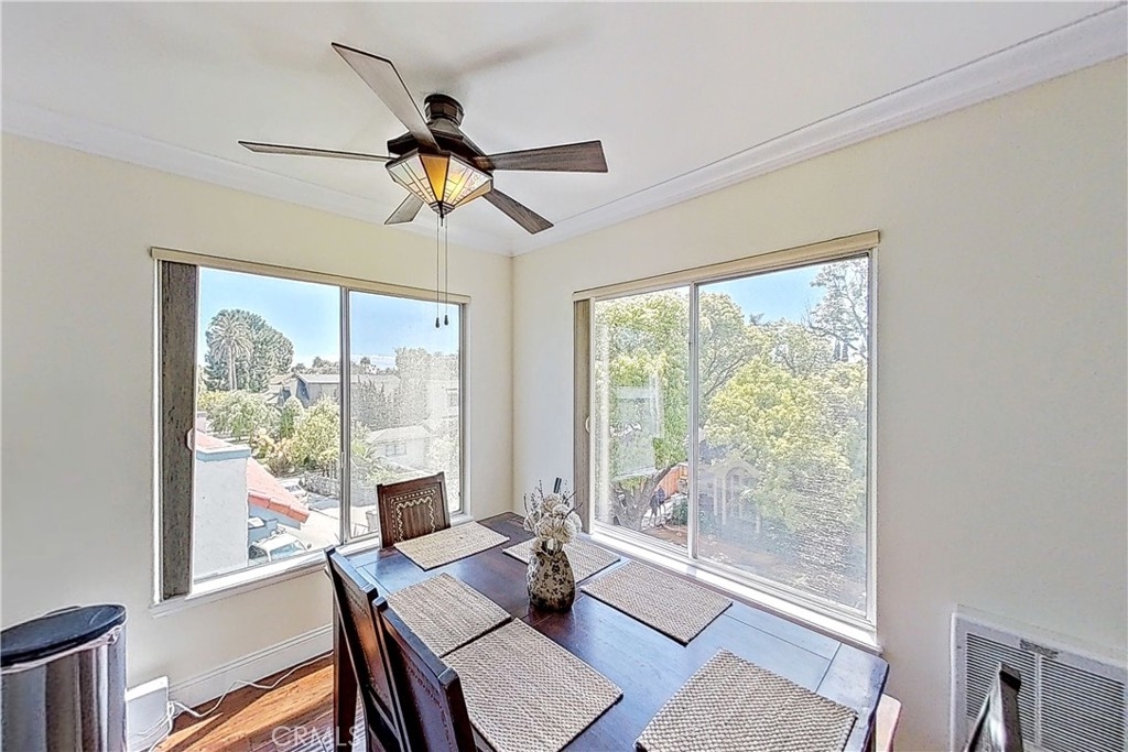 Welcome to one of the most coveted neighborhoods in Long Beach: Quaint and historic Carroll Park. Now, imagine taking in this enchanting community from a unique and tranquil tree-top perspective! Located on the third floor of the building, this bright and spacious 1,168 sq. ft. 2 bedroom, 1 3/4 bathroom condo is caressed in ocean breezes and offers views of the downtown city skyline. The Carroll Park community was created with a distinctive circular layout specifically designed to divert through traffic. As a result, this remarkable neighborhood offers a level of seclusion that surpasses any other historic district in Long Beach. Yet, it’s just 3 blocks to the beach and only 2 blocks to 4th Street’s vibrant “Retro Row” with its dining, movies, and live music. Enjoy outdoor concerts, as well as other community events, held in one of the district’s beautiful landscaped parks. Inside, the well-appointed kitchen offers all stainless steel appliances, including a brand newer induction range, dishwasher, and microwave/convention oven. Custom details include luxurious, wide-plank engineered hardwood floors throughout, gorgeous plantation shutters in both bedrooms, and enormous closets in both of the bedrooms, as well as the hallway. Additional highlights include a roomy outdoor balcony with its lush tree-canopy ambience, a freshly painted interior, 2 DEEDED PARKING! spaces in the secured garage, (spaces 2 and 5), a generous storage locker, low HOA dues of just $300 per month, and finally, the building is pet friendly.