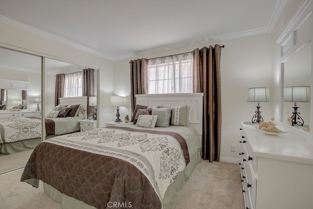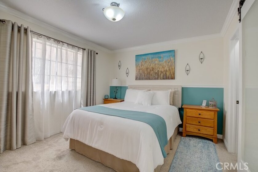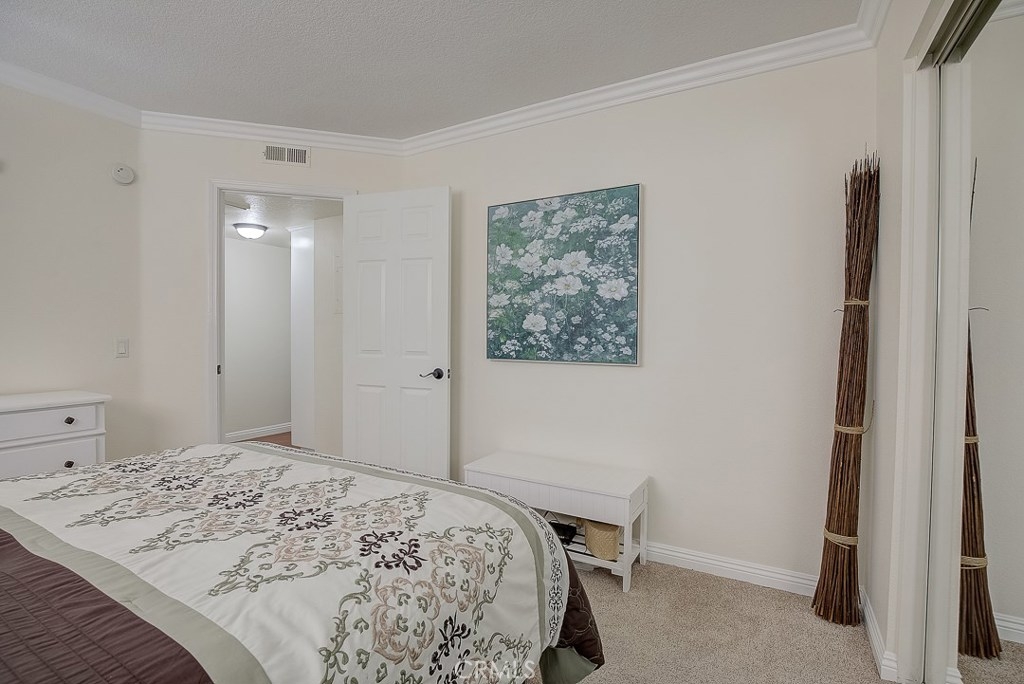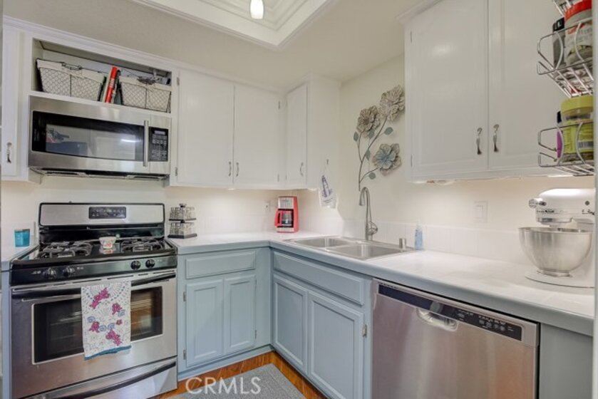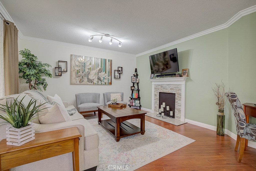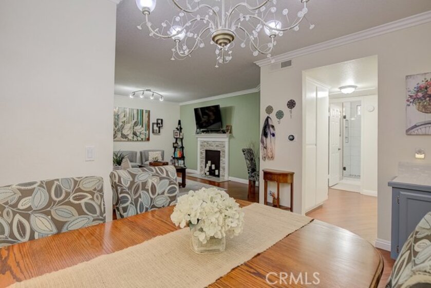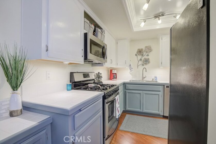 A fully renovated two-bedroom charmer in the Eastside area, this condo is truly turnkey! With beautiful laminate wood floors, central AC, and crown molding throughout, the contemporary colors and custom touches such as the lovely faux fireplace transform this unit into a real home. The kitchen is fresh and bright with painted cabinets, stainless steel appliances, and best of all: washer dryer hookups. The main bedroom has plenty of light and features a walk-in closet and an ensuite, fully updated, bathroom featuring a framed mirror, and tile finishes. The second bedroom is also roomy, features the same soft carpet as the master, and has a long closet. The second bathroom is off the hall and has also been freshly renovated making this a perfect guest room, or ideal for a roommate situation. The complex is conveniently located near shopping, dining, and close to the 405, 605 and 22 freeways. This unit includes two assigned parking spaces in a secure, underground garage and the building amenities comprise a gym, sauna, meeting room, and well-maintained grounds.