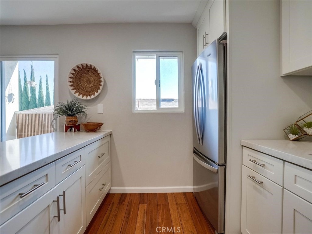 Spacious one bedroom, one bath condo in a distinctive, well-kept, mid-century modern complex. Upgraded throughout, it includes a balcony, wood flooring, and newer paint. The remodeled kitchen has beautiful quartz counters, newer cabinetry, tile backsplash, stainless steel appliances and recessed lighting. The updated bedroom is light and bright, with a dual-paned vinyl window and a larger closet. The bathroom features updated vanity, quartz counter, nicely tiled flooring, and separate tub and shower. Located in a charming section of Bluff Heights, adjacent to Belmont Heights and historic Rose Park, just blocks from the shopping and dining of 2nd Street and the sands of Alamitos Beach. The complex includes a glistening pool, barbecue area, water service and much more! Subterranean parking spot included. This is a perfect starter home!