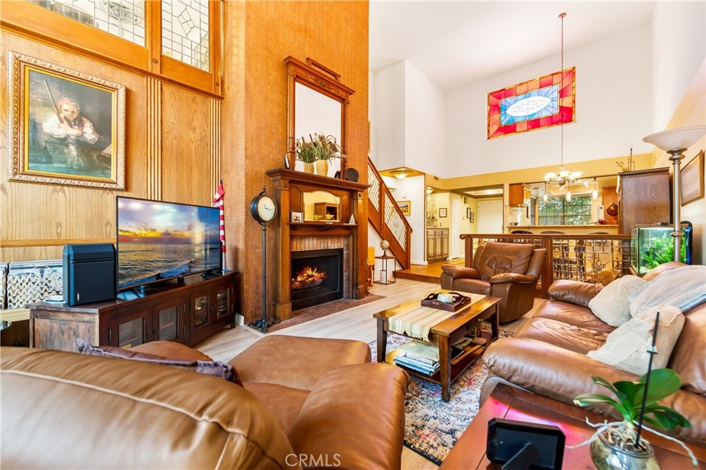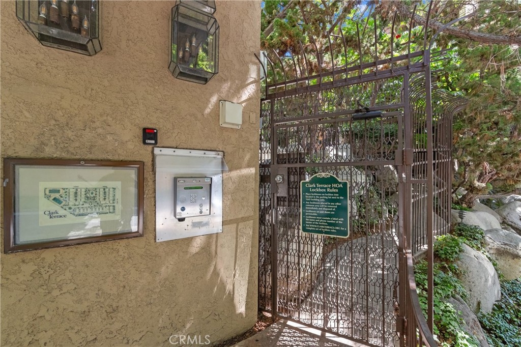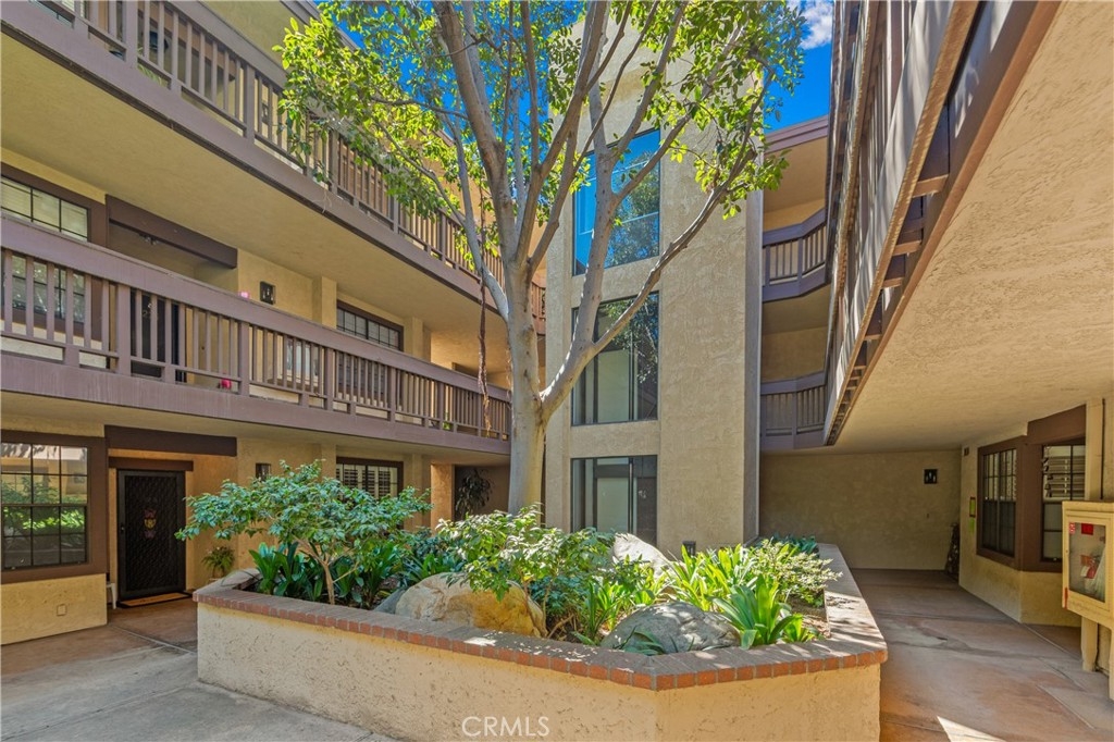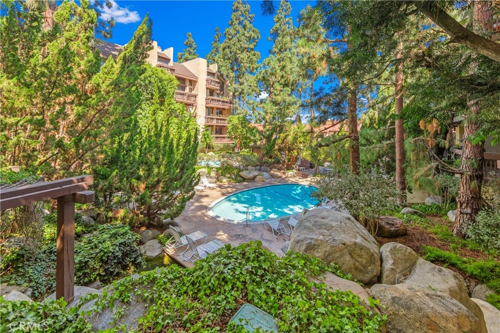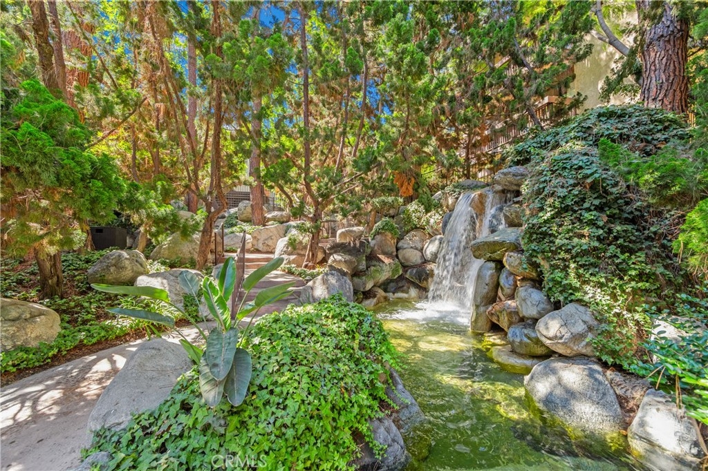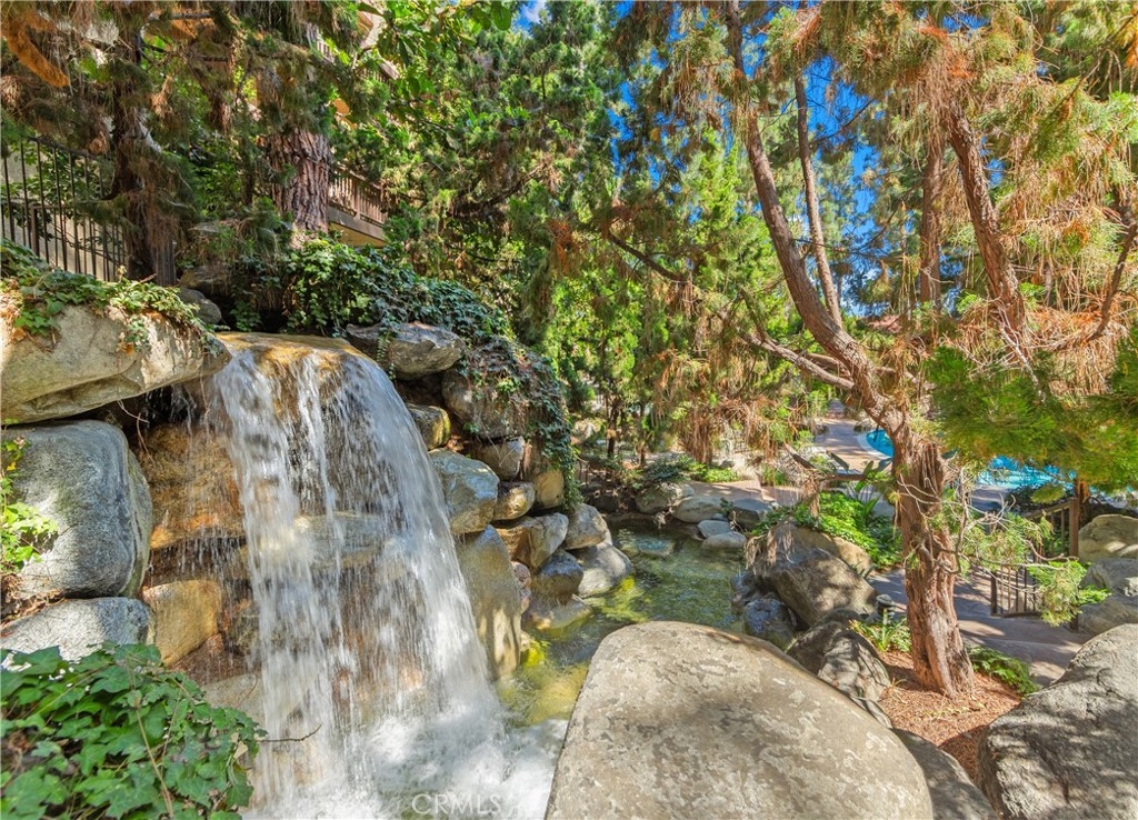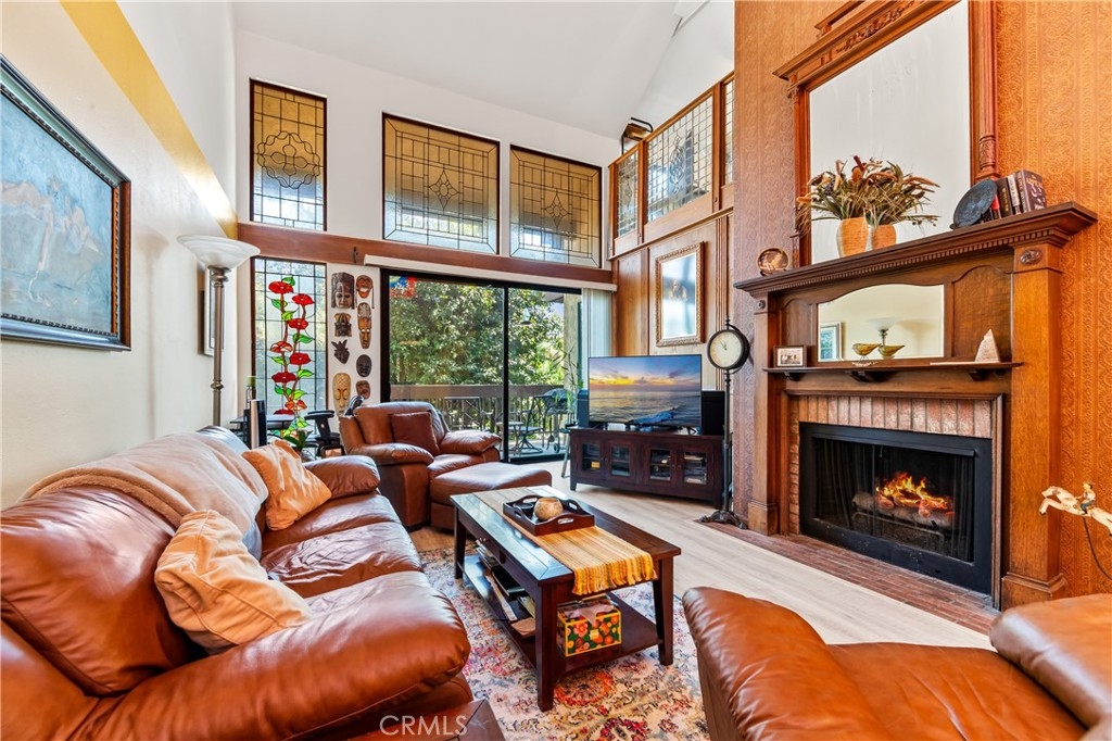 Clark Terrace offers a one-of-a-kind setting with towering pine trees, cascading waterfalls, and lush landscaping that feels like a serene escape in the city. This top-floor condo includes 2 bedrooms, 2 bathrooms, a spacious loft, and two gated parking spaces with an EV outlet. The living room boasts soaring cathedral ceilings, custom stained-glass, wood accents, and a dramatic gas fireplace with an antique mantel. The spacious dining area also features a built-in wet bar with extra storage. Unique architectural details include leaded-glass railing panels along the dining area and staircase, adding light and artistry to the home. The loft overlooks the main living space and extends to its own balcony, creating a treehouse-like retreat; ideal for a home office, creative studio, or lounge. The kitchen is designed with granite counters and rich wood cabinetry. Both bedrooms are generously sized with tin-style ceilings, while the primary suite offers a large walk-in closet and balcony access. Resort-style amenities include a pool, spa, sauna, BBQ area, and tennis courts. Combined with the tranquil setting, this home feels like a getaway while still being close to CSULB, shopping, dining, freeways, and the beach.
