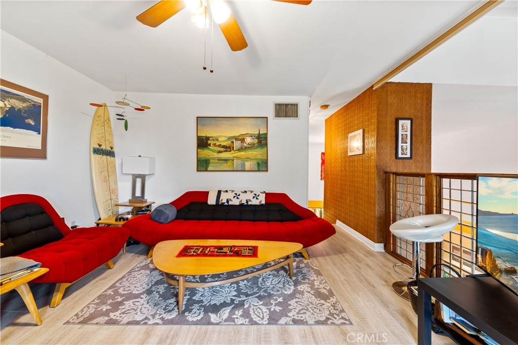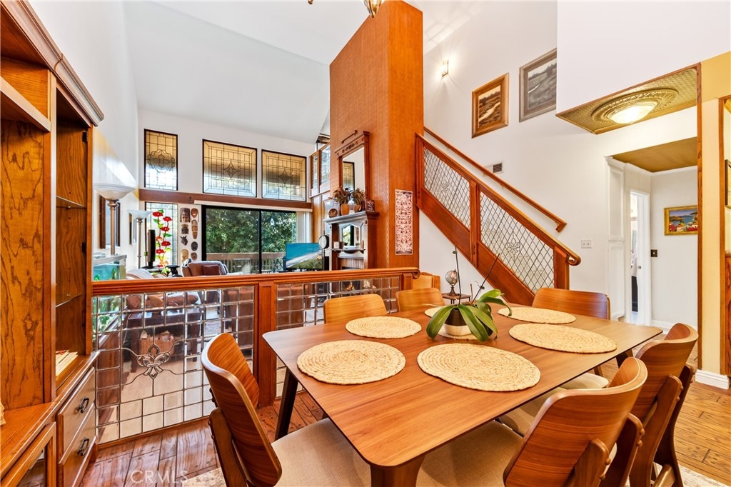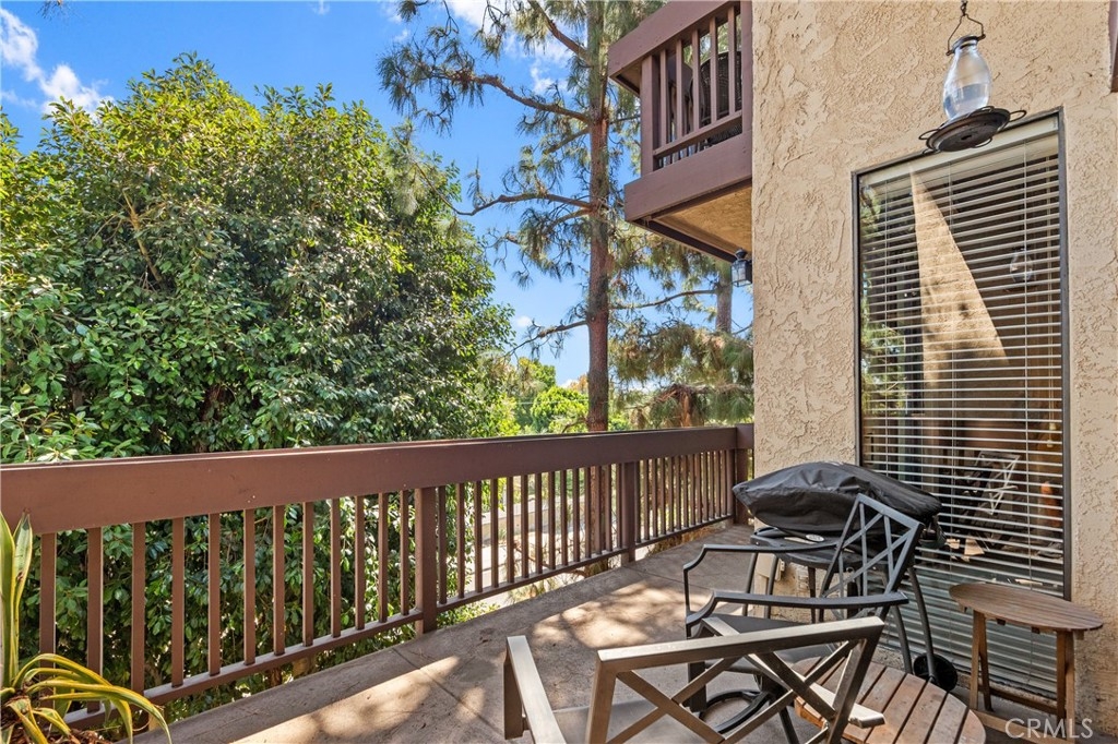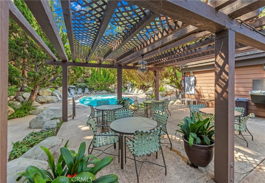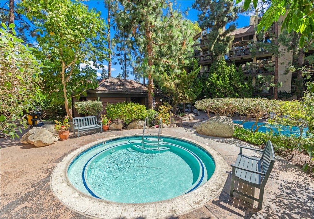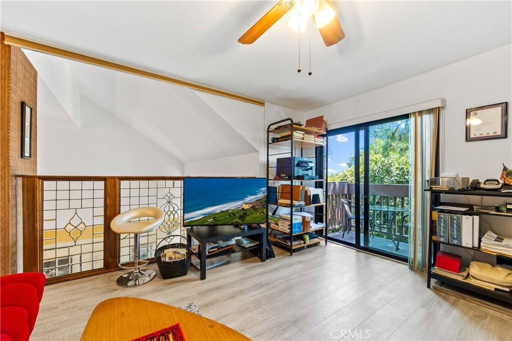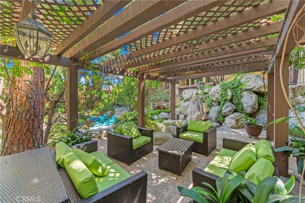 Clark Terrace offers a one-of-a-kind setting with towering pine trees, cascading waterfalls, and lush landscaping that feels like a serene escape in the city. This top-floor condo includes 2 bedrooms, 2 bathrooms, a spacious loft, and two gated parking spaces with an EV outlet. The living room boasts soaring cathedral ceilings, custom stained-glass, wood accents, and a dramatic gas fireplace with an antique mantel. The spacious dining area also features a built-in wet bar with extra storage. Unique architectural details include leaded-glass railing panels along the dining area and staircase, adding light and artistry to the home. The loft overlooks the main living space and extends to its own balcony, creating a treehouse-like retreat; ideal for a home office, creative studio, or lounge. The kitchen is designed with granite counters and rich wood cabinetry. Both bedrooms are generously sized with tin-style ceilings, while the primary suite offers a large walk-in closet and balcony access. Resort-style amenities include a pool, spa, sauna, BBQ area, and tennis courts. Combined with the tranquil setting, this home feels like a getaway while still being close to CSULB, shopping, dining, freeways, and the beach.