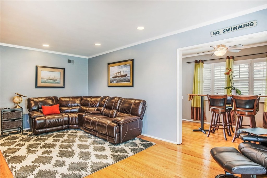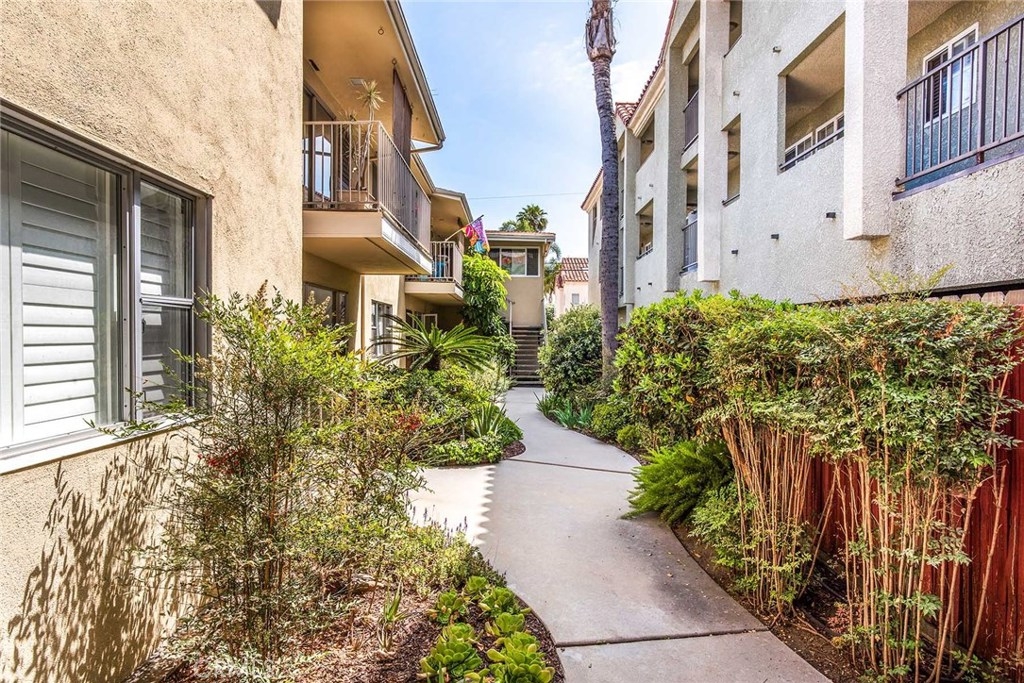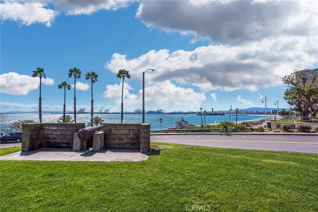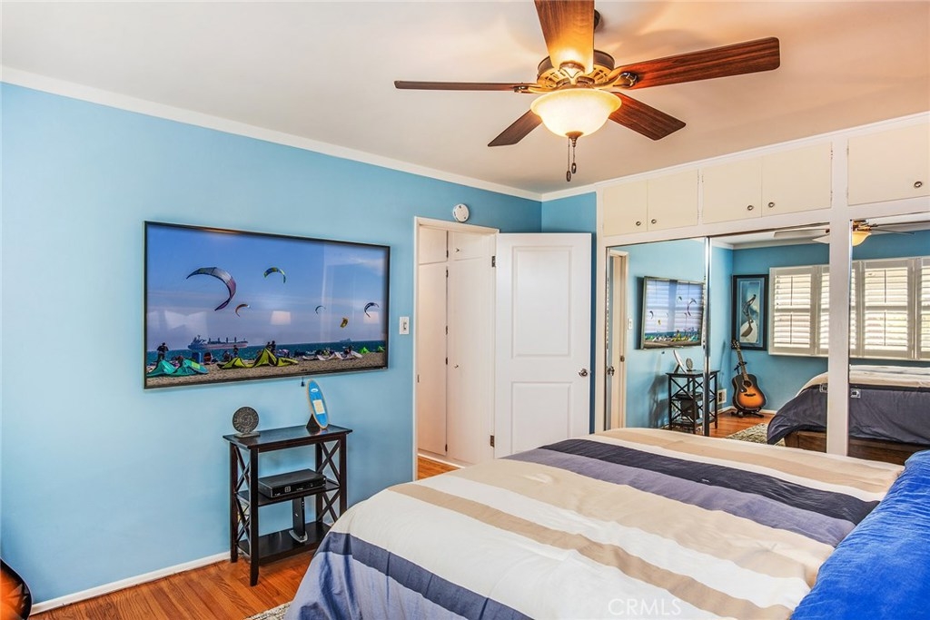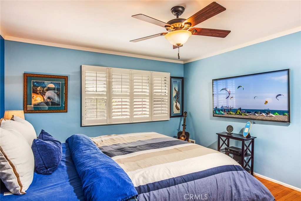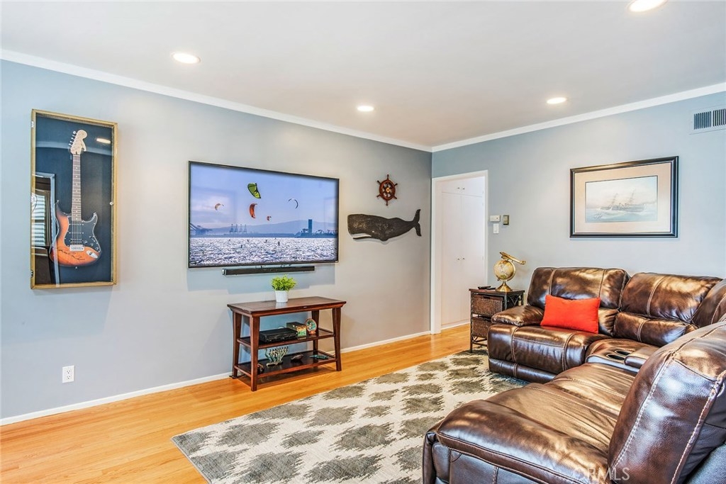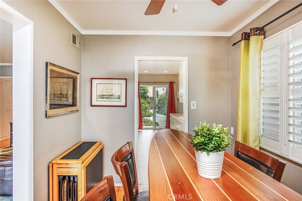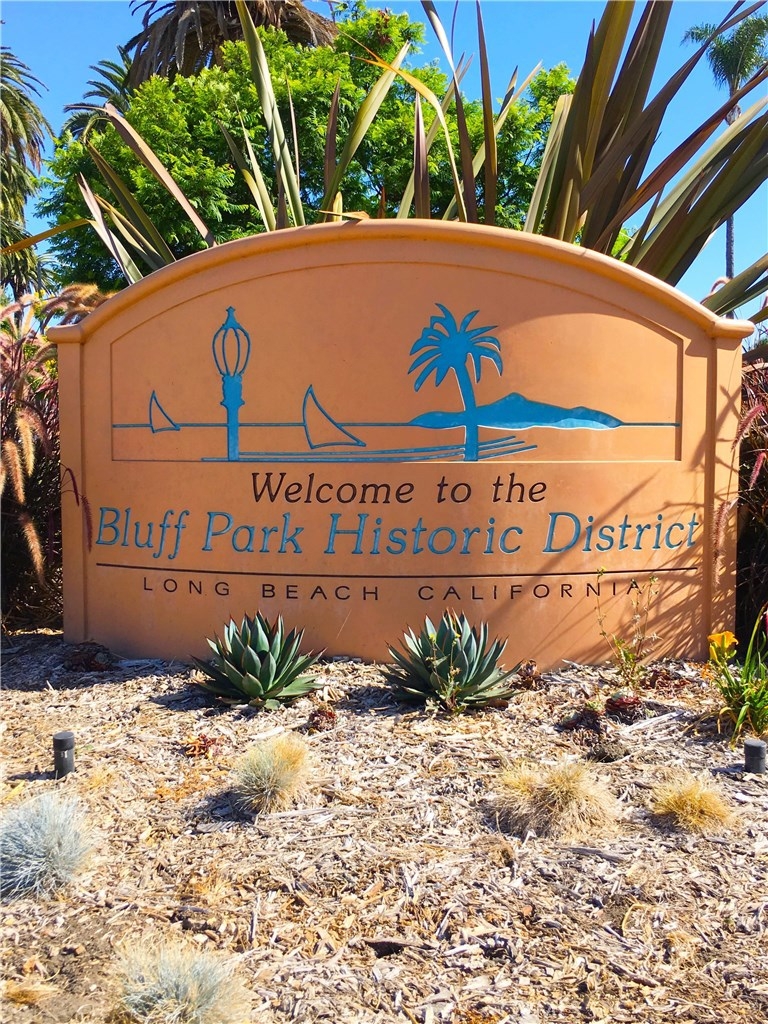 GORGEOUS AND ONLY 1 BLOCK TO THE PACIFIC OCEAN! A large window frames a picturesque view of the Bluff Park Historic neighborhood! While enjoying the view from the broad living room, you'll also take pleasure with the numerous upgrades such as DUAL PANE WINDOWS, PLANTATION SHUTTERS, RECESSED LIGHTING, CROWN MOLDING AND GLEAMING WOOD FLOORS extending into the bedroom and dining room! Host dinner parties in the spacious and elegant dining room that includes a HUNTER DOUGLAS CEILING FAN & upgraded window treatments! The sun filled kitchen boasts refinished white cabinets, newer vinyl flooring, white appliances, recessed lighting, room for a desk or table and convenient sliding doors that access the lush community courtyard! The upgrades continue in the enormous master bedroom with plantation shutters, ceiling fan and CUSTOM BUILT CLOSETS with mirrored wardrobe doors! Your serene bathroom maintains the original charm with mid century tiles and refinished cabinets. A PRIVATE ONE CAR GARAGE with abundant storage space is included! TWO FRIENDLY PETS ARE WELCOME! Crown Imperial boasts convenient on-site laundry and LOW HOA DUES! It's about LOCATION & LIFESTYLE! Yoga at the beach, Farmers market at Bixby park, a run on the bluff, a bike ride along the strand, fine dining in Belmont Shore, exciting nightlife in Downtown LB, fun at the new dog park or a stroll through Bluff Park's million dollar homes! This UPGRADED CORNER UNIT IS ALL ABOUT LOCATION, LOCATION, LOCATION! BEACH LIFE!