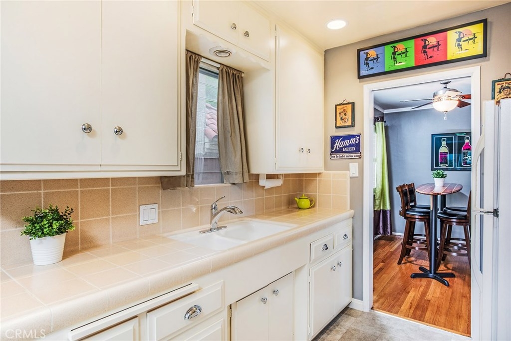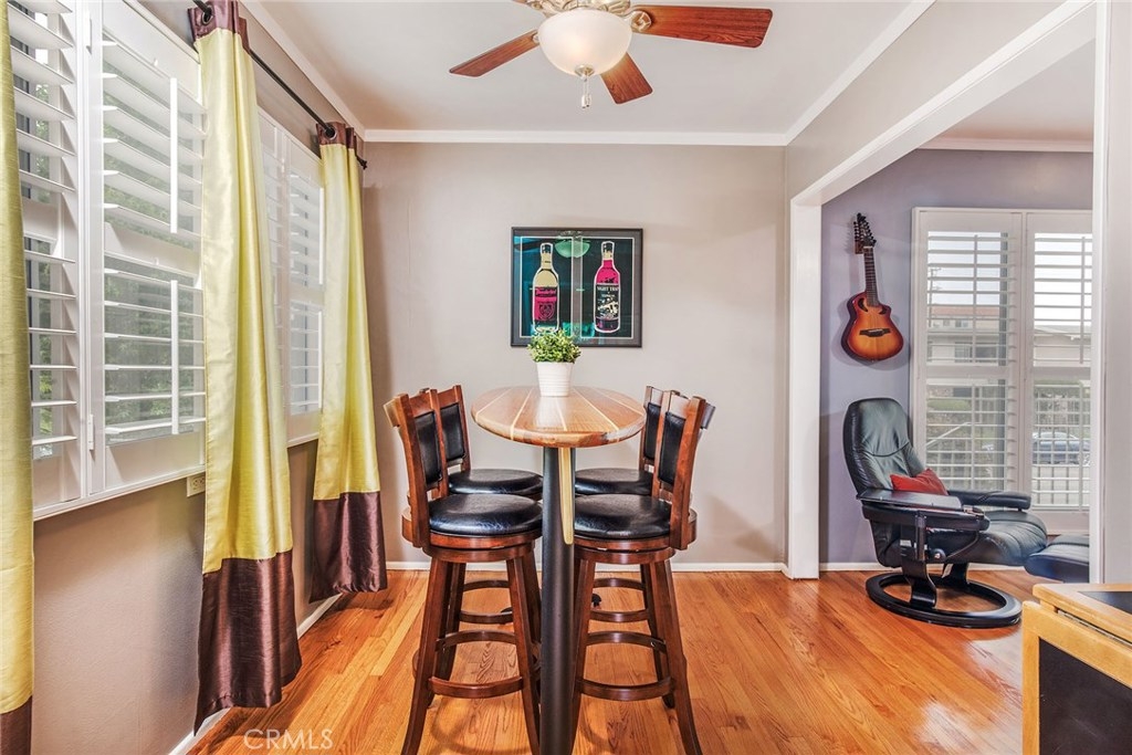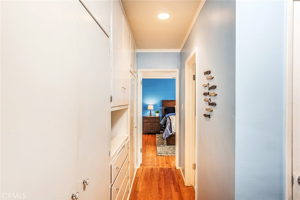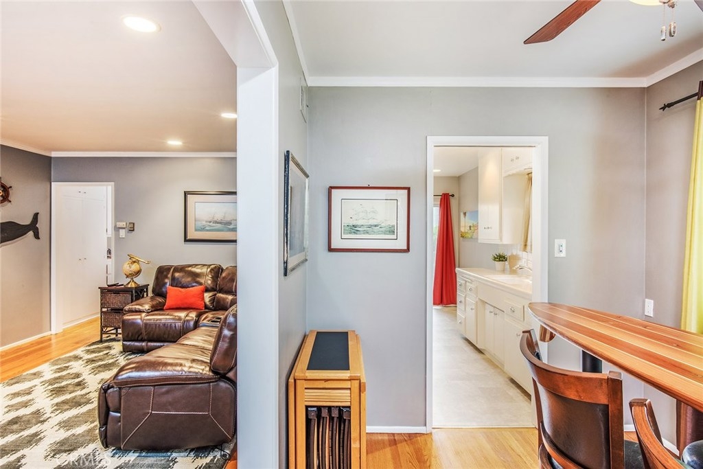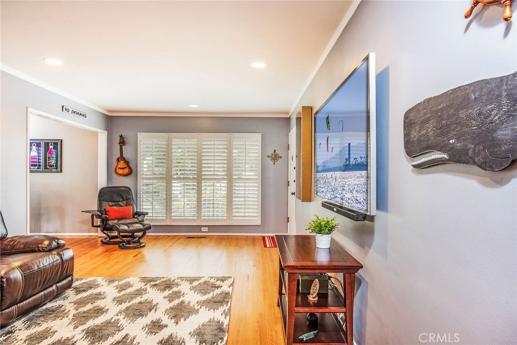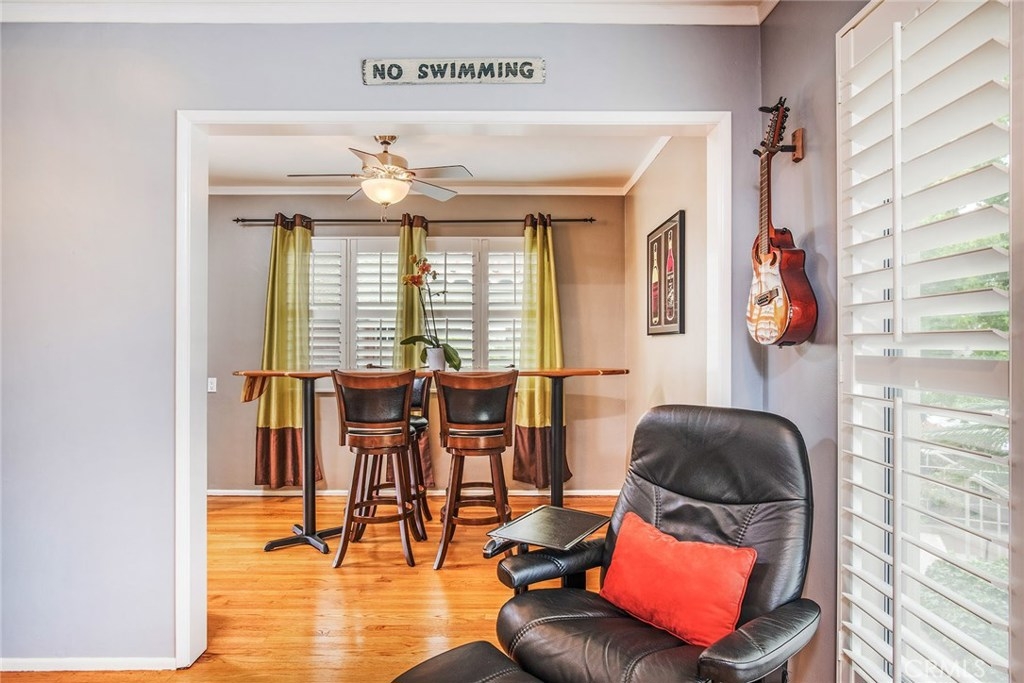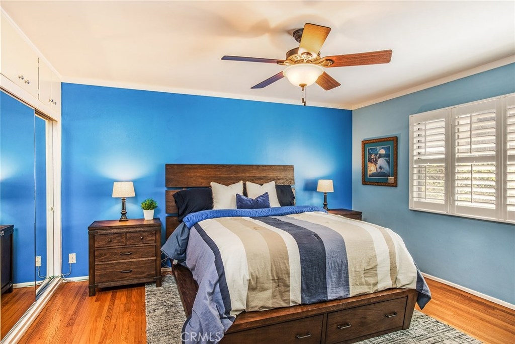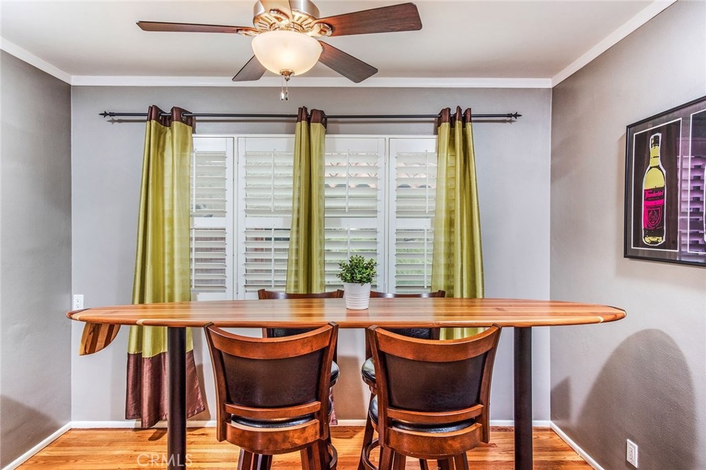 GORGEOUS AND ONLY 1 BLOCK TO THE PACIFIC OCEAN! A large window frames a picturesque view of the Bluff Park Historic neighborhood! While enjoying the view from the broad living room, you'll also take pleasure with the numerous upgrades such as DUAL PANE WINDOWS, PLANTATION SHUTTERS, RECESSED LIGHTING, CROWN MOLDING AND GLEAMING WOOD FLOORS extending into the bedroom and dining room! Host dinner parties in the spacious and elegant dining room that includes a HUNTER DOUGLAS CEILING FAN & upgraded window treatments! The sun filled kitchen boasts refinished white cabinets, newer vinyl flooring, white appliances, recessed lighting, room for a desk or table and convenient sliding doors that access the lush community courtyard! The upgrades continue in the enormous master bedroom with plantation shutters, ceiling fan and CUSTOM BUILT CLOSETS with mirrored wardrobe doors! Your serene bathroom maintains the original charm with mid century tiles and refinished cabinets. A PRIVATE ONE CAR GARAGE with abundant storage space is included! TWO FRIENDLY PETS ARE WELCOME! Crown Imperial boasts convenient on-site laundry and LOW HOA DUES! It's about LOCATION & LIFESTYLE! Yoga at the beach, Farmers market at Bixby park, a run on the bluff, a bike ride along the strand, fine dining in Belmont Shore, exciting nightlife in Downtown LB, fun at the new dog park or a stroll through Bluff Park's million dollar homes! This UPGRADED CORNER UNIT IS ALL ABOUT LOCATION, LOCATION, LOCATION! BEACH LIFE!