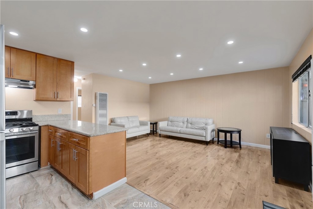 Clean and upgraded first-floor condo within the highly sought after El Capitan community in Long Beach! This condo features 2 spacious bedrooms and 1 remodeled bathroom with tile and laminate wood floors throughout. The kitchen has upgraded granite countertops, newer cabinetry, newer gas range and garbage disposal, and refrigerator is included. Open floor plan connects kitchen, spacious living room, and dining area, all with recessed lighting. The roomy primary bedroom features a large walk-in closet. Secondary bedroom has sliding mirrored closet doors. Bathroom has updated tile shower/tub combo and light fixtures. This unit has a small outdoor front patio area and one assigned covered parking spot. HOA dues include water and trash, common area maintenance, secure gated community entry, association pool & BBQ area, and access to community laundry within the complex. This is the perfect condo for a first-time home buyer or investment property. Complex is FHA approved. Conveniently located close to public transit, shopping centers and major freeways. Don't miss this great opportunity!