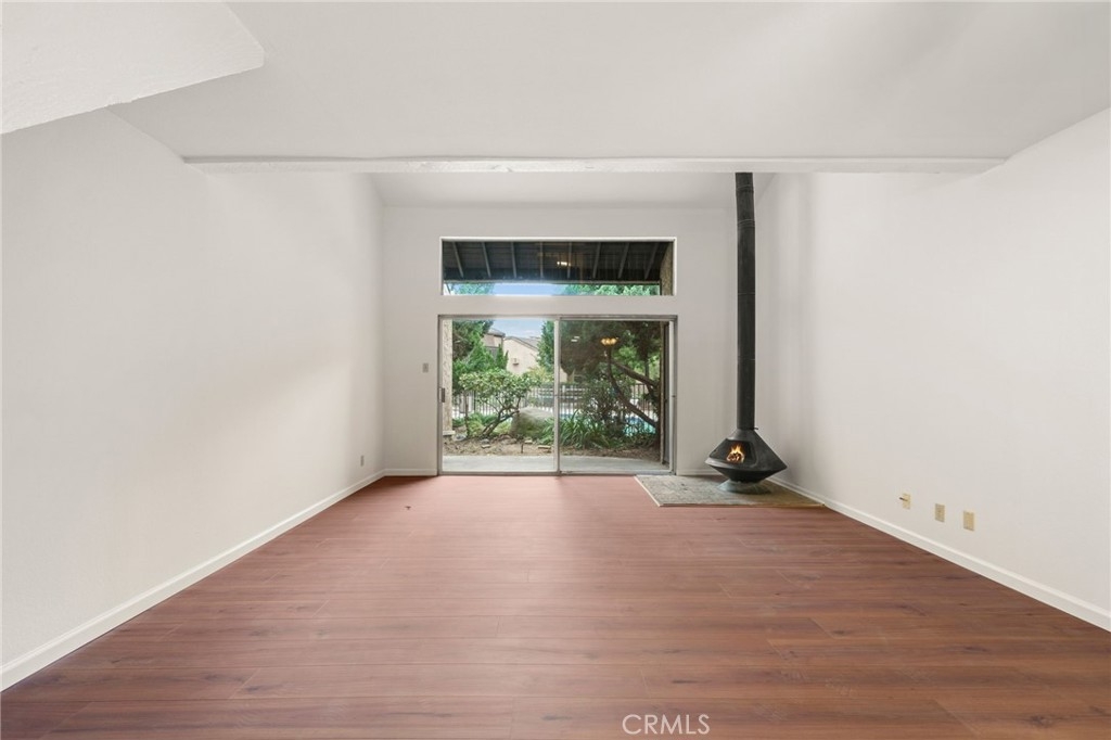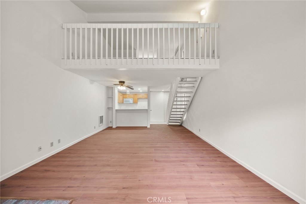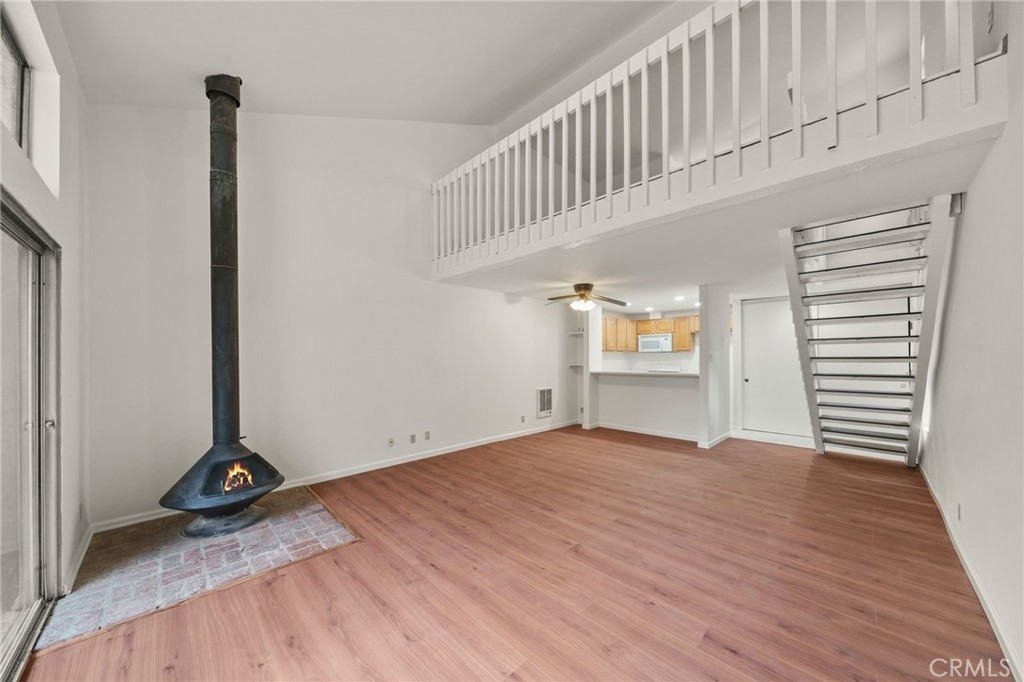 This is a lovely 1-bedroom, 1-bath loft-style condo offering 745 sq. ft. of modern living in the beautifully maintained El Dorado Lakes community. Step inside to new flooring, fresh paint and newly scrapped ceilings. An open-concept design featuring high ceilings and a unique wood-burning fireplace. The living and dining areas flow seamlessly into a functional kitchen with light colored cabinets, recessed lighting, and a breakfast bar for casual dining. A large sliding glass door leads the way to your private patio, where you can relax while taking in the pool and lush surroundings. The upstairs loft bedroom boasts a spacious en-suite bathroom and a walk-in closet, and fresh paint for a clean, modern feel. Positioned on 13+ acres of picturesque grounds with lakes, streams, and vibrant wildlife, this pet-friendly community offers incredible amenities, including 2 tennis courts, 2 pools & spas, clubhouse & ping-pong tables, game room, and workout room. This unit has a private two car garage located a few steps from the unit and an on-site laundry room, plus easy access to local attractions. Walk to El Dorado Park, featuring a dog park, nature center, golf course, and a lake, along with convenient freeway access this is amazing location and home.