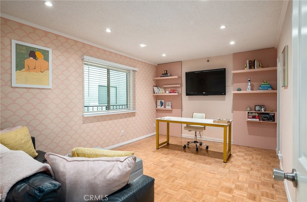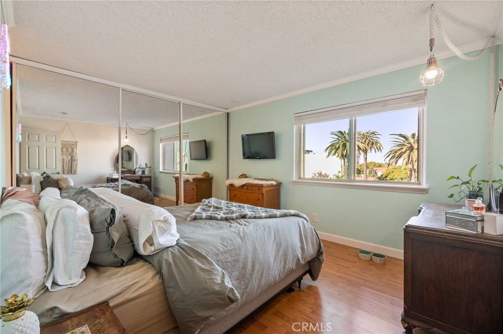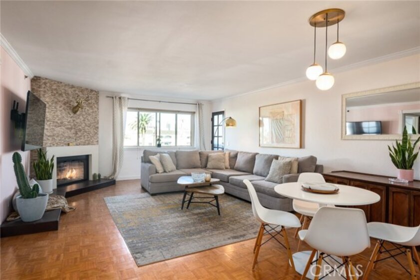 Minutes to the beach and steps to downtown. Third floor with a panoramic window view of the city in the living room, wood flooring, and a stone tiled fireplace. The kitchen features farm house sink, all stainless steel appliances, microwave, refrigerator, stove, and dishwasher. The first bedroom also has parquet wood flooring a door leading to the first bathroom. The first bathroom has a modern sink, faucet, toilet, and a walk-in shower with a rainfall shower head. The master bedroom features a floor to ceiling mirrored closet doors, a top up bottom down window shade, ample room and private full bath. Ceramic flooring covers the entry way, kitchen, and bathrooms. New air conditioning system installed just 5 months ago. The entry way has an enclosed closet with a washer and dryer. Private parking stall and storage can be found on the first floor. The perfect home for entertaining and relaxing. Live the LBC life!
