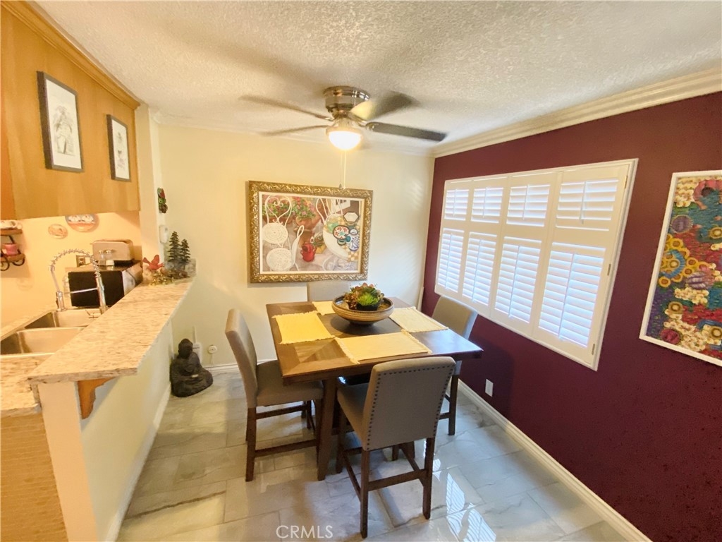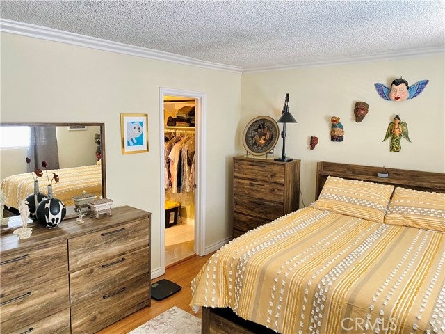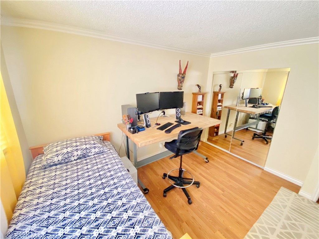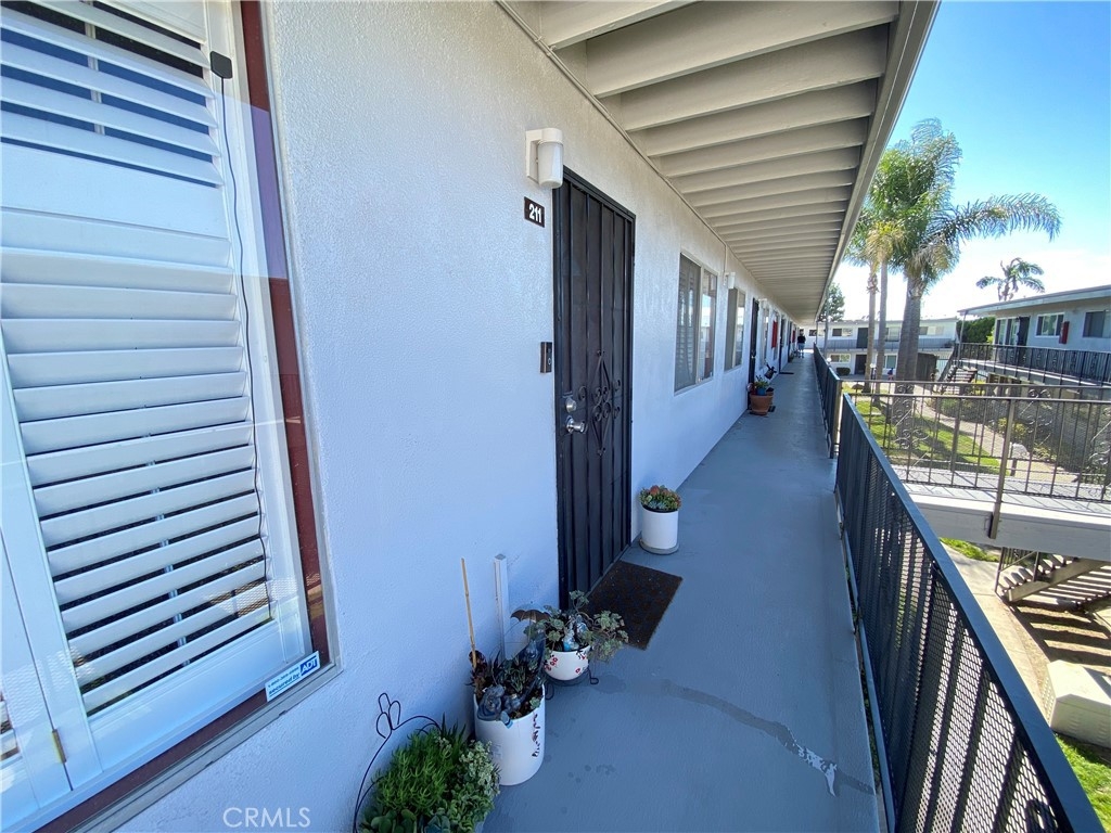 Besides the great weather and the many attractions Long Beach has to offer, this second-floor end-unit with TWO (2) parking spaces is sure to delight. Enter the unit into an open-floor plan that includes a spacious living room, dining room with an accented merlot wall flanked by giant windows with white plantation shutters, anchored by the crisp, white crown moulding, and the kitchen. The unit will be sold with the gently used cream-colored couches, accent pillows and the four-chair dining room table seen in the photos. Above the dining room table is a rubbed bronze fan with light that will keep those summer days cooler. The entire 876 square foot unit features various wood laminate and ceramic tile floors for easy clean-up. The modest kitchen features granite countertops, a subway tile backsplash and a cabinet end-panel. There is plenty of storage and the kitchen comes equipped with an electric stove and a stainless steel accented refrigerator and dishwasher that will also be included with the sale. The restroom offers an antique looking vanity with a custom tile/glass backsplash and a white subway tile tub enclosure. The spacious master bedroom has a large walk-in closet accessible from the bathroom as well. The closet is large enough to be used as a dressing room and includes custom storage. You will enjoy mirrored closets in the hallway and the second bedroom with floor-to-ceiling linen closets. The second bedroom (or office) also comes with a gently used matching twin bed and dresser. The unit comes with TWO (2) parking spaces. One is covered under a carport and the other is uncovered visible from the second bedroom's window. Community amenities include security gates only accessible with a fob, well-manicured landscaping, and an on-site laundry room adjacent to a large sparkling pool. The complex is located 20 minutes north of Downtown Long Beach and its many attractions including many beaches, parks, and bike riding paths, The Queen Mary, Aquarium of the Pacific, Long Beach Airport, and the Port of Long Beach, the gateway to Catalina Island.