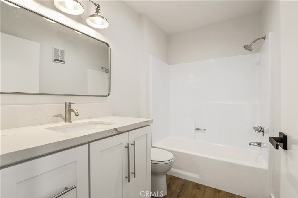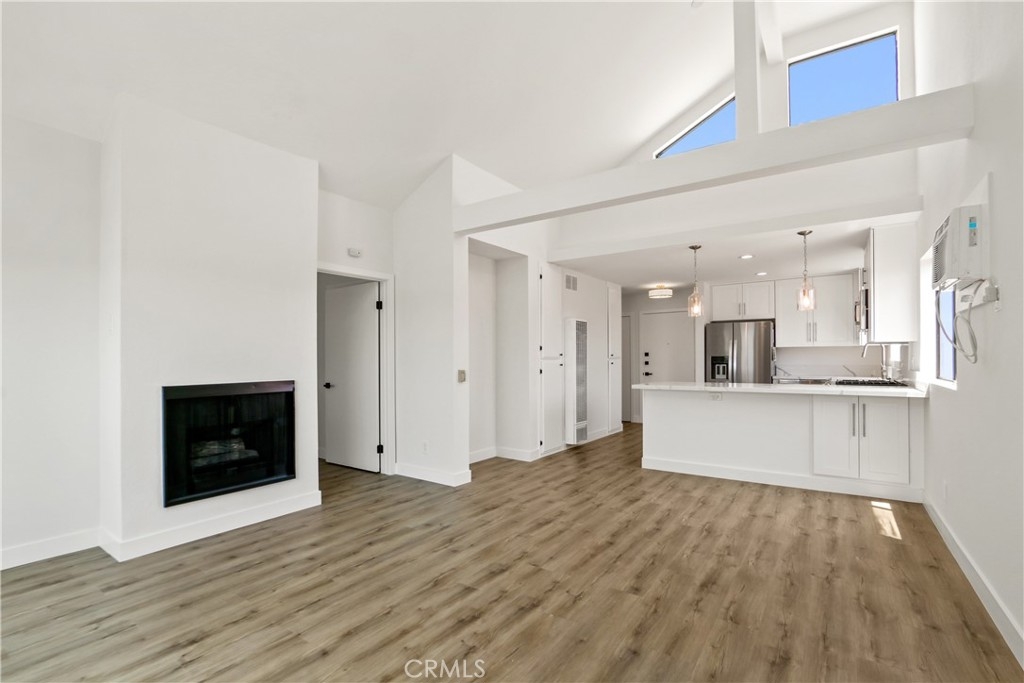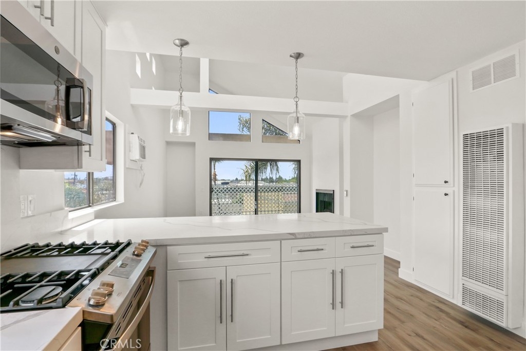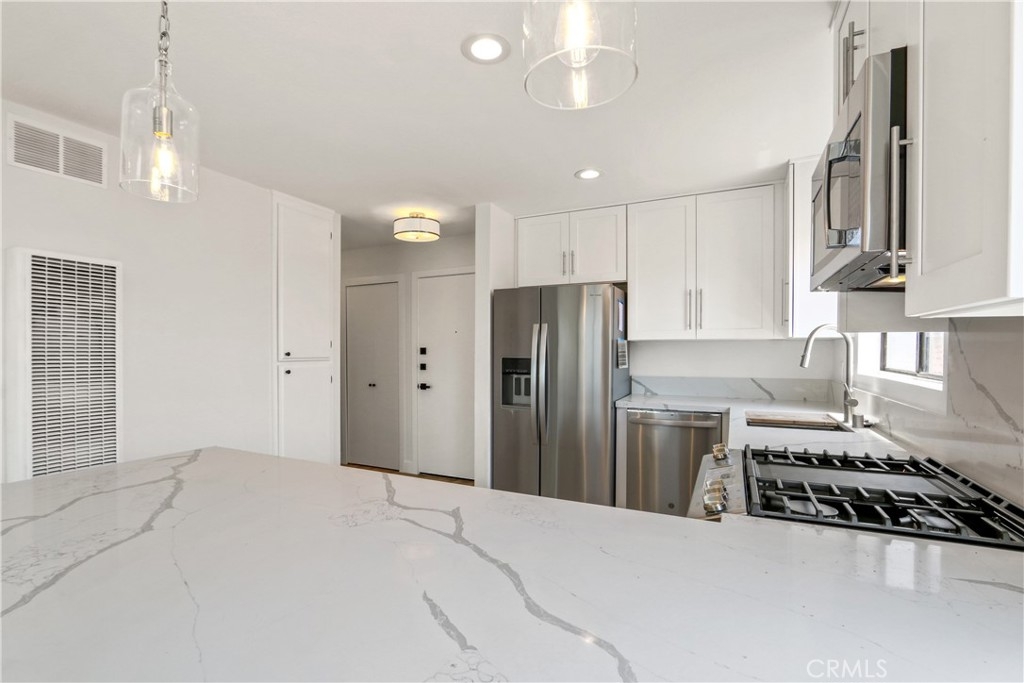 Absolutely beautiful newly remodeled 3 bedroom, 2 bath top floor end unit condo. You are going to love the open and modern kitchen with new white Shaker cabinets, elegant quartz counters, breakfast bar, new stainless steel appliances, new lighting, and new fixtures. The living room features high vaulted ceilings, gas fireplace, and leads to the large patio. Large primary bedroom with walk-in closet, ensuite bathroom, and patio. Both bathrooms have been beautifully remodeled with new vanities, quartz counters, and new lighting and fixtures. Gorgeous new luxury vinyl tile flooring, new paint, new baseboard, and new lighting. 2 car parking. Inside washer / dryer hookups.