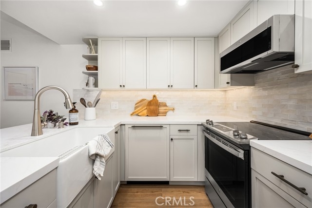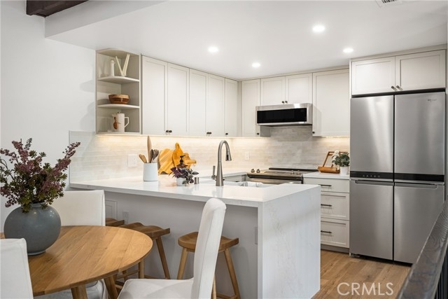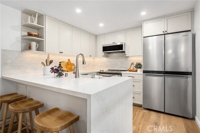 If you've been seeking a top floor, end-unit 1-bedroom model with vaulted ceilings at Marina Pacifica, you've got to come see Unit 7309. Located in Key 11, this fully-remodeled condo is conveniently located just off the front elevator and enjoys views of the Marina, pool, and peek-a-boo views of Mother's Beach. Previously occupied by the same family for nearly 50 years, this home has been completely transformed for modern living. The custom-built kitchen features solid antiqued brass hardware, under-cabinet lighting, all new appliances, and quartz waterfall countertop with seating (in addition to the dining area). The newly constructed bathroom has a walk-in shower with frameless sliding glass door and non-slip floor tiles throughout. Delta plumbing fixtures, designer lighting from Lightopia, and waterproof vinyl plank flooring were installed throughout the home. As for the less-sexy but more important upgrades - new HVAC units, new water heater, new water shut-off valves, electrical outlets, switches and recessed lighting were all added within the past year. The unit includes one parking space (#1108) very close to the Key 11 elevator so walking from your car to your home is a breeze. As for the neighborhood, Marina Pacifica HOA has abundant guest parking within the 24-hour guard-gated community. Amenities include 6 pools and spas, 3 lagoons, a clubhouse, and acres of lush landscaping surrounding beautiful walking paths, as well as on-site property management, security guards, and maintenance teams. All this is offered within walking distance to 2nd & PCH, the Marina Pacifica shopping center, Naples Island, and Belmont Shore. Living at Marina Pacifica is all about the resort lifestyle, with everything you need for food, entertainment, and fitness at your fingertips. Come visit to truly experience it. ***Agents: See Supplements for List of Property Upgrades and Features***