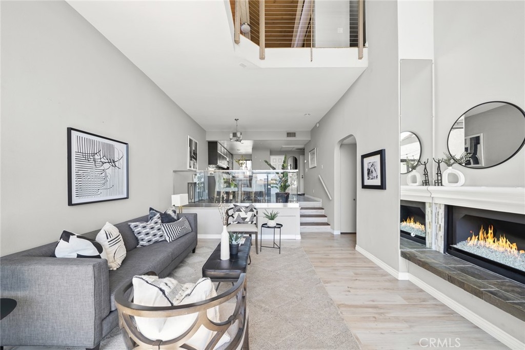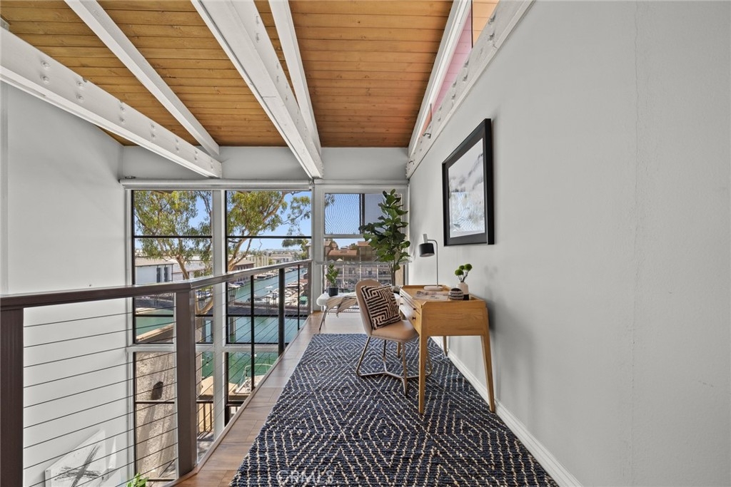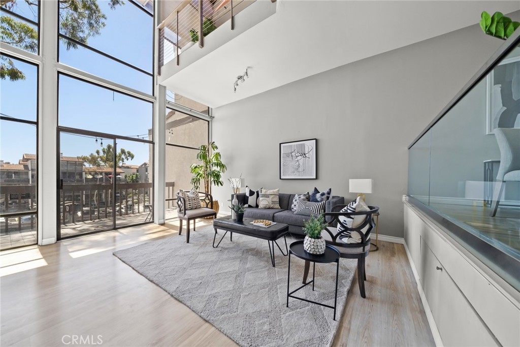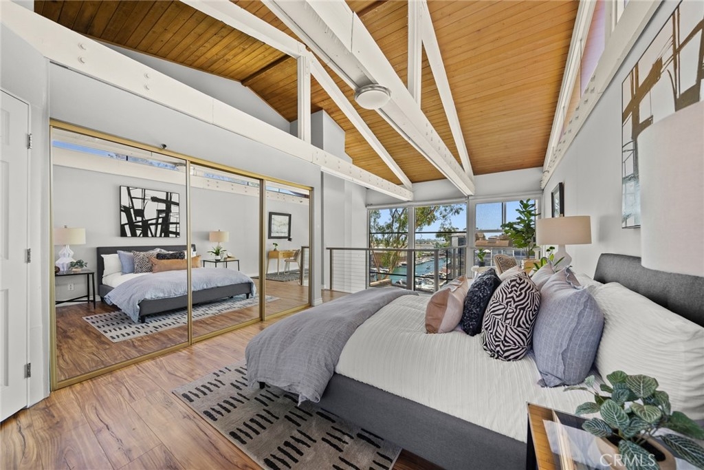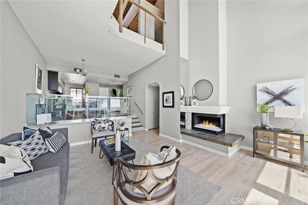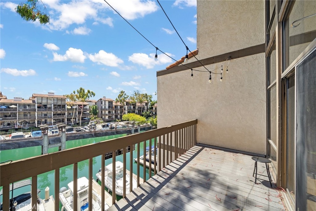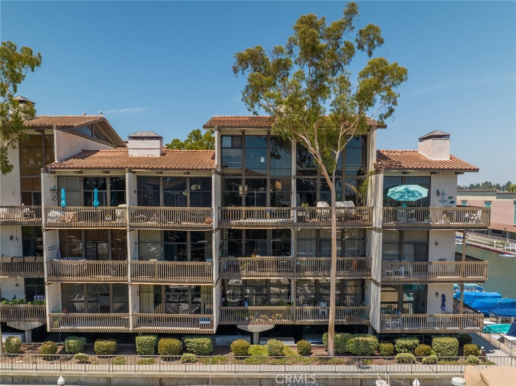 Welcome to this unique, top floor industrial modern loft in the desirable Key 11 of the Marina Pacifica Complex. Walk amongst the trees as you enter this 3rd floor unit just a short walk from the elevator. Enter the front door into a relaxing open floor plan. The newly remodeled kitchen stares out a floor to ceiling glass wall that frames the impressive view of the water way. The dining area is versatile and can accommodate bar stools and or a formal dining area. Step down into the living room and enjoy the fireplace and balcony. Upstairs in the loft space, the primary bedroom suite has its own bathroom with walk in shower, closet and tiny balcony. Large exposed beams cut through the cathedral ceiling space showing off its architectural design. This unit comes with 2 parking spaces and is conveniently located just a short distance to the pedestrian bridge that connects the complex to a wide array of shopping, restaurants & entertainment.