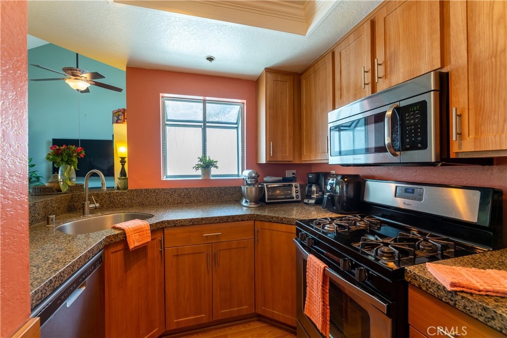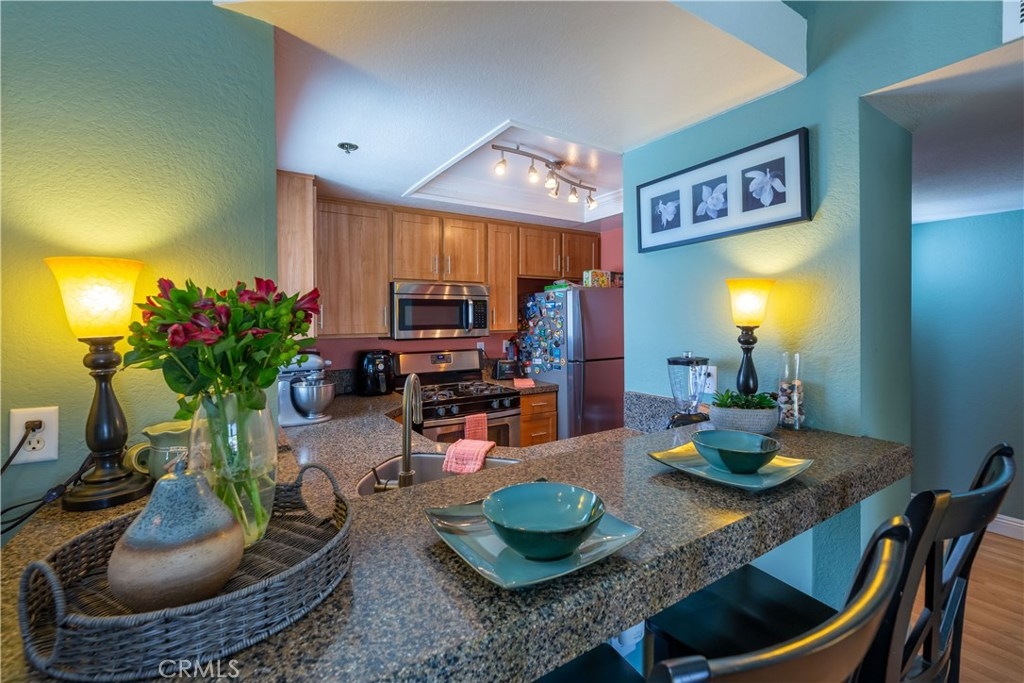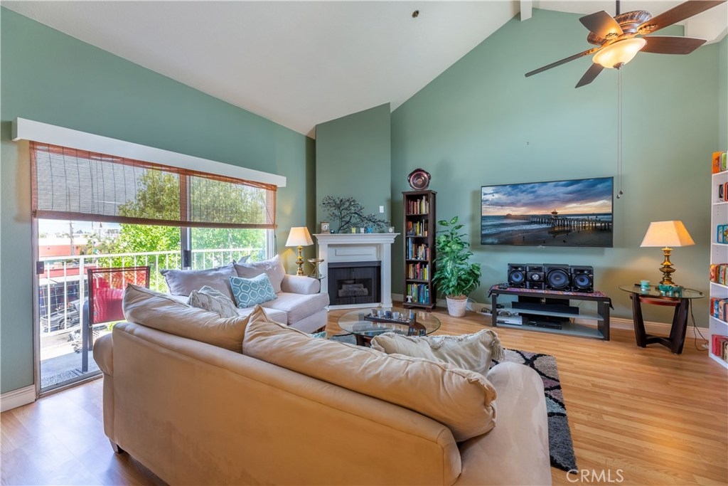 Welcome to this Mystic Cove top floor corner bright & airy 2 bedroom, 2 bathroom condo w/ soaring cathedral ceiling in the living room & master. Two spacious bedrooms w/ plenty of large wall to wall closets. Gorgeous remodeled kitchen w/ granite counters, shaker style cabinets, dishwasher, fridge & range. Kitchen is open to the living room with an eat-at counter. Lighter colored bamboo style laminate flooring throughout. Ceiling fans and lots of windows! Spacious Master bedroom w/ a cozy window seat to enjoy those sunsets. From the master there is a private door leading out to your cozy balcony to enjoy BBQ & drinks amongst the tall trees. Stylish & completely remodeled bathrooms w/ custom tile, floors, vanities & lighting! Enjoy the sunny living room that also boasts a gas fireplace, plus a sliding door leading to the balcony. Comfort year round w/ HVAC. This top floor unit also comes with a subterranean parking space, which includes a storage area. There is also a lovely pool and spa, newly upgraded work out room and open corridors on each floor. This complex is pet friendly, rules apply. The community is currently undergoing a roof installation and also some woodwork. HOA fees includes water, trash, maintenance and pest control. Nearby shopping, eateries, parks and more!