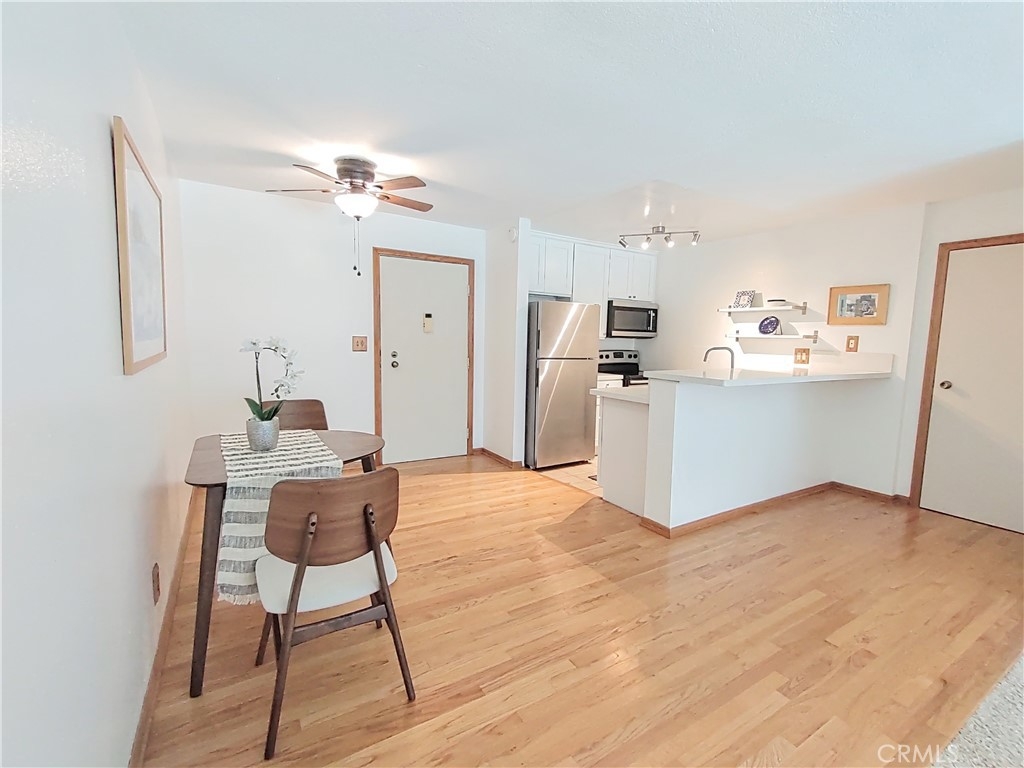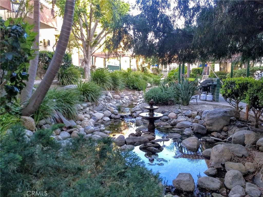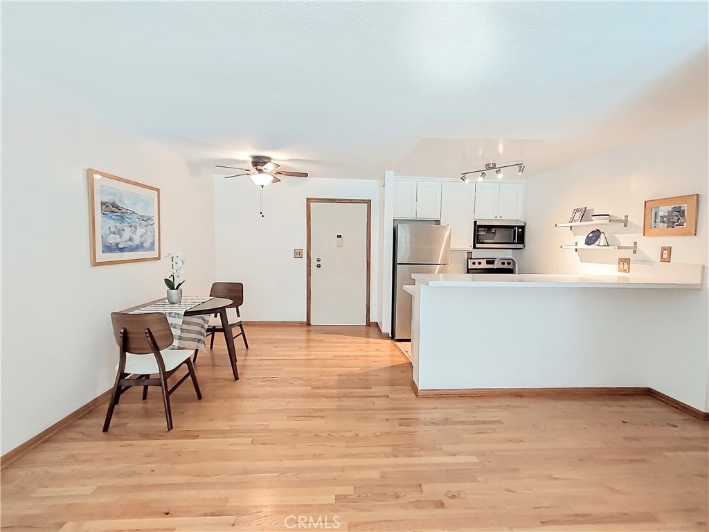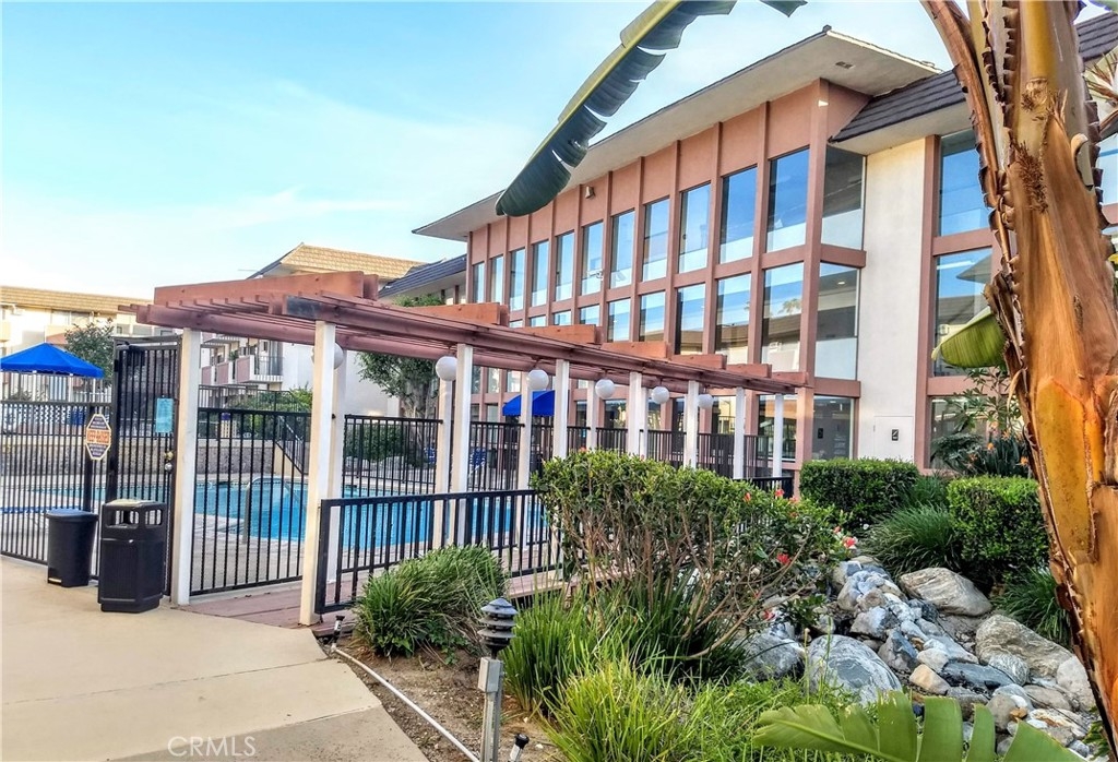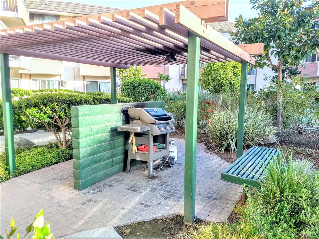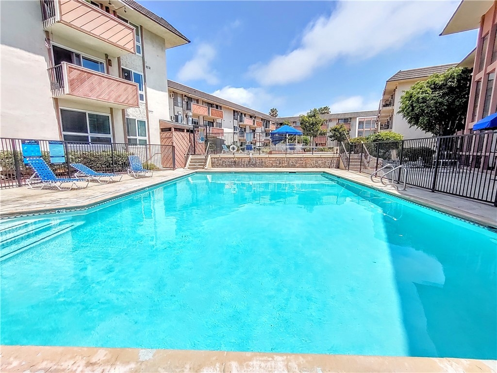 Remodeled kitchen with white quartz countertop, stainless steel sink. Eat at counter. Spotlight ceiling light. Dining area has a ceiling fan and nice wood flooring. Soothing blues of the pool through the large main living room window (replaced with double pane). The bedroom is roomy and has a view of the pool Mirrow wardrobe closet doors. Updated sink counter. Tile flooring. This is a ground level unit which is close to the rear access gate and just round the corner from the Spa and pool. Easy access to the patio area and the community BBQ. Great parking space located at the west side of the building in the gated covered parking garage. Community laundry. Close to the beach, bike trails, CSULB, restaurants. Must see.