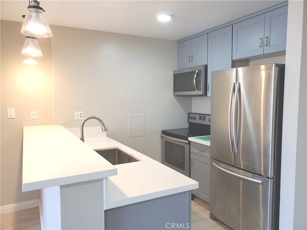 Beautiful security gated garden complex. Move-in condition with upgraded Kitchen and bathroom with quartz counter top and modern cabinet. Laminate floor in spacious living room and bedroom. Tile floor in bathroom and bathtub wall. Newer stainless kitchen appliances. Open floor plan bright and airy. Radian heather in bedroom and new wall heater in Living Room. Balcony with beautiful View to courtyard. End unit with only one common wall with neighbor. Near Laundry Room and Elevator without any noise. One carport parking with storage. Enjoy Association amenities: Beautiful leisurely garden with stream water pond, swimming pool/Spa, BBQ area, gym with many trade mills , sauna, and tennis court. Comfortable Lobby. This is a great opportunity to own a great condo. Close to Cal State Long Beach.