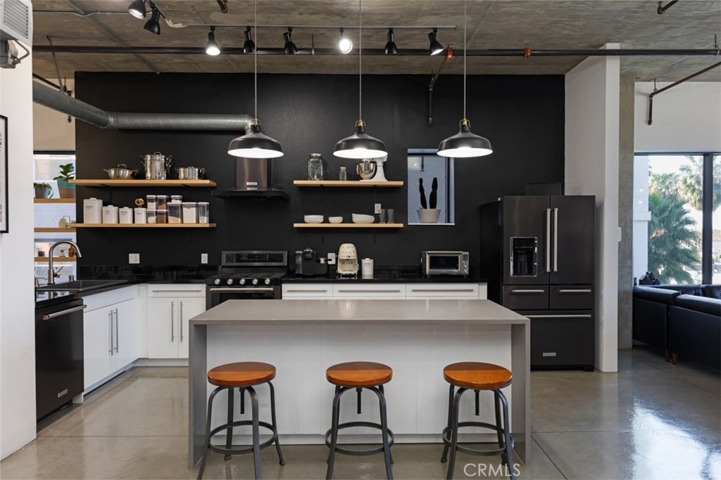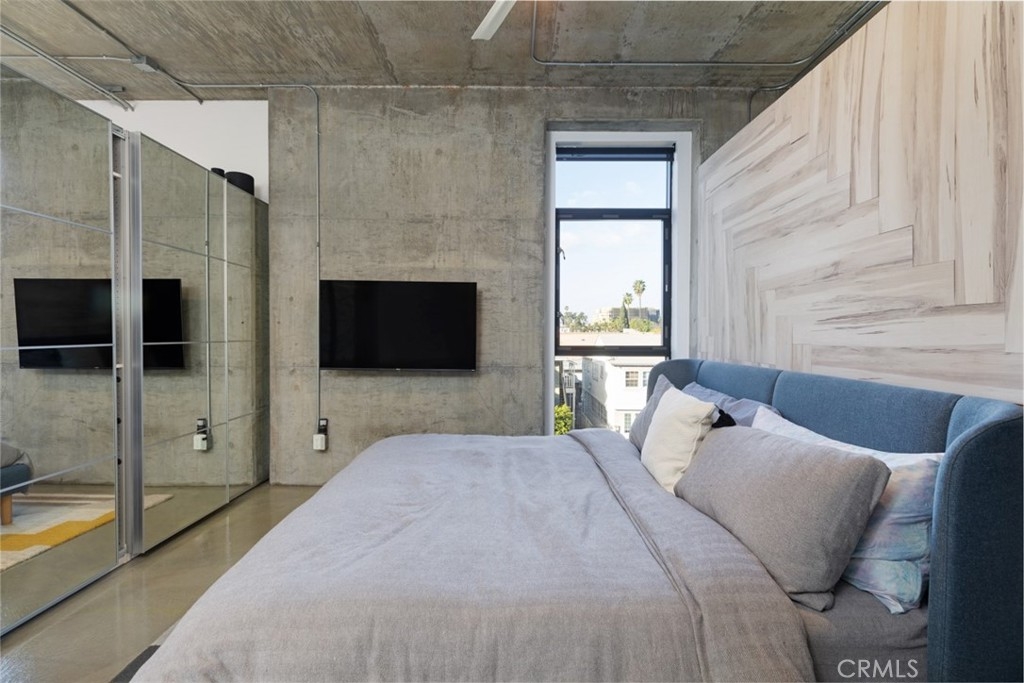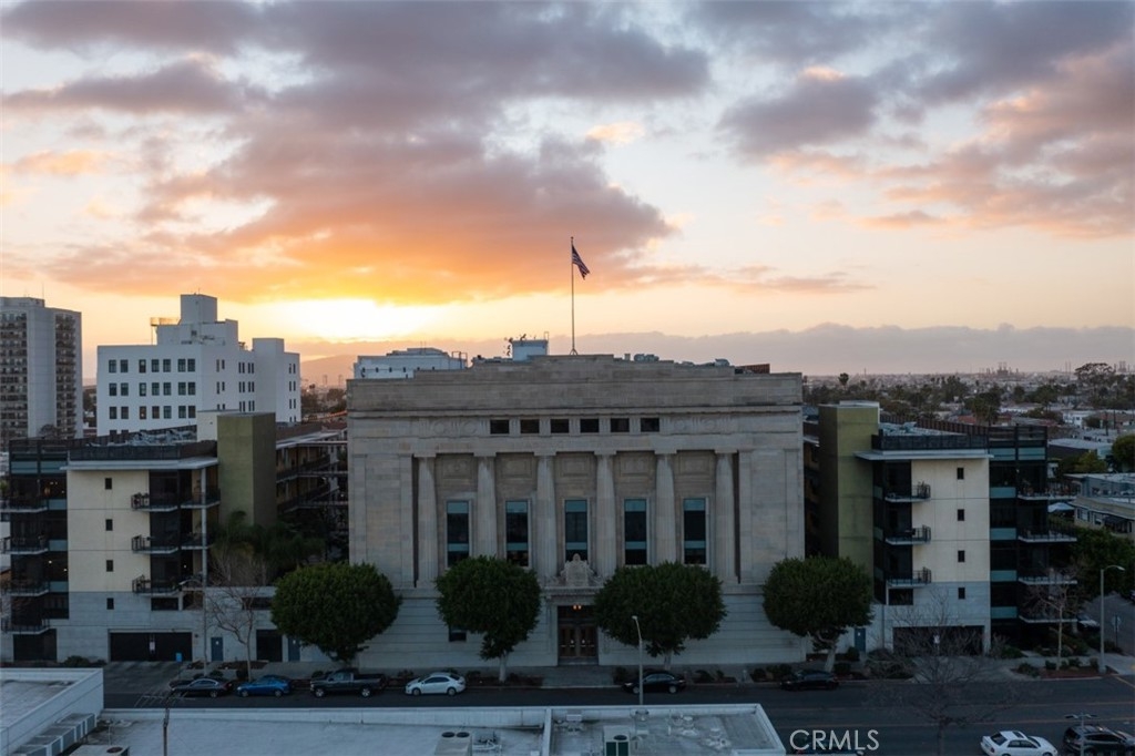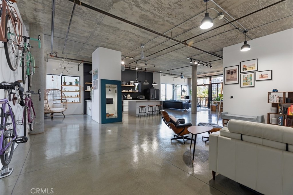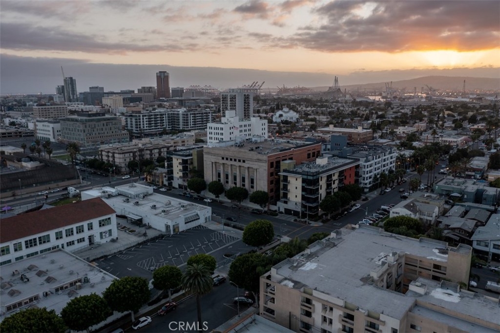 Welcome Home to this fabulous corner loft with floor to ceiling windows and sunset and city views. This spectacular loft embodies every feature of a loft buyer's wish list. An expansive light filled space with gleaming polished concrete floors, high ceilings an open layout with multiple flex spaces for living, dining, working, entertaining and relaxing. The tastefully updated, modern, open concept kitchen has all new appliances, updated cabinets, custom open shelving, custom-built kitchen island with a waterfall quartz countertop and built-in storage. Custom lighting throughout including a striking chrome Sputnik chandelier in the dining area, starburst chandelier in the lounge area, and hardwired pendant and track lighting. The sleeping area is creatively concealed with mirrored wardrobe room dividers that create a sense of separation and provide storage. In addition, the space is efficiently maximized with a custom walk-in closet complete with shelving, drawers, a vanity area and is ingeniously camouflaged from the bedroom area with a chic patterned wall that doubles as decor. An electronic shade in the bedroom provides privacy and convenience. The updated bathroom features a dual vanity and custom glass shower and bath doors, with a clever dual sided shower and bathtub. An original artwork mural by a local Long Beach Pow Wow artist, Luise Ono, adorns the bedroom wall and playfully snakes around the corner. This superbly appointed community offers private storage, secured resident parking, secured guest parking, secured entrance lobby with magnificent period-correct architectural elements, fitness center, clubhouse, bike storage, outdoor lounge with BBQs and a fire pit, jacuzzi and on-site maintenance.