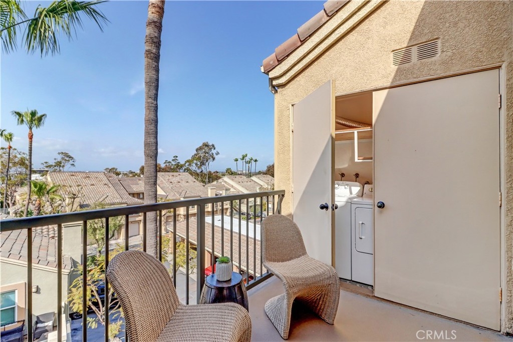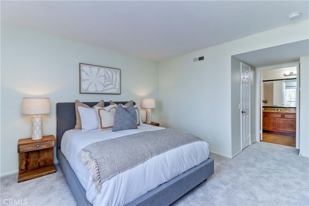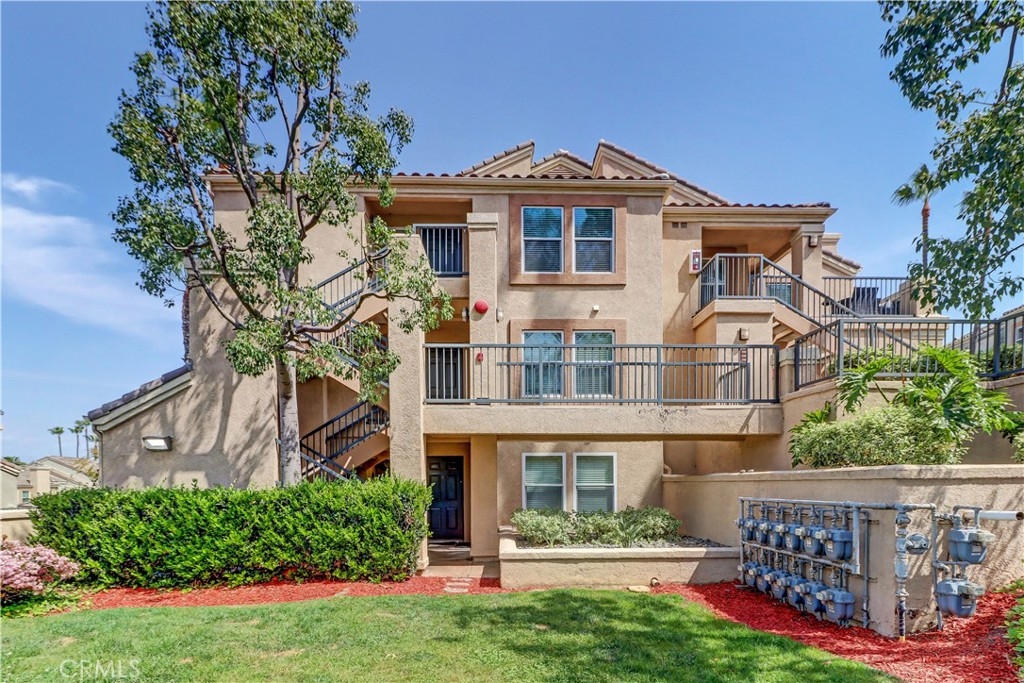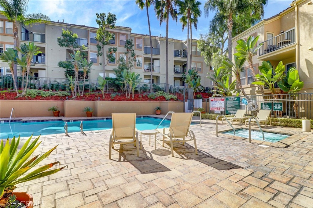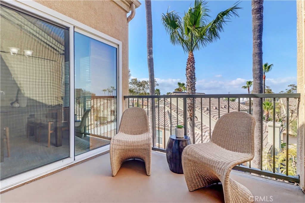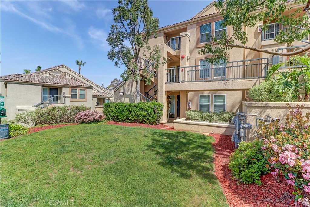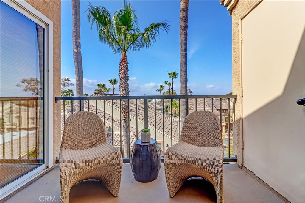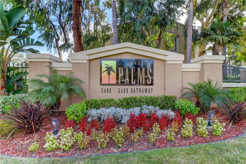 Experience refined living in this exquisite top-floor end unit with a private garage, nestled in the coveted community of The Palms. From the moment you enter, you’ll be captivated by the elegant details throughout. The open floor plan, with smooth ceilings and crown molding, is enhanced by brand-new carpet extending into both bedrooms.The gourmet kitchen is a chef’s dream, showcasing sleek shaker cabinets, granite counters, a serving bar, and a brand-new Samsung stainless steel appliance suite. The bright dining area, with scenic views, comfortably seats four. Step onto the private balcony to savor breathtaking mountain and city light vistas—perfect for alfresco dining. The primary bedroom is a serene retreat with direct balcony access, a spacious walk-in closet, and a spa-like ensuite bath featuring an expanded granite vanity, oversized mirrors, upgraded lighting, and a luxurious oval soaking tub. The second bedroom is equally inviting, offering a walk-in closet, a private vanity with new lighting, and access to a stylish Jack & Jill bathroom with a tub, glass slider, granite vanity, and modern hardware. Additional highlights include newer bamboo blinds, fresh paint, dual-pane windows, an upgraded central air condenser, linen storage, and private laundry. Enjoy ample storage in your exclusive one-car garage, with an additional parking space in front (totaling two) and a community parking permit for overnight guests. The Palms offers resort-style amenities, including a gated entrance with intercom, a sparkling pool, spa, fitness center, and clubhouse. Water, trash, and sewer are included in the HOA dues. The community welcomes one dog/cat under 35 Lbs. Ideally located near freeways, dining, shopping, beaches, golf courses, hiking trails, and charming cafés, this exceptional condo offers an unmatched blend of style, comfort, and convenience.