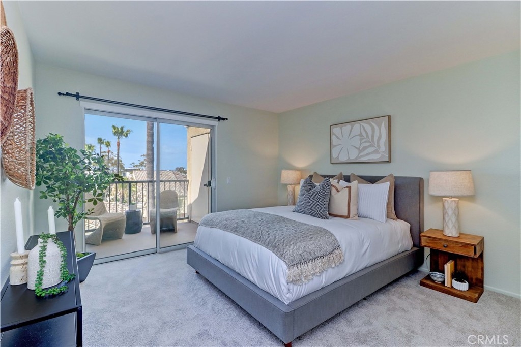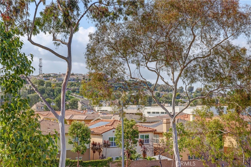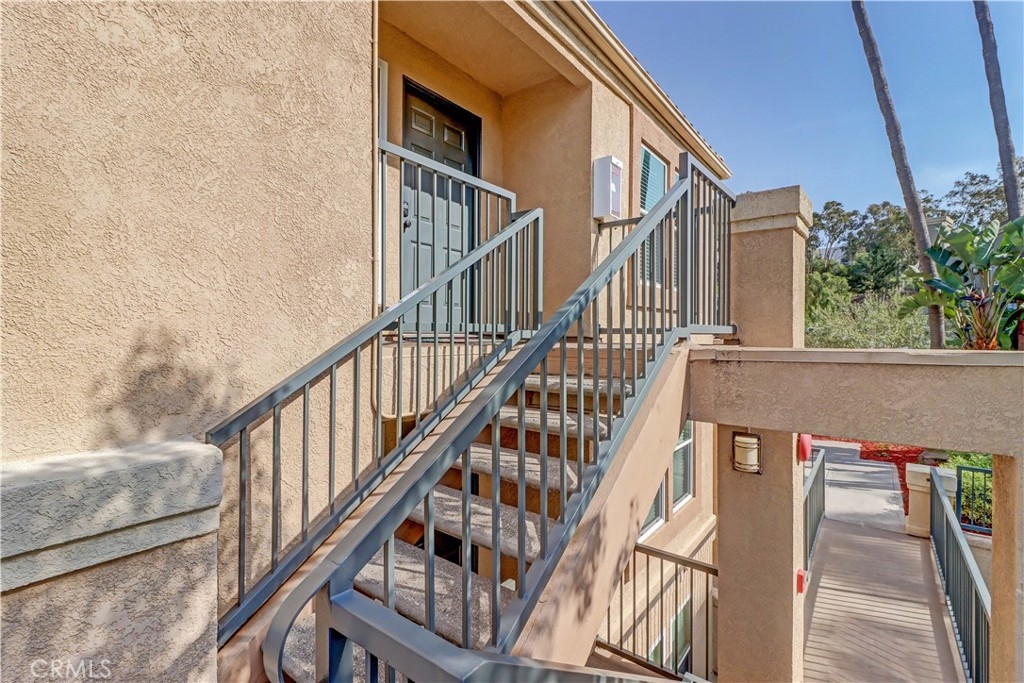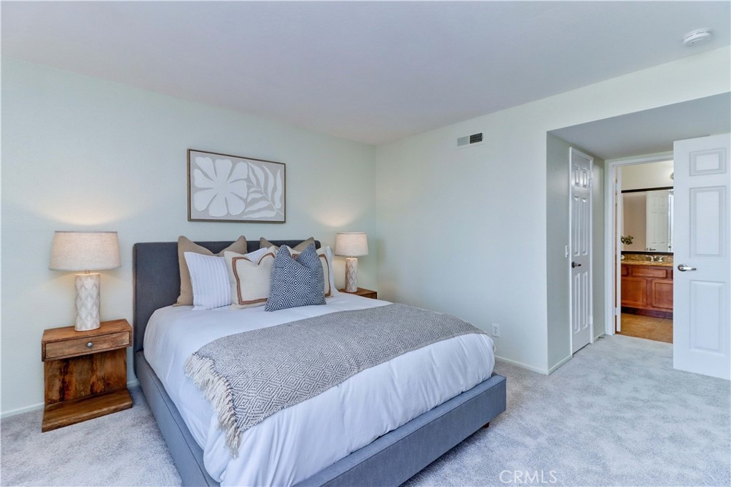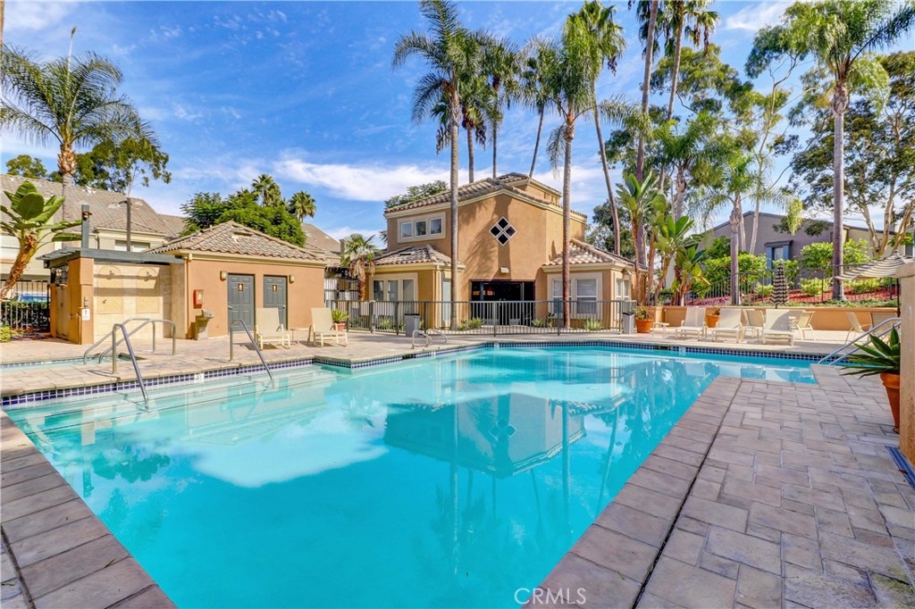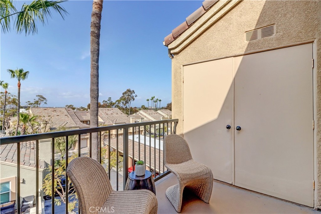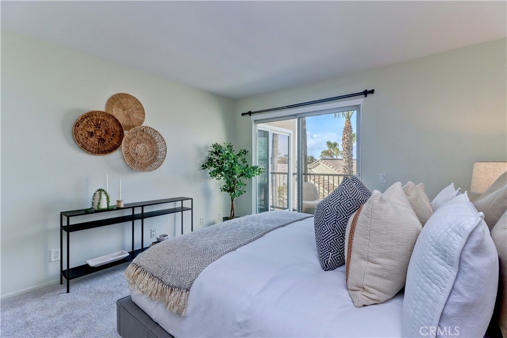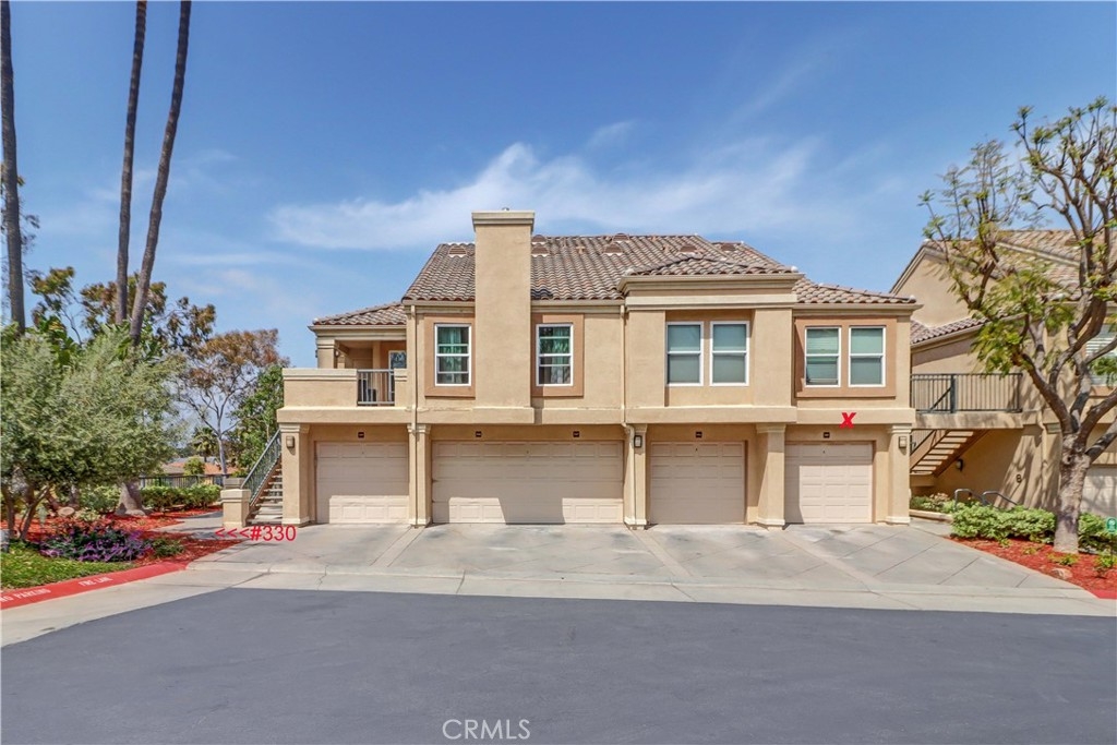 Experience refined living in this exquisite top-floor end unit with a private garage, nestled in the coveted community of The Palms. From the moment you enter, you’ll be captivated by the elegant details throughout. The open floor plan, with smooth ceilings and crown molding, is enhanced by brand-new carpet extending into both bedrooms.The gourmet kitchen is a chef’s dream, showcasing sleek shaker cabinets, granite counters, a serving bar, and a brand-new Samsung stainless steel appliance suite. The bright dining area, with scenic views, comfortably seats four. Step onto the private balcony to savor breathtaking mountain and city light vistas—perfect for alfresco dining. The primary bedroom is a serene retreat with direct balcony access, a spacious walk-in closet, and a spa-like ensuite bath featuring an expanded granite vanity, oversized mirrors, upgraded lighting, and a luxurious oval soaking tub. The second bedroom is equally inviting, offering a walk-in closet, a private vanity with new lighting, and access to a stylish Jack & Jill bathroom with a tub, glass slider, granite vanity, and modern hardware. Additional highlights include newer bamboo blinds, fresh paint, dual-pane windows, an upgraded central air condenser, linen storage, and private laundry. Enjoy ample storage in your exclusive one-car garage, with an additional parking space in front (totaling two) and a community parking permit for overnight guests. The Palms offers resort-style amenities, including a gated entrance with intercom, a sparkling pool, spa, fitness center, and clubhouse. Water, trash, and sewer are included in the HOA dues. The community welcomes one dog/cat under 35 Lbs. Ideally located near freeways, dining, shopping, beaches, golf courses, hiking trails, and charming cafés, this exceptional condo offers an unmatched blend of style, comfort, and convenience.