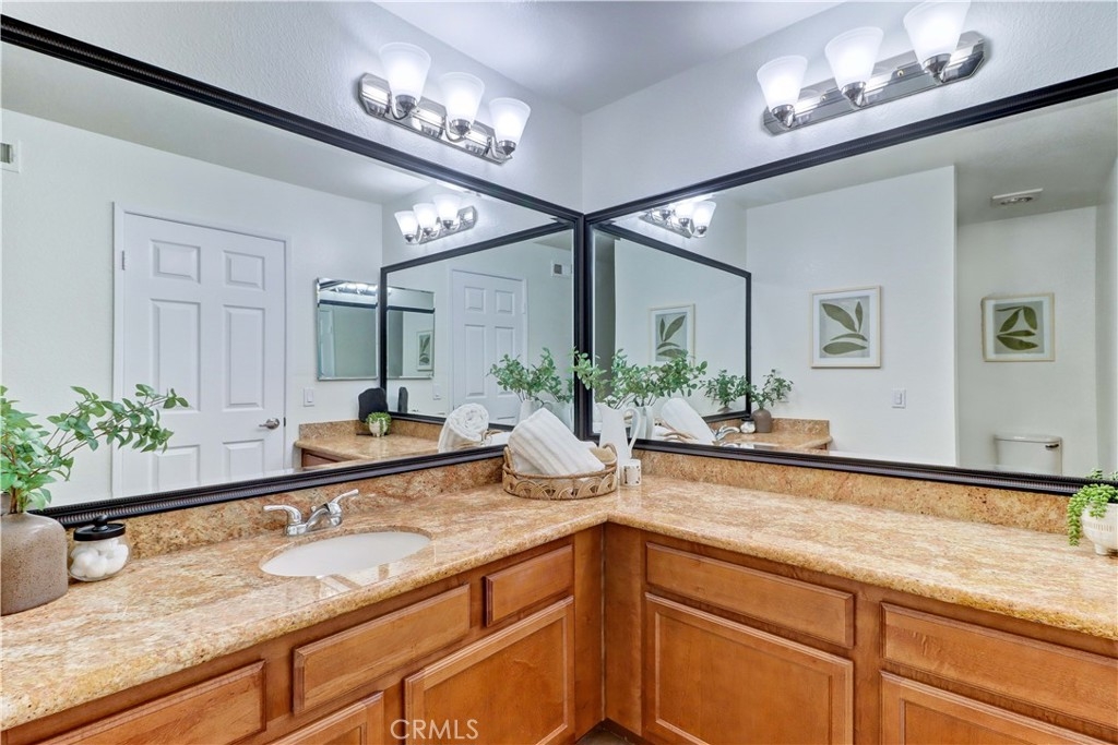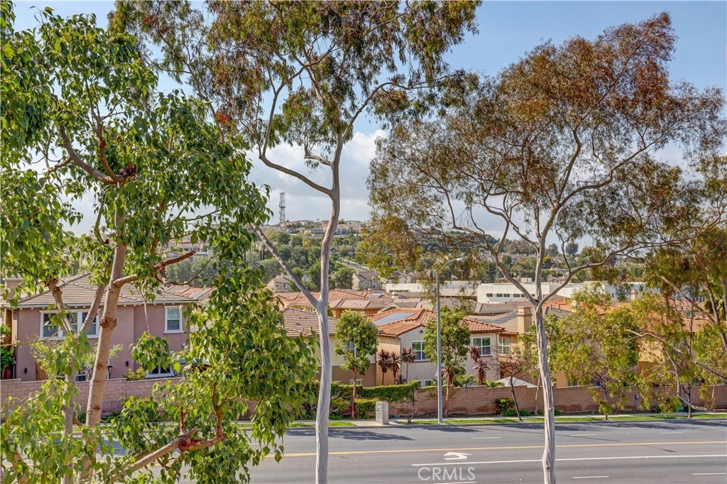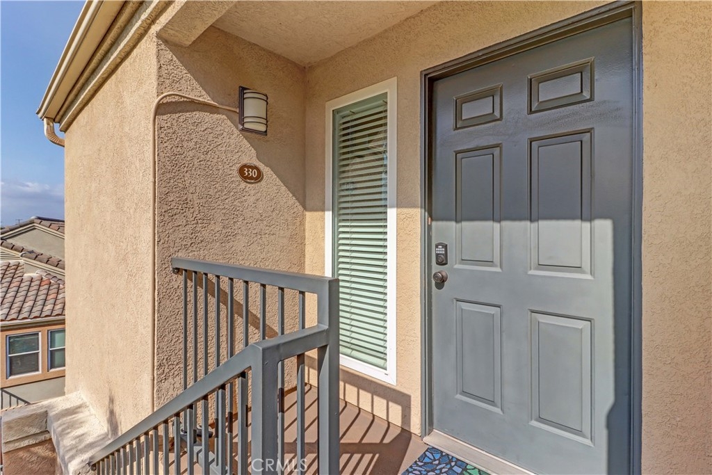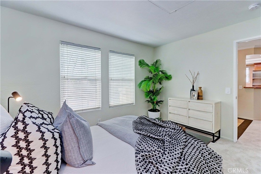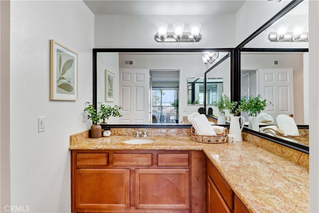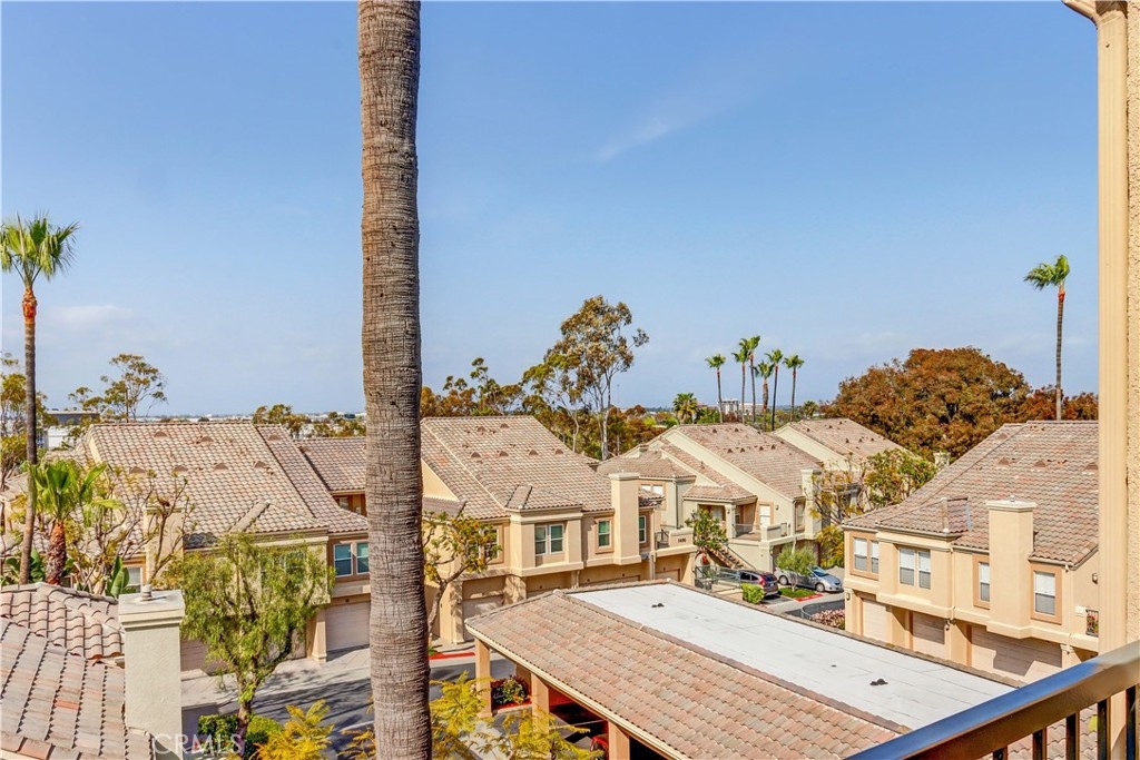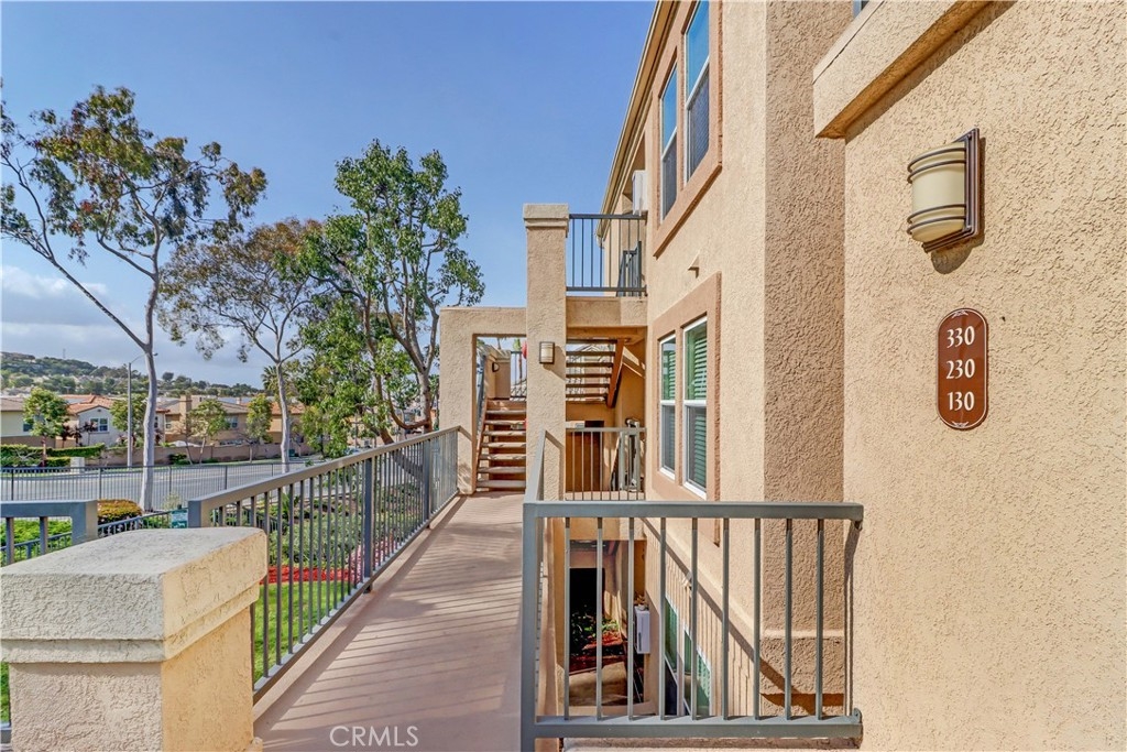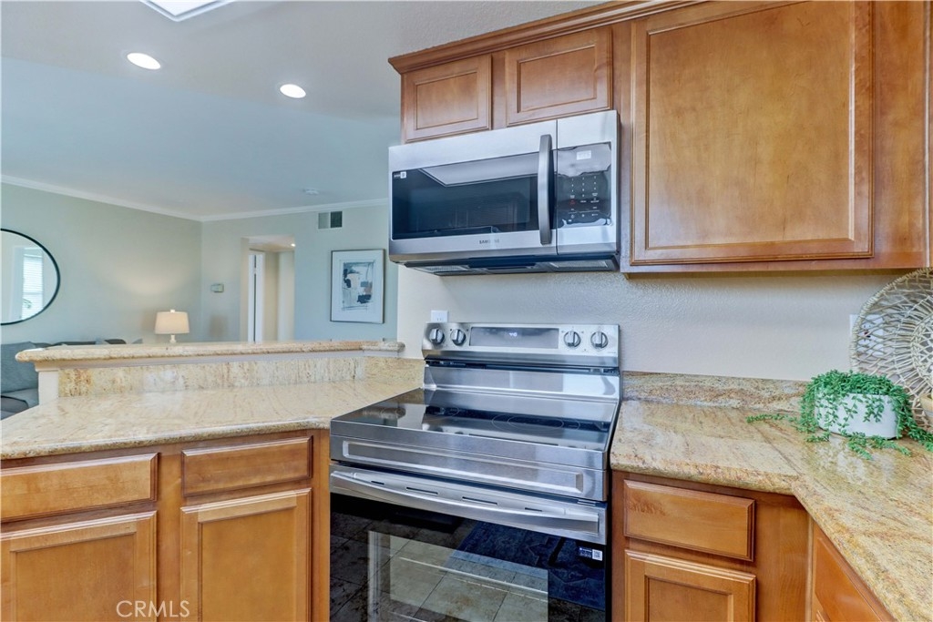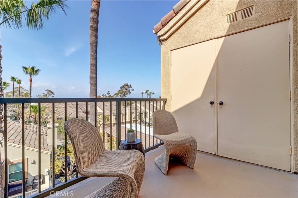 Experience refined living in this exquisite top-floor end unit with a private garage, nestled in the coveted community of The Palms. From the moment you enter, you’ll be captivated by the elegant details throughout. The open floor plan, with smooth ceilings and crown molding, is enhanced by brand-new carpet extending into both bedrooms.The gourmet kitchen is a chef’s dream, showcasing sleek shaker cabinets, granite counters, a serving bar, and a brand-new Samsung stainless steel appliance suite. The bright dining area, with scenic views, comfortably seats four. Step onto the private balcony to savor breathtaking mountain and city light vistas—perfect for alfresco dining. The primary bedroom is a serene retreat with direct balcony access, a spacious walk-in closet, and a spa-like ensuite bath featuring an expanded granite vanity, oversized mirrors, upgraded lighting, and a luxurious oval soaking tub. The second bedroom is equally inviting, offering a walk-in closet, a private vanity with new lighting, and access to a stylish Jack & Jill bathroom with a tub, glass slider, granite vanity, and modern hardware. Additional highlights include newer bamboo blinds, fresh paint, dual-pane windows, an upgraded central air condenser, linen storage, and private laundry. Enjoy ample storage in your exclusive one-car garage, with an additional parking space in front (totaling two) and a community parking permit for overnight guests. The Palms offers resort-style amenities, including a gated entrance with intercom, a sparkling pool, spa, fitness center, and clubhouse. Water, trash, and sewer are included in the HOA dues. The community welcomes one dog/cat under 35 Lbs. Ideally located near freeways, dining, shopping, beaches, golf courses, hiking trails, and charming cafés, this exceptional condo offers an unmatched blend of style, comfort, and convenience.