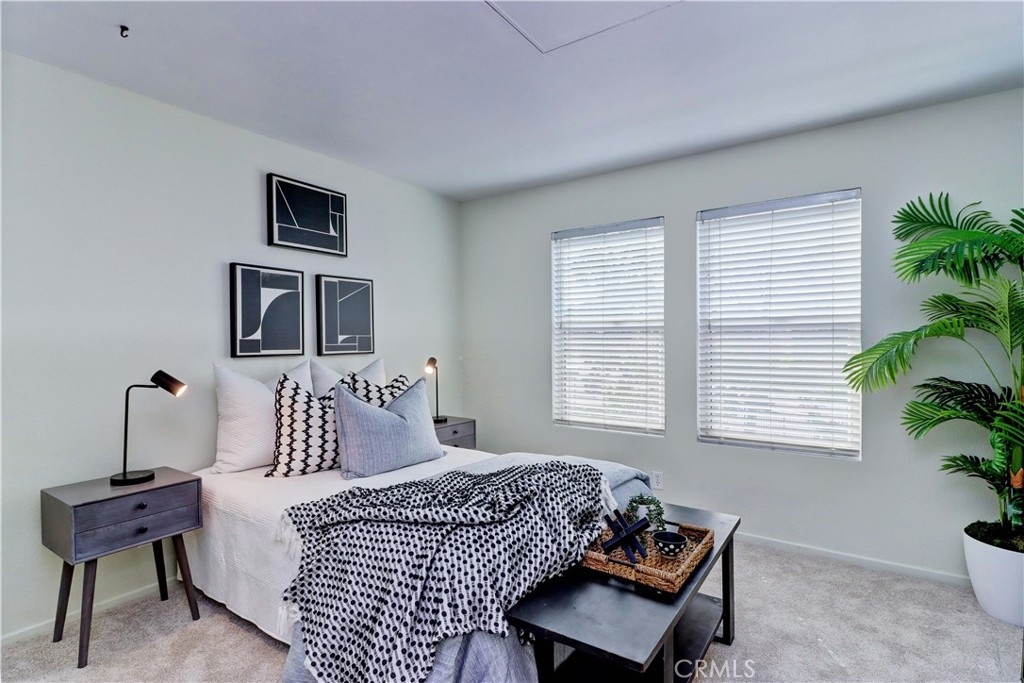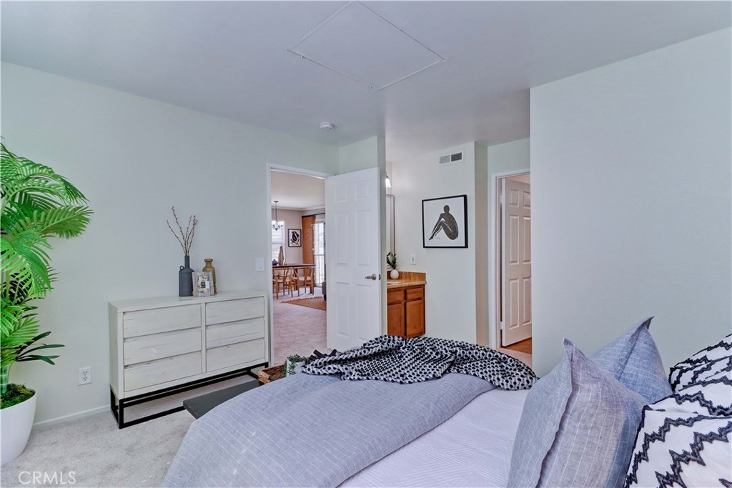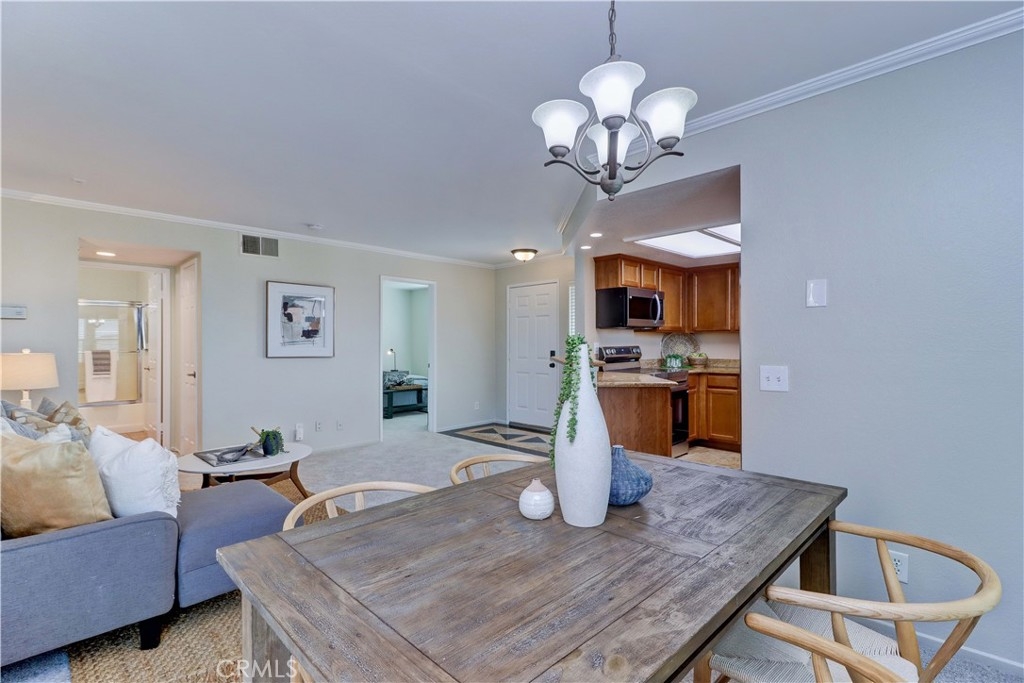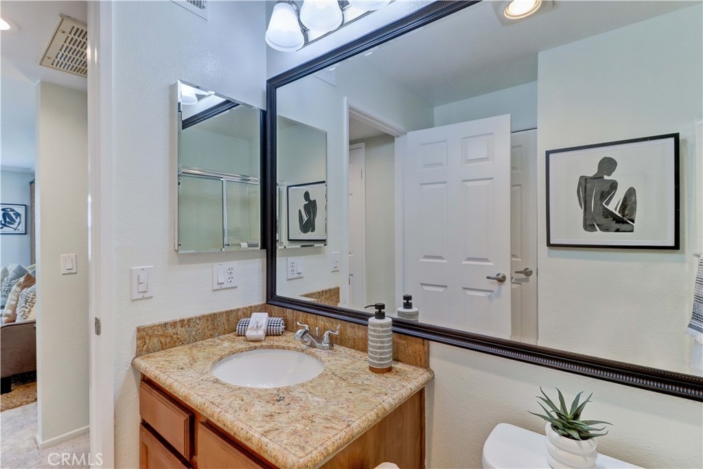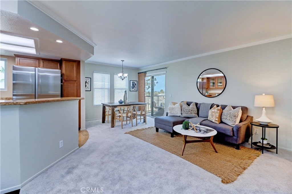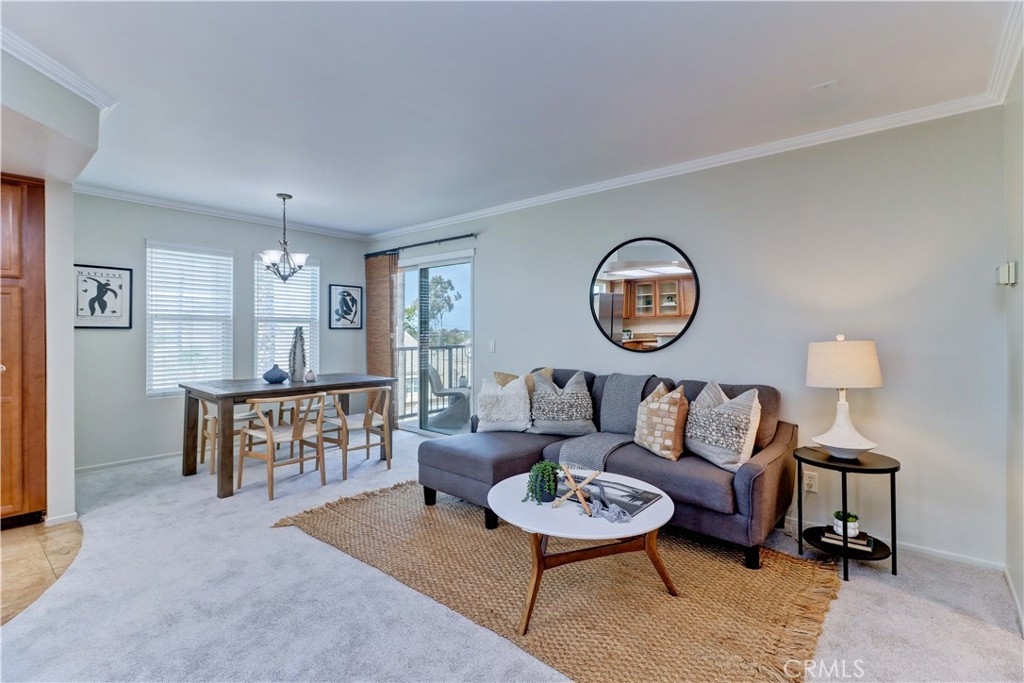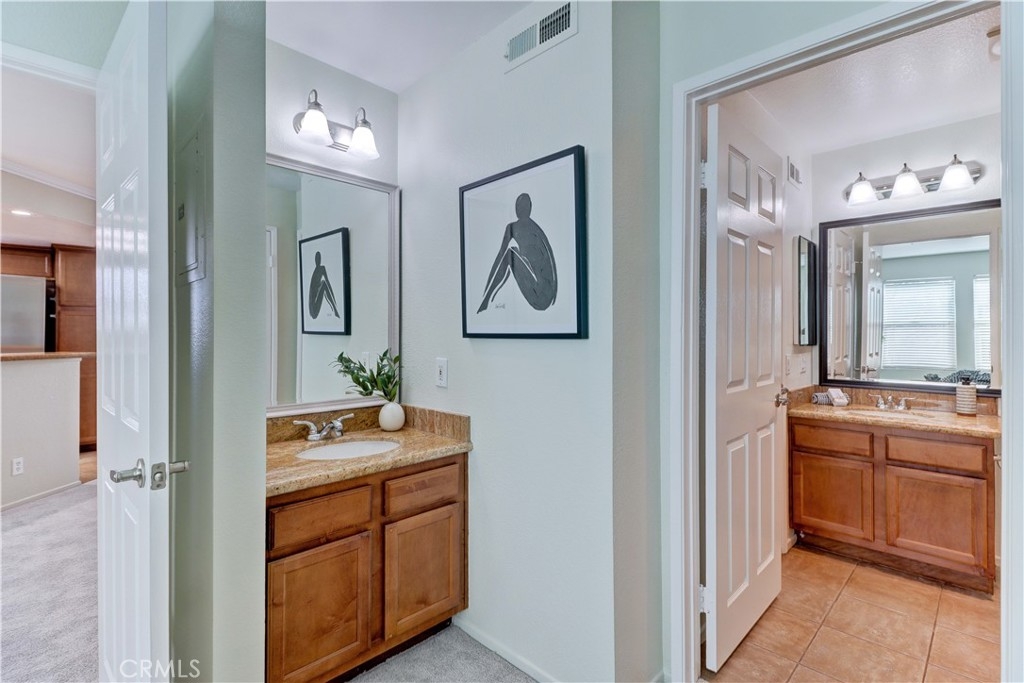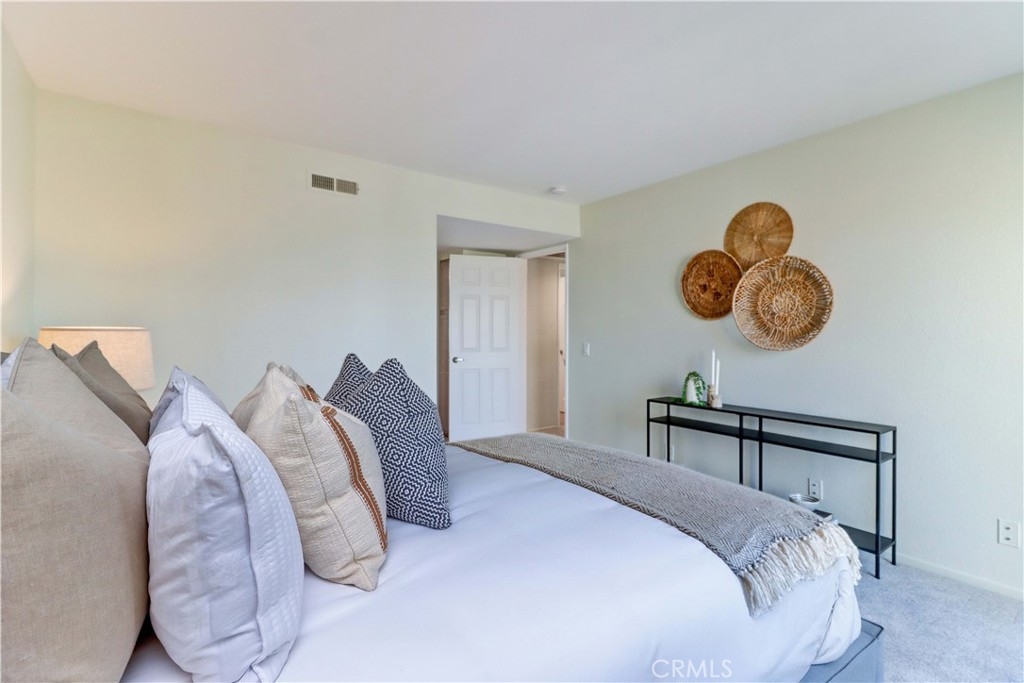 Experience refined living in this exquisite top-floor end unit with a private garage, nestled in the coveted community of The Palms. From the moment you enter, you’ll be captivated by the elegant details throughout. The open floor plan, with smooth ceilings and crown molding, is enhanced by brand-new carpet extending into both bedrooms.The gourmet kitchen is a chef’s dream, showcasing sleek shaker cabinets, granite counters, a serving bar, and a brand-new Samsung stainless steel appliance suite. The bright dining area, with scenic views, comfortably seats four. Step onto the private balcony to savor breathtaking mountain and city light vistas—perfect for alfresco dining. The primary bedroom is a serene retreat with direct balcony access, a spacious walk-in closet, and a spa-like ensuite bath featuring an expanded granite vanity, oversized mirrors, upgraded lighting, and a luxurious oval soaking tub. The second bedroom is equally inviting, offering a walk-in closet, a private vanity with new lighting, and access to a stylish Jack & Jill bathroom with a tub, glass slider, granite vanity, and modern hardware. Additional highlights include newer bamboo blinds, fresh paint, dual-pane windows, an upgraded central air condenser, linen storage, and private laundry. Enjoy ample storage in your exclusive one-car garage, with an additional parking space in front (totaling two) and a community parking permit for overnight guests. The Palms offers resort-style amenities, including a gated entrance with intercom, a sparkling pool, spa, fitness center, and clubhouse. Water, trash, and sewer are included in the HOA dues. The community welcomes one dog/cat under 35 Lbs. Ideally located near freeways, dining, shopping, beaches, golf courses, hiking trails, and charming cafés, this exceptional condo offers an unmatched blend of style, comfort, and convenience.