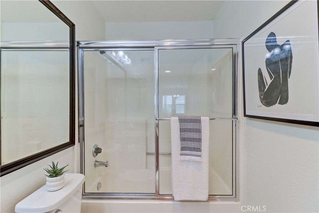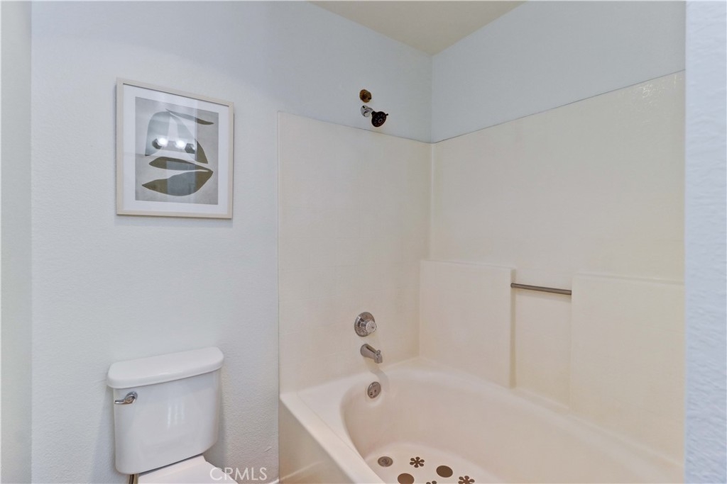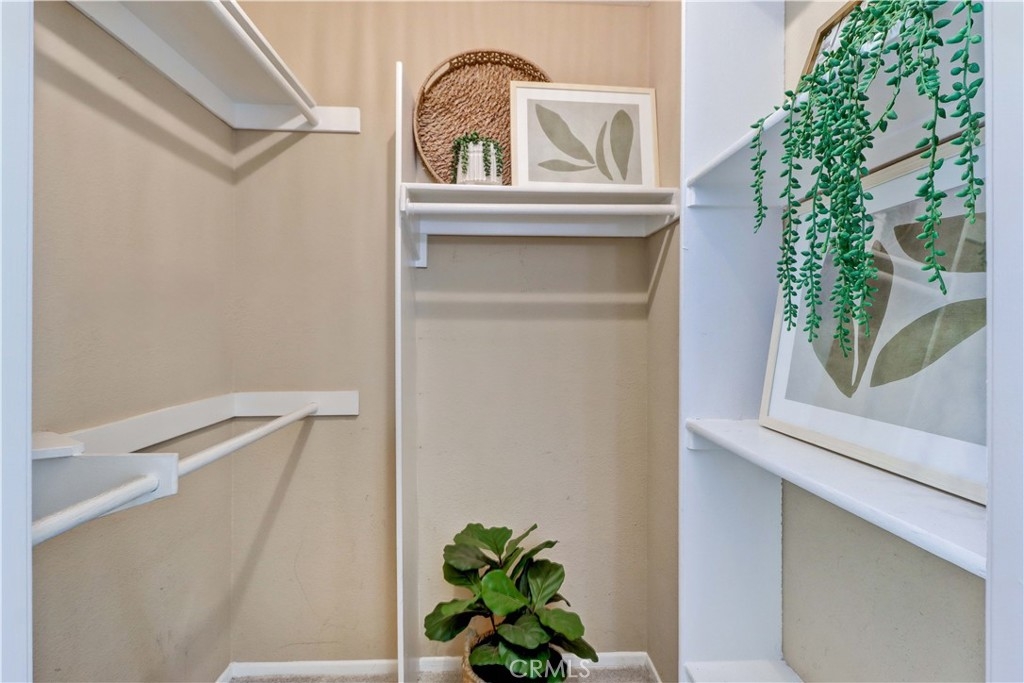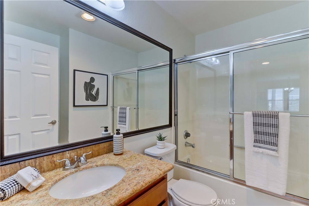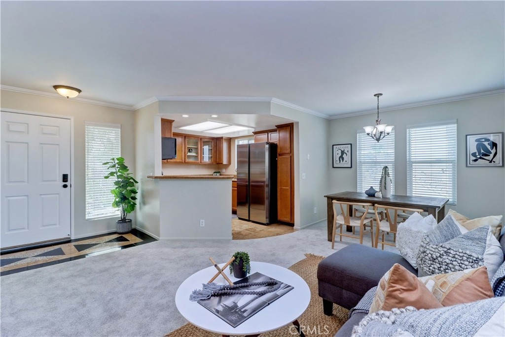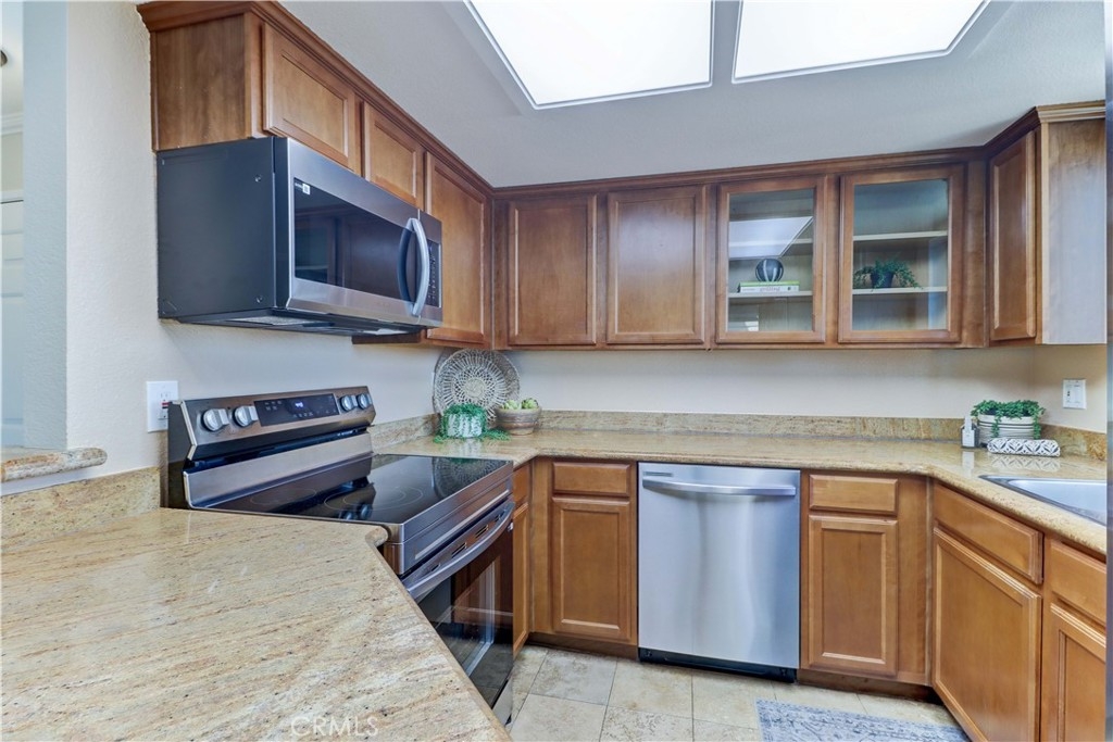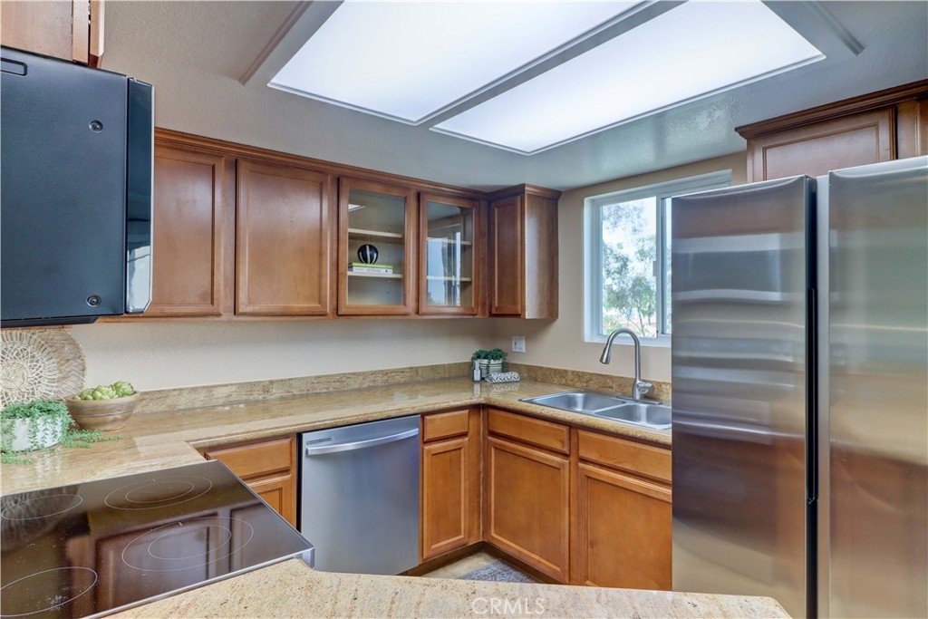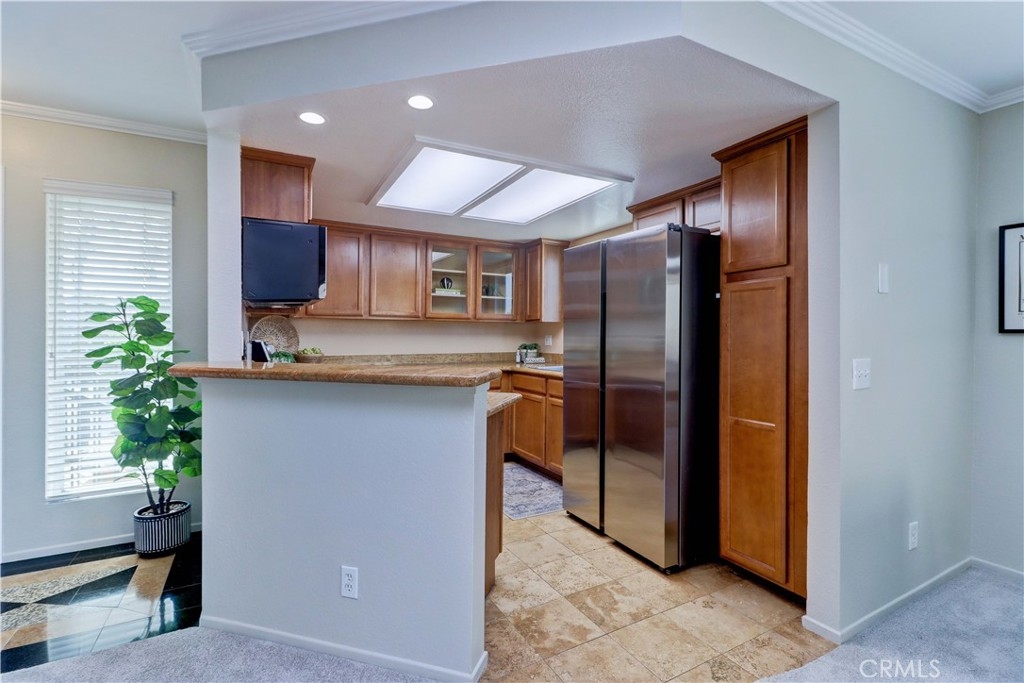 Experience refined living in this exquisite top-floor end unit with a private garage, nestled in the coveted community of The Palms. From the moment you enter, you’ll be captivated by the elegant details throughout. The open floor plan, with smooth ceilings and crown molding, is enhanced by brand-new carpet extending into both bedrooms.The gourmet kitchen is a chef’s dream, showcasing sleek shaker cabinets, granite counters, a serving bar, and a brand-new Samsung stainless steel appliance suite. The bright dining area, with scenic views, comfortably seats four. Step onto the private balcony to savor breathtaking mountain and city light vistas—perfect for alfresco dining. The primary bedroom is a serene retreat with direct balcony access, a spacious walk-in closet, and a spa-like ensuite bath featuring an expanded granite vanity, oversized mirrors, upgraded lighting, and a luxurious oval soaking tub. The second bedroom is equally inviting, offering a walk-in closet, a private vanity with new lighting, and access to a stylish Jack & Jill bathroom with a tub, glass slider, granite vanity, and modern hardware. Additional highlights include newer bamboo blinds, fresh paint, dual-pane windows, an upgraded central air condenser, linen storage, and private laundry. Enjoy ample storage in your exclusive one-car garage, with an additional parking space in front (totaling two) and a community parking permit for overnight guests. The Palms offers resort-style amenities, including a gated entrance with intercom, a sparkling pool, spa, fitness center, and clubhouse. Water, trash, and sewer are included in the HOA dues. The community welcomes one dog/cat under 35 Lbs. Ideally located near freeways, dining, shopping, beaches, golf courses, hiking trails, and charming cafés, this exceptional condo offers an unmatched blend of style, comfort, and convenience.