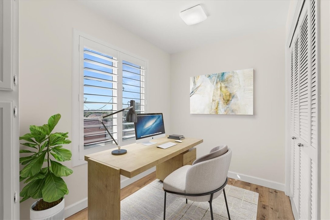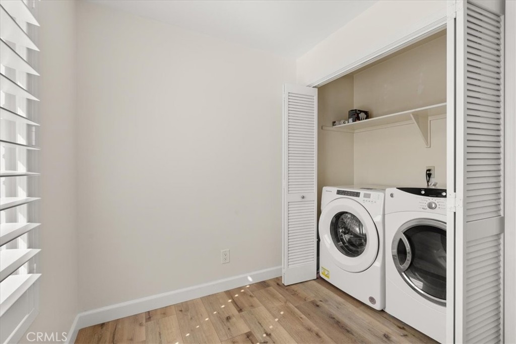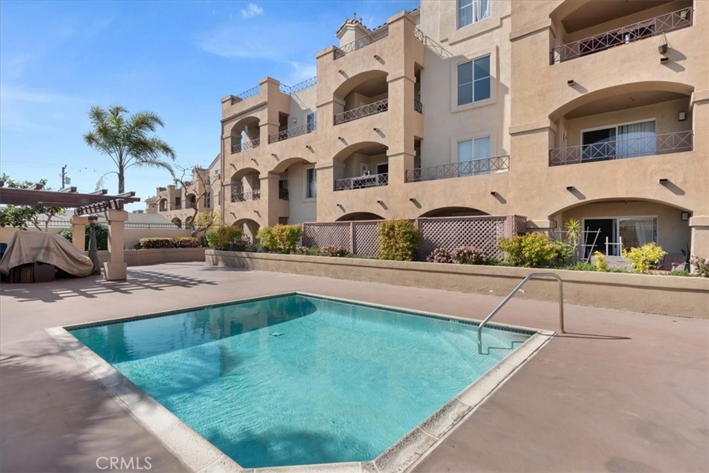 This charming corner unit condo offers a spacious layout with 2 bedrooms, 2 bathrooms, and a versatile flex space perfect for your home office. At 1019 square feet, this condo provides ample room for living, working, and entertaining. You'll love the private patio, perfect for unwinding. The unit boasts newer laminate flooring and newly added double pane windows with custom shutters that flood the space with natural light. The unit offers in-unit laundry, a rare find at this price point! Parking will never be a hassle with two garage spaces and assigned parking. Enjoy the convenience of central AC and heat, as well as the communal pool and spa. The monthly HOA covers water, trash, internet, and cable, providing ease and value. Plus, this pet-friendly building is FHA and VA approved, offering flexibility and convenience. Don't miss out on this rare find with its open floor plan and desirable amenities. Make this condo your own and experience the best of Long Beach living!