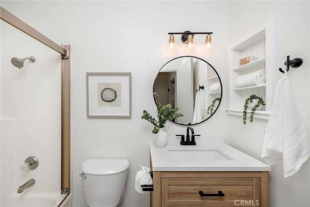 Experience the charm of this beautifully redesigned 2-bedroom, 2-bathroom ground-level, end-unit condo nestled in the gated Village on the Green community of Bixby Village. Recently redesigned by Baytown Design, this residence welcomes you with a harmonious blend of subtle retro design elements and a modern coastal flair, creating not only a lovely living space but one that truly inspires. The open living room and dining area overlook a private patio, perfect for unwinding after a long day or enjoying the weekend outdoors. Through the sliding door, you see the patio encircled by lush greenery, offering a serene space to rest and relax. The kitchen features rich complementary tones with custom cabinetry doors in Pashmina with soft-close hinges, brand-new GE, LG, and Samsung appliances, champagne bronze pulls and knobs, as well as a black hexagon-tiled floor, creating a striking focal point. Each bedroom features an expansive walk-in closet and a remodeled bathroom, including exquisite new vanities, mirrors, faucets, fixtures, and flooring, adding a touch of sophistication to every detail. All lighting fixtures have been upgraded to cast a warm, inviting glow throughout the home with a touch of style working in nicely with the freshly painted walls, ceiling, and baseboards. This is one of the few residences in this community that has an indoor laundry niche, featuring a brand new stackable GE washer and dryer. This residence comes with two assigned parking spaces – one carport and one uncovered space. This community offers exclusive resort-style amenities, including a sparkling pool, relaxing spa, and outdoor barbecue and picnic areas. Residents enjoy access to a clubhouse with a billiard room, a multipurpose room equipped with a full kitchen and wet bar, as well as a state-of-the-art fitness center. Adjacent to the community is the nine-hole Bixby Village Golf Course.