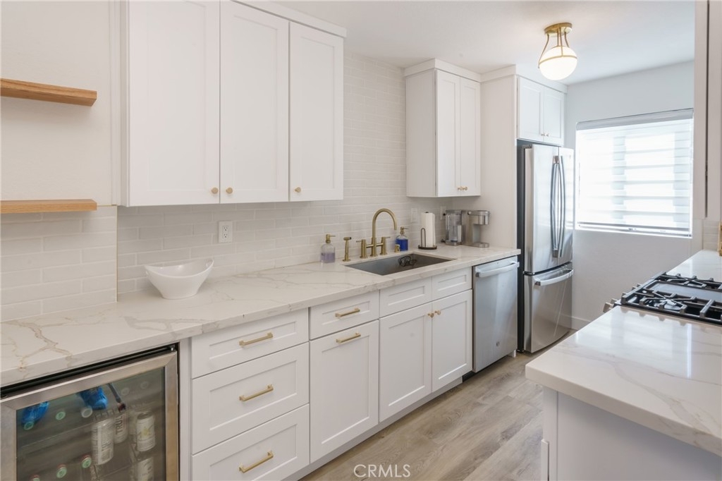 Stylish end-unit featuring a modern kitchen with quartz counters, white cabinetry, stainless GE appliances, and gold accents. Open floor plan with central AC/heat, LVT wood-look flooring, fresh paint, and updated doors/baseboards. Primary bedroom offers dual mirrored closets; guest suite with custom glass doors. Enjoy tree-top views from the balcony. Includes 2 secured tandem parking spaces with storage and elevator access. Prime Bixby Knolls location near shops, dining, parks, and easy freeway access.