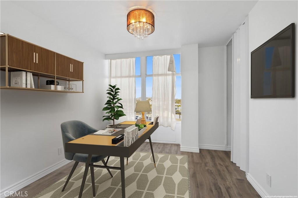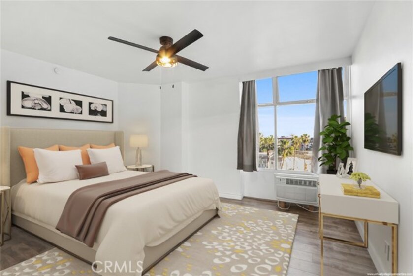 Welcome to urban coastal living in the heart of downtown Long Beach.Come make this condo your own!!! lowest price for a 2-bedroom in the building... This light-filled 2 bedroom, 1 bath condo offers an open living space framed by city skyline views and a delightful peek-a-boo water view. The living room flows to a dining area perfect for entertaining, while the kitchen features an efficient layout, all with wonderful views.. Both bedrooms are comfortably sized; the primary enjoys natural light and easy access to the bathroom. Hardwood/laminate flooring runs throughout the main areas, convenient building laundry, You can add laundry to your unit. Steps from restaurants, shops, nightlife, and transit — ideal for commuters or anyone who wants a true downtown lifestyle with occasional coastal breezes. Low-maintenance condo living with community amenities (secure entry) and just minutes to the waterfront and Shoreline Village unit #609