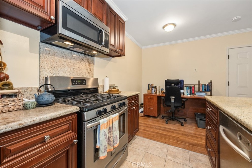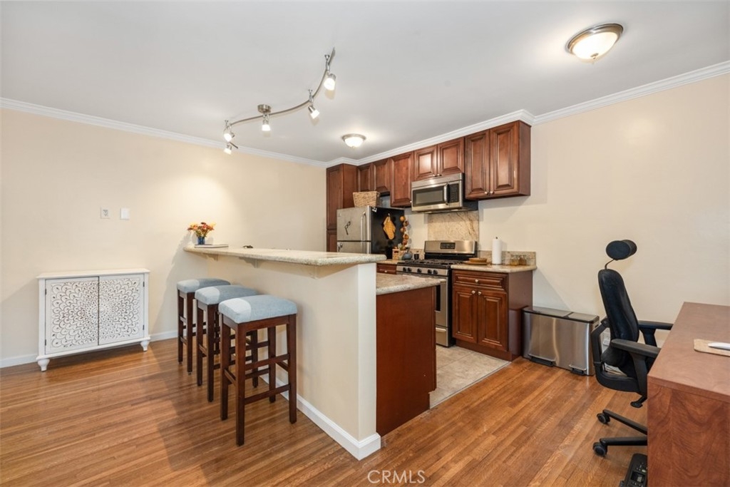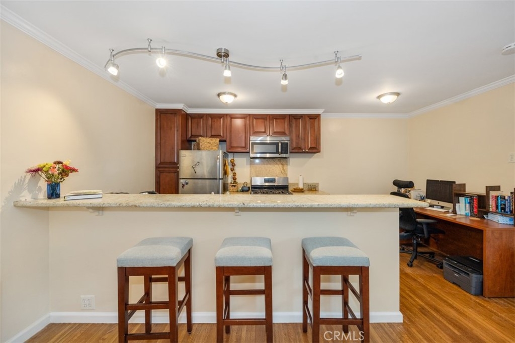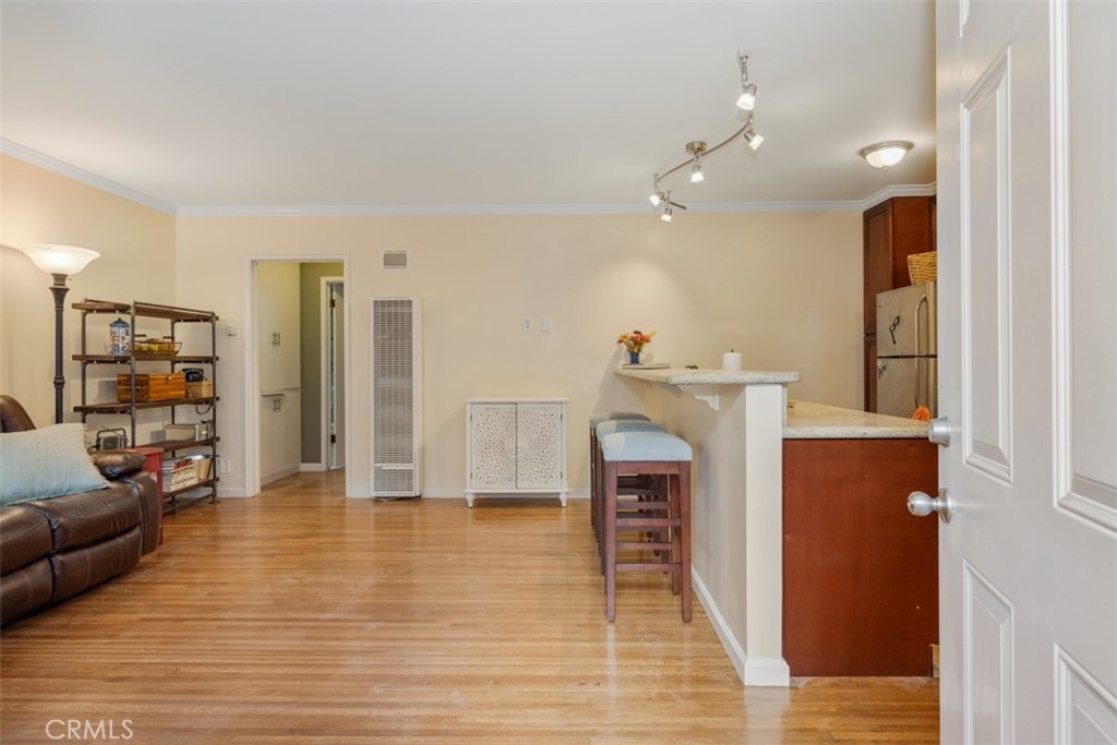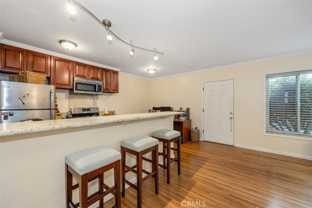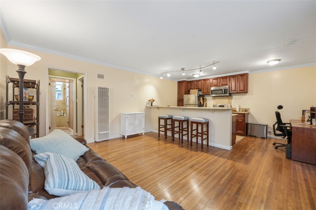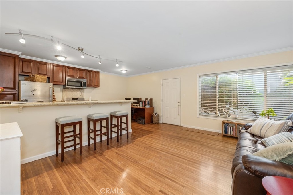 Ideal location! This spacious, lovely 1-bedroom in the heart of Alamitos Beach is in a quiet area of an attractive residential neighborhood, yet in easy walking distance to the beach, downtown shops and nightlife, the Arts District, Retro Row and Shoreline Village. This home is packed with pluses: +beautiful original oak floors, +fresh paint in the open kitchen and living room, +tons of storage space throughout the unit, +large windows looking onto the spacious courtyard with mature, well-kept garden, +newer remodeled kitchen and bathroom, +high-end kitchen appliances, incl. dishwasher, microwave, garbage disposal and gas range/oven, +custom cabinets, +plenty of granite countertops with a matching built-in dining/entertaining bar, +custom crown molding throughout unit, +double-pane windows, +ceiling fan in bedroom, +gated front and back entrance, +low HOA fee. +Buyer may opt to take over rental of on-site garage with door opener (month-to-month basis). +Neighborhood walk score of 93/100 and dense network of bike lanes. +Separate laundry unit for HOA members. +HOA fee includes trash, water, sewer, building maintenance, controlled access, gardening, insurance. +Two blocks and you descend to the beach and bike path, taking you to Yoga on the Bluff, volleyball and basketball courts, playgrounds, cafés and much more directly on the beach!