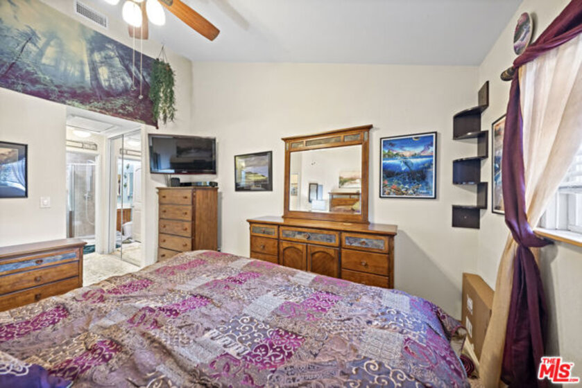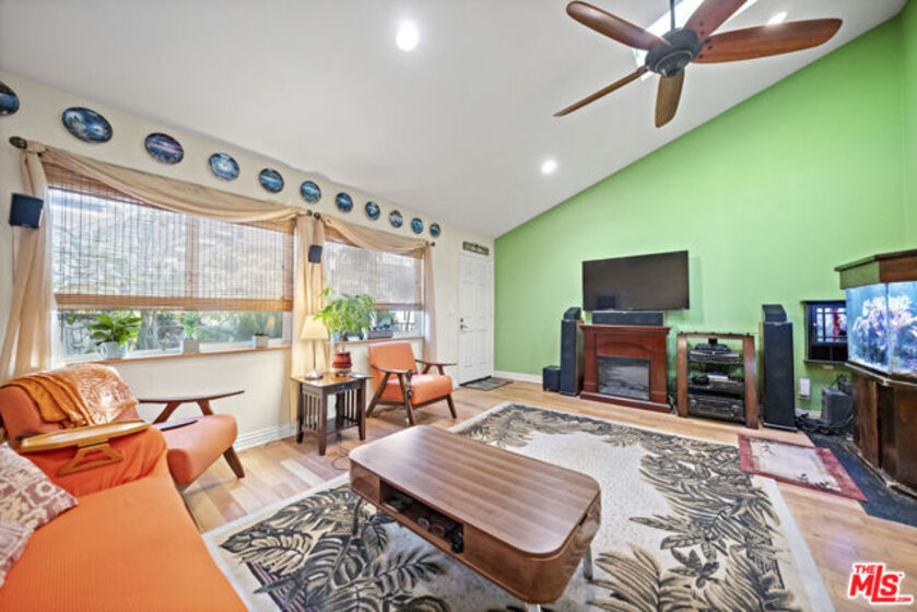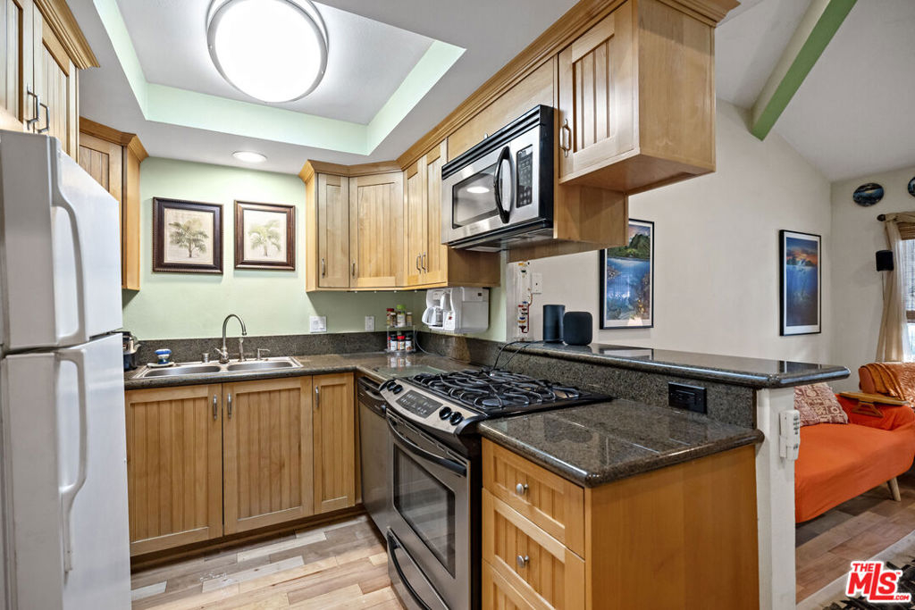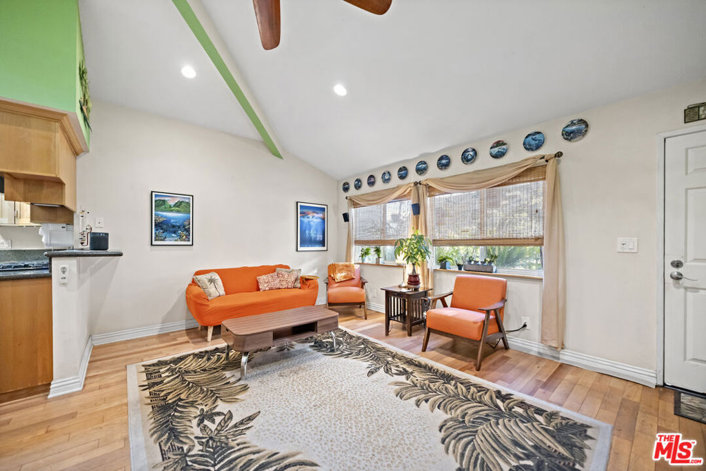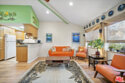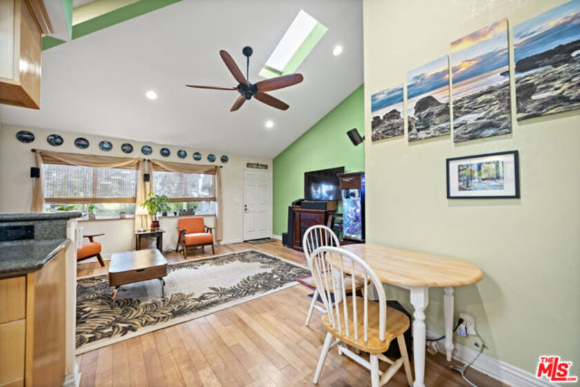 The Villas is a small complex convenient to the freeway and beaches. This secured building features controlled access, gated entry, and a parking garage with dedicated spaces. This property presents a great opportunity for buyers or investors, featuring a floor plan that boasts vaulted ceilings, abundant natural light, and light-toned hardwood floors. The interior is designed for comfort and efficiency, featuring a security door, double-paned windows, central air/heating, and a whole-house fan. The living room is equipped with hardwired internet, a multi-speed ceiling fan, and a skylight. Newer window coverings with wooden sills add a refined touch, while the high-quality surfaces and bathroom tile have been professionally sealed. The kitchen and laundry area includes a gently used LG Direct Drive washer/dryer and custom shelving. The primary suite offers vaulted ceilings, a swivel TV, and a misting shower head. Both bedrooms feature mirrored closets with organizational racks, with additional storage in the attic and linen closet. Originally built in 1984 and converted in 2006, this home includes dedicated office space and matching finishes kept in storage. This end unit is ready for immediate move-in and includes a south-facing front door and private patio.