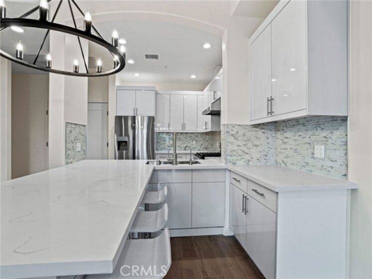 This beautifully upgraded 1-bedroom, 1-bathroom residence offers 910 square feet of thoughtfully designed living space within a sought-after 24-hour gated community. From the moment you step inside, you'll be captivated by the soaring high ceilings and rich wood flooring that flow seamlessly throughout. Fresh new carpet adds warmth and comfort to the living spaces, making this home truly move-in ready. The modern kitchen is a true showstopper, featuring sleek quartz countertops, a gorgeous new designer backsplash, and custom built-in cabinetry that blends contemporary style with timeless functionality — all complemented by a full suite of stainless steel appliances, including a newer dishwasher and refrigerator. The individual in-unit laundry room and included appliances make day-to-day living effortless and convenient. Step out onto your private balcony and soak in breathtaking sunset views every evening — a daily luxury you'll never take for granted from this coveted top-floor position. Residents also enjoy access to a first-floor fitness center, lobby lounge, and a second-floor park perfect for relaxing outdoors, all within the security of a gated community with one assigned parking space plus ample guest and street parking. Ideally located just minutes from Downtown Long Beach, premier shopping centers, and a vibrant restaurant scene, this home is also within walking distance to Theodore Roosevelt Elementary School and the prestigious Long Beach Polytechnic High School. Whether you're looking for your perfect primary residence or a smart investment opportunity, this property is an exceptional choice for both short-term and long-term rentals.