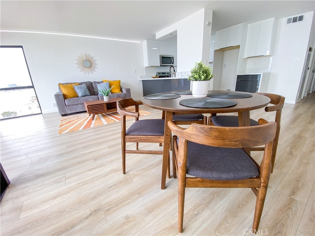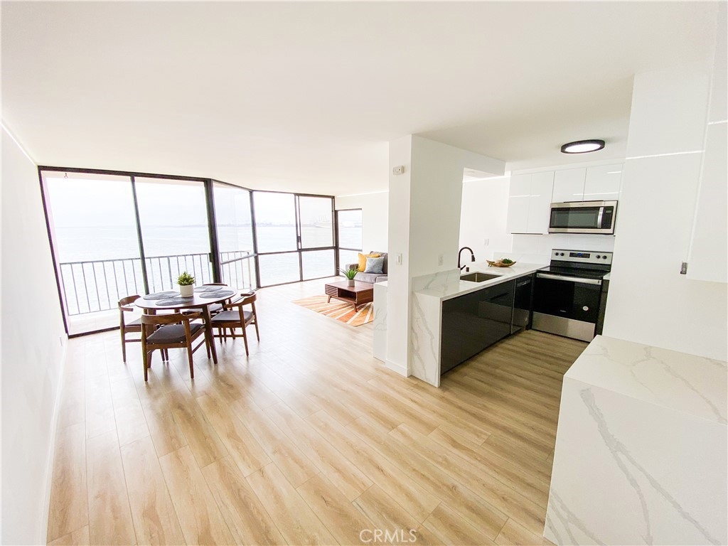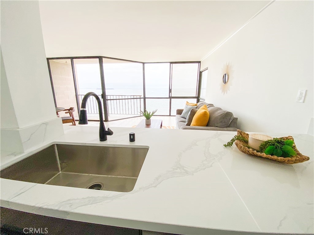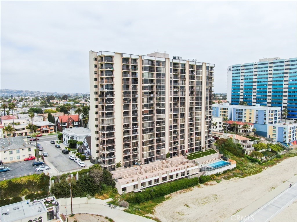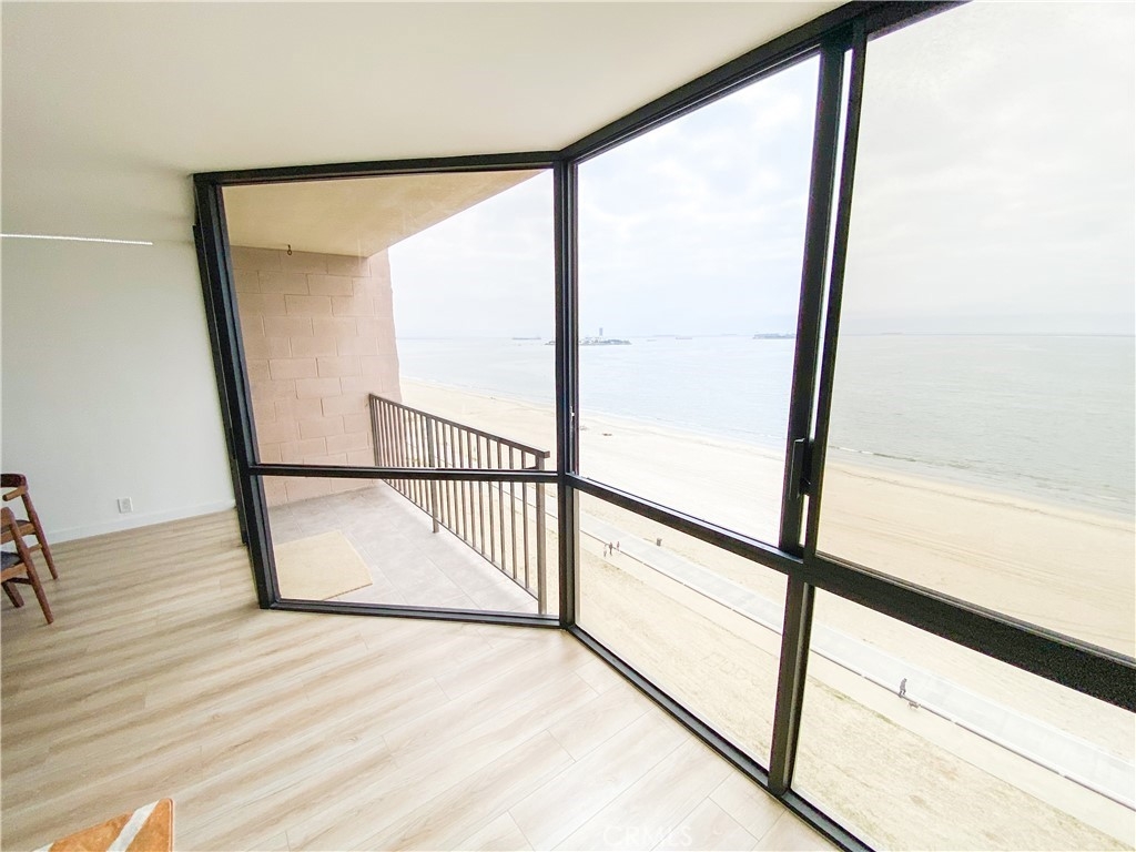 Experience the breathtaking beauty of the ocean from every angle in this stunning one-bedroom oceanfront condo, boasting a panoramic 180-degree ocean view. Marvel at the endless stretch of sea from the comfort of your own home, elevated enough to appreciate the spectacular view, yet low enough to immerse yourself in the soothing sounds of the waves and observe playful dolphins and pelicans. The corner unit boasts floor-to-ceiling windows, making it the most desirable residence in the complex. This impeccable home boasts intricate details such as custom paint, lighting, and flooring, along with a remodeled bath and kitchen featuring elegant European two-toned cabinets. The HOA-managed AC system, Fios TV and internet, wifi, water, and earthquake insurance are all included in the HOA fees. The secure garage comes with a private parking space and four storage cabinets, while guest parking is conveniently located on the 6th floor. Enjoy access to first-class amenities, such as a clubhouse with a full-service kitchen, fitness center, oceanfront pool, and jacuzzi with stairs leading to the sand level and bike path. Units in this building of this size, fully remodeled, only come on the market every couple of years. The property also features electric power in the garage for a charging station, and mesmerizing views of the Queen Mary and Carnival Cruise. With easy access to downtown Long Beach and Belmont Shore, the location is unbeatable, with popular attractions such as the LB Art Museum, Bluff Park, Farmers Market, and Yoga on the Bluff only minutes away