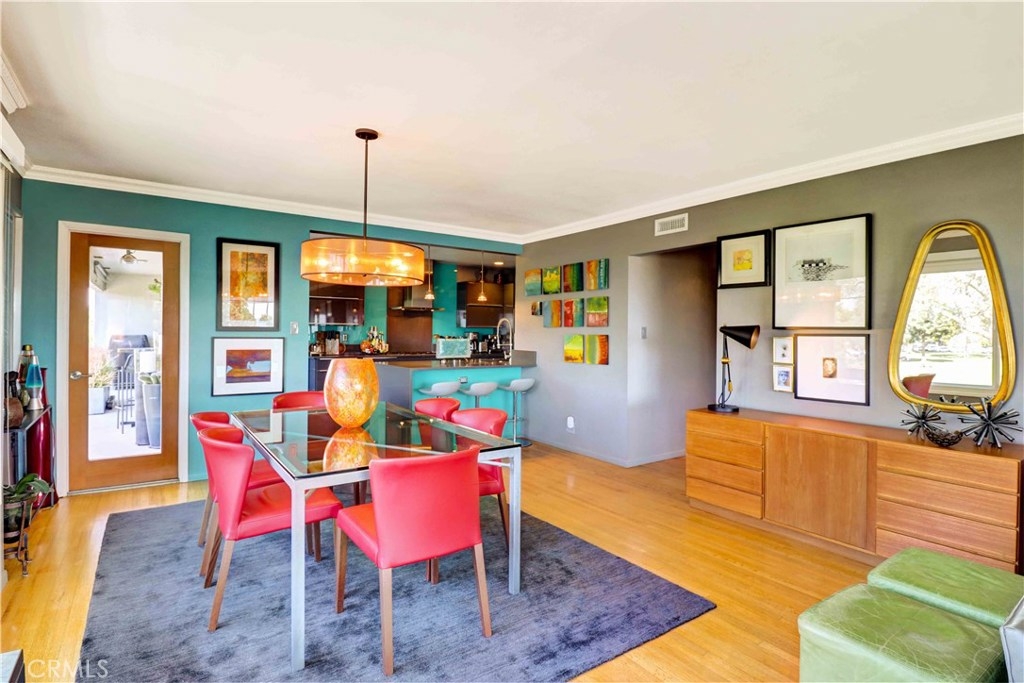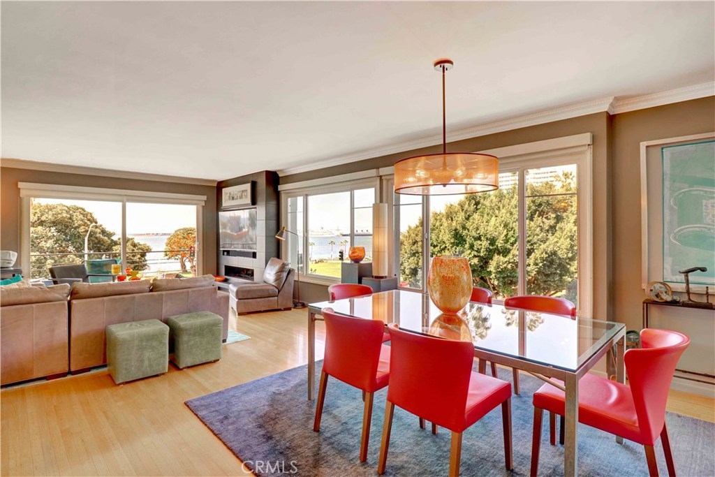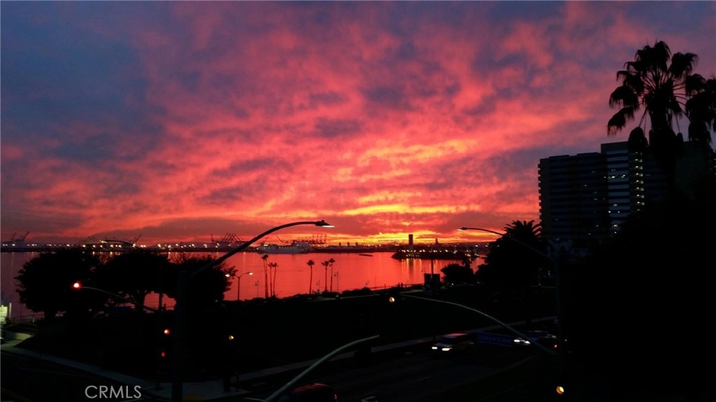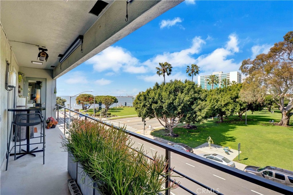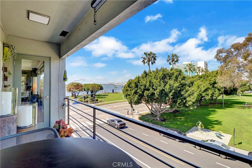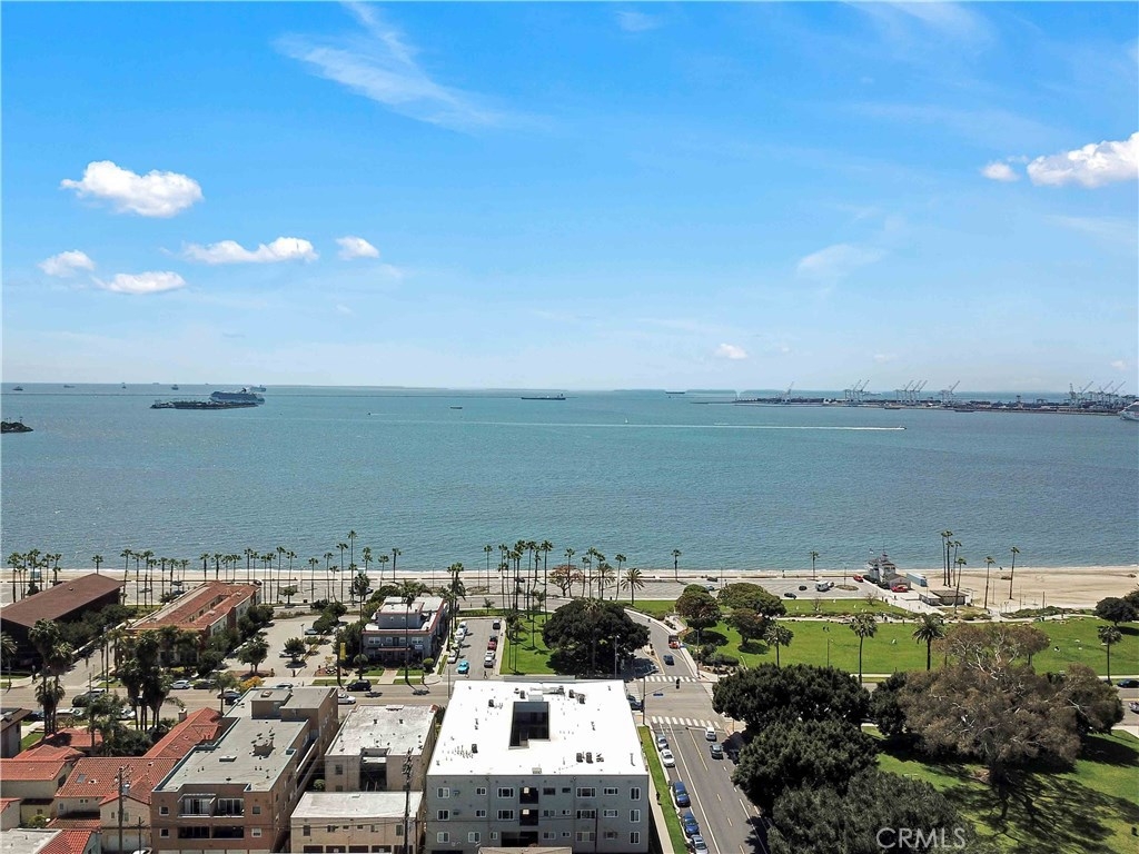 Truly once in a lifetime opportunity! Impeccably remodeled top floor corner 2 bed/2 bath condo with spectacular 180-degree views of the Pacific Ocean and Bixby Park. This mid-century modern 1459 sq ft condo features expansive views of the Iconic Queen Mary from the living room, dining room, kitchen and master bedroom. The open concept living space features custom fireplace with linear electric insert. There are three sliding doors that spill onto the two extra large balconies facing both south and west for incredible sunrises and sunsets. The remodeled kitchen features tons of European gray cabinetry, gray quartz counters, custom glass backsplash, LED lighting, high-end appliances including Bertazzoni gas cooktop, built-in oven and microwave, Perlick beverage cooler and Bosch refrigerator. Both mid-century period bathrooms are tastefully upgraded with modern lighting/fixtures and tile accents. Wake up every morning with blue ocean and green treetop views from your extra large master bedroom with tons of closet space. The second bedroom is also spacious with large closets and attached bathroom. Additional features include new designer lighting thru-out, laminated glass doors, orig hardwood floors, newer central HVAC system and walk-in laundry room with tons of storage. Located in desirable Bluff Park, the Beach Park HOA is a well-maintained, pet friendly building with low HOA fee. It has incredible access to the beach, bike path, farmers market, yoga, LB Art Museum and more!