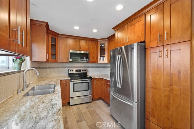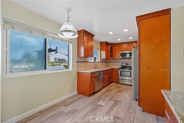 2 bedroom 2 bath condo built in 1975. Very bright and sunny; southern exposure corner unit with a sharing wall with stairs. 1 block off from the ocean and Bixby Park next block. Free Yoga classes, dog park, and 2x a week farmer's market at Bixby park. 2 side by side parking spaces. 2 sizable storage spaces. Eat in kitchen, kitchen cabinets are a large size for a 2 bedroom and 2 bathroom condo. Kitchen was remodeled: well known brands stainless steel appliances, granite counter tops, tiled back splash, pull out shelves, soft close drawers, 2 lazy susan shelves, recessed lights, updated wall outlets, and 2 ceiling fans. Laminated and tile flooring. Snow capped mountain, peekaboo ocean and court yard views.