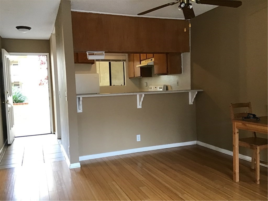 Super cute cosmetic fixer, bring your handyman tools and make this your own! Unit is located on the first floor of living quarters, one street level up. Living and dining areas open to the kitchen and the breakfast bar. The unit has its own balcony which is accessible from either the living room or master bedroom with south facing views from the front of the condo building. Master bedroom has its own full bath. A second full bath is located in the hallway close to the other bedroom. Stackable washer-dryer hookups are in the unit located in the hallway. High quality laminate floors are in the living/dining room areas, the hall and bedrooms. Tile flooring in the kitchen. Central heat comes with this property. Includes one parking space in a secure garage.