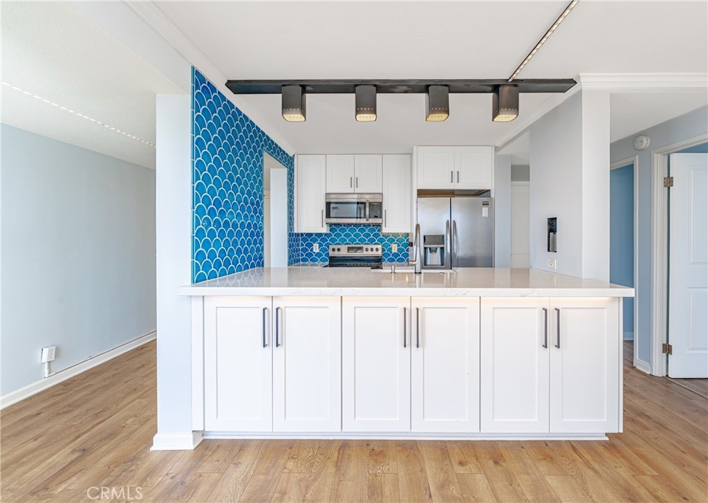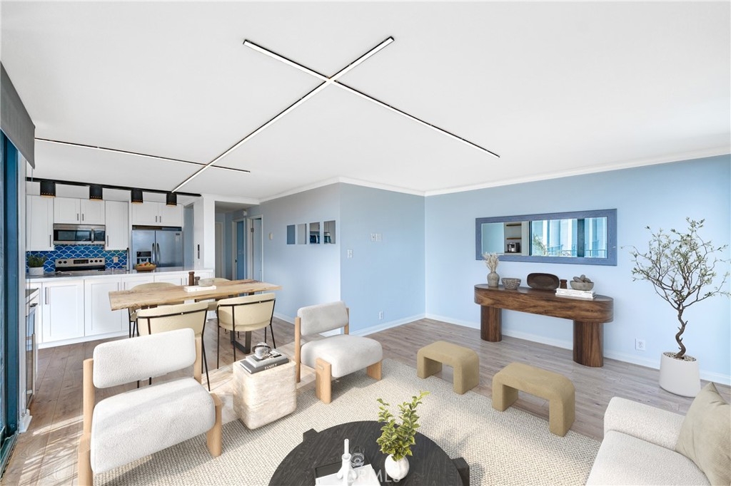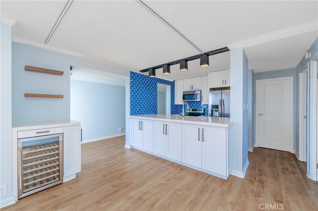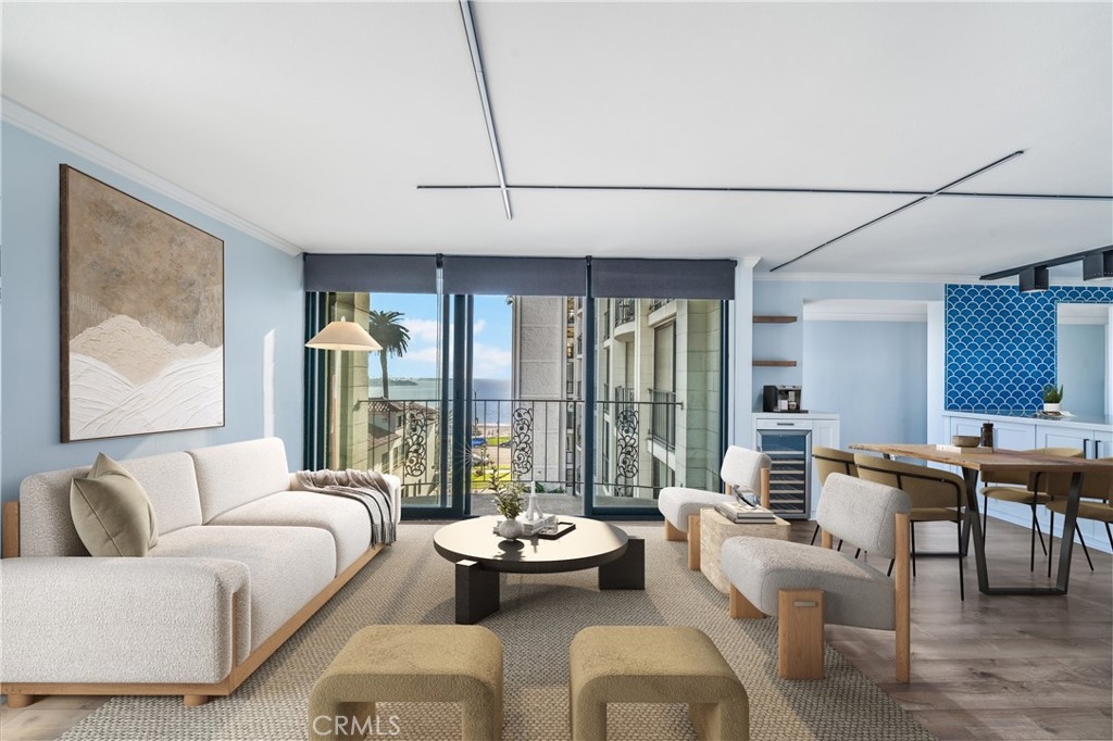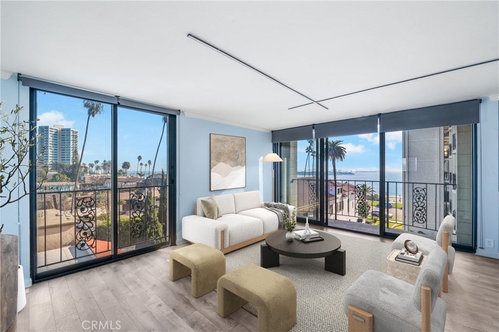 A RARE OFFERING: BEST PRICED TURNKEY OCEAN VIEW CONDO IN LONG BEACH. Discover luxury living in this stunning 2 bed, 2 full bath condo in the exquisite Versailles building, perfectly situated in the heart of Bluff Park. This beautifully upgraded corner unit boasts floor-to-ceiling, breathtaking ocean views . Revel in the elegant kitchen complete with soft close cabinets, quartz countertops, a two-drawer dishwasher, imported tile, and a chic dry bar with a wine fridge. Upscale appliances and additional storage complete this space. The kitchen opens up to the dining which seamlessly flows into the living room, granting the perfect open floor plan. Relish in the refreshing ocean breeze when the Fleetwood sliding doors are open, or unwind underneath the LED color smart lighting. This sophisticated space includes custom blinds that complete the modern ambiance. This home comes fully equipped with a refrigerator, washer, dryer, and tankless water heater for your convenience. Each bedroom has ample space and views of Bluff Park backed by mountains in the distance. The primary suite offers a great flex space that can be used as an office area or a place to expand your closet converting it to a "walk in". For added convenience, there is close elevator access from the unit to your secured, parking space. HOA offers an array of perks such as cable, high-speed internet, on-site management, and a plethora of other amenities, including a heated pool, BBQ grills, sauna & Clubhouse right off of the pool deck. It also covers other utilities and insurance. Just minutes from downtown Long Beach, Belmont Shore and steps away from the beach, 4th St Retro Row, ocean front fine dining, other eateries, parks, shopping and more, this condo embodies the ultimate coastal living. The ocean views are a must see in person. Photos do not do them justice. Seize the opportunity to call it yours today! Please see the features list in the supplemental section.