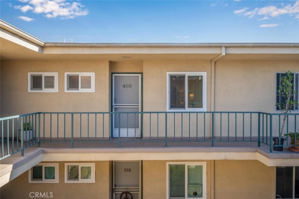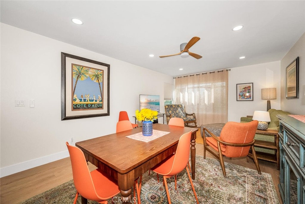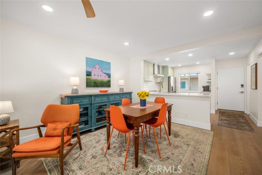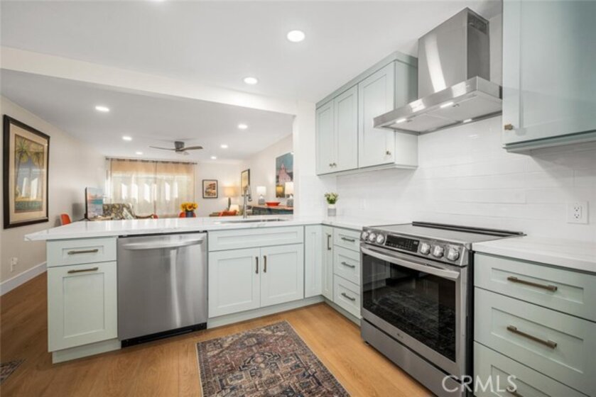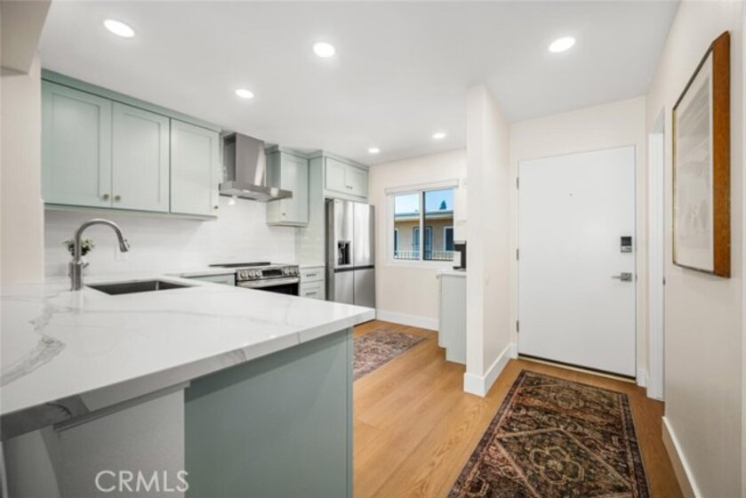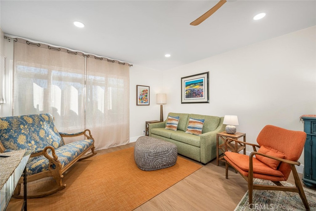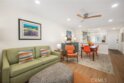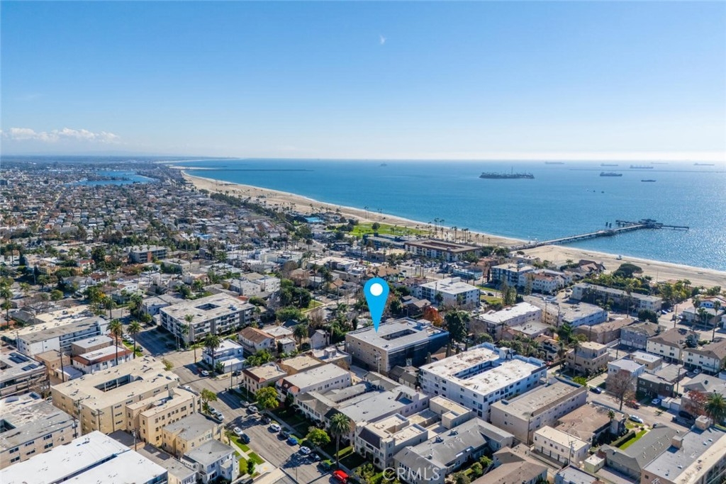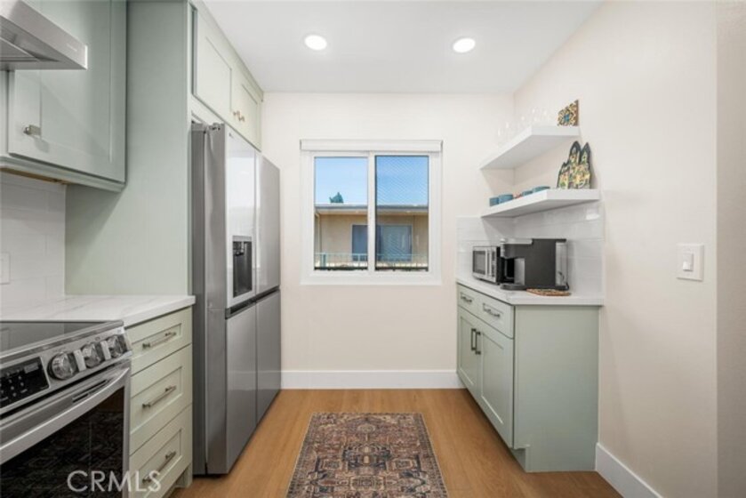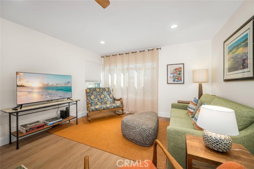 Impeccably remodeled top-floor condominium in a fantastic location just two blocks from the beach, bluff park, restaurants, and shopping. This light-filled home offers 800 square feet of thoughtfully designed living space, ideal for enjoying time by the ocean. The home features an open-concept living and dining area, a fully remodeled kitchen with a redesigned layout, new cabinetry, quartz countertops, new sink and disposal, high-end LG appliances, and a Zephyr oven hood. The spacious bedroom accommodates a king-size bed and opens to a private balcony through sliding glass doors. A bonus room off the kitchen provides flexible space for a home office or reading room. The unit also includes a convenient powder room, ideal for guests. The primary bathroom features a glass-enclosed walk-in rain shower, a large vanity, a Toto bidet seat, and high-end tile accent walls. Additional upgrades include luxury vinyl wide-plank flooring throughout, fully remodeled bathrooms, newer dual-pane windows replacing original aluminum windows, and new ceiling fans with remote controls in the living room and bedroom. The property offers one garage parking space and three large storage cabinets. The building is currently undergoing renovations outdoors to restore its original mid-century modern charm, with completion expected by the end of February.