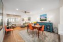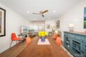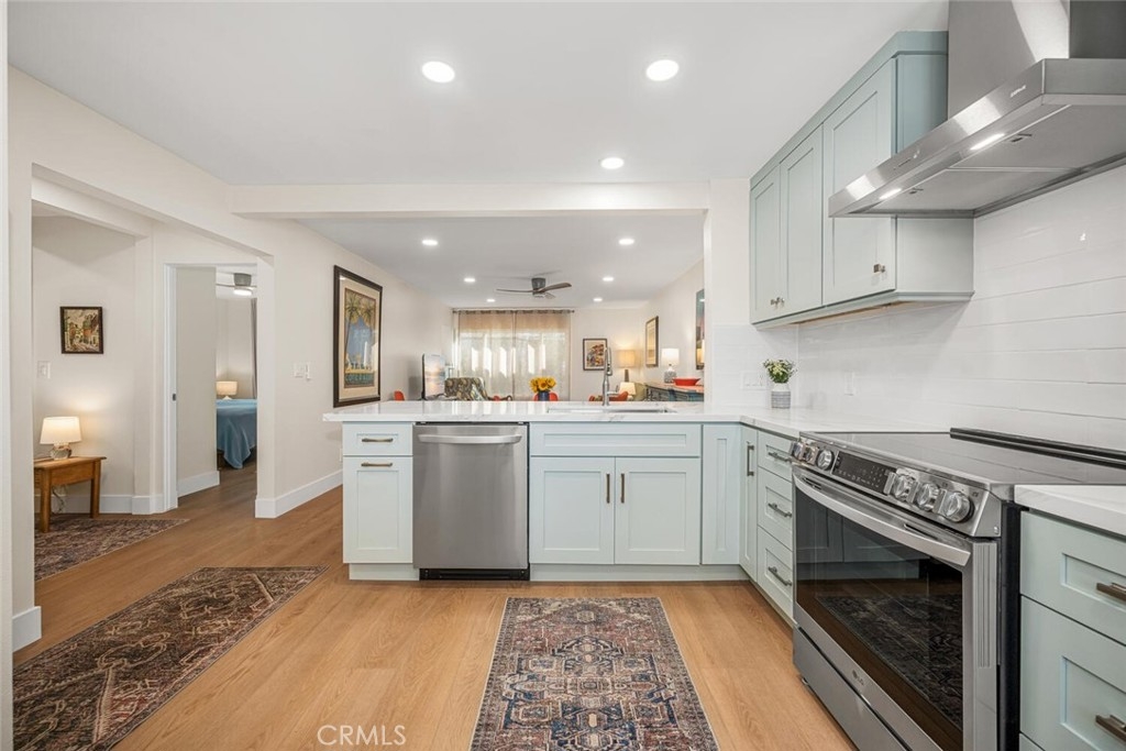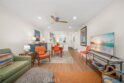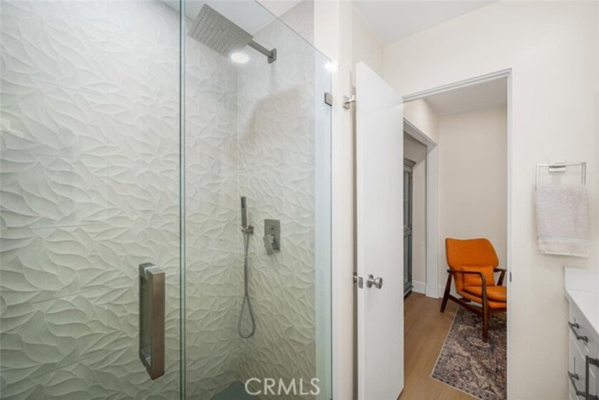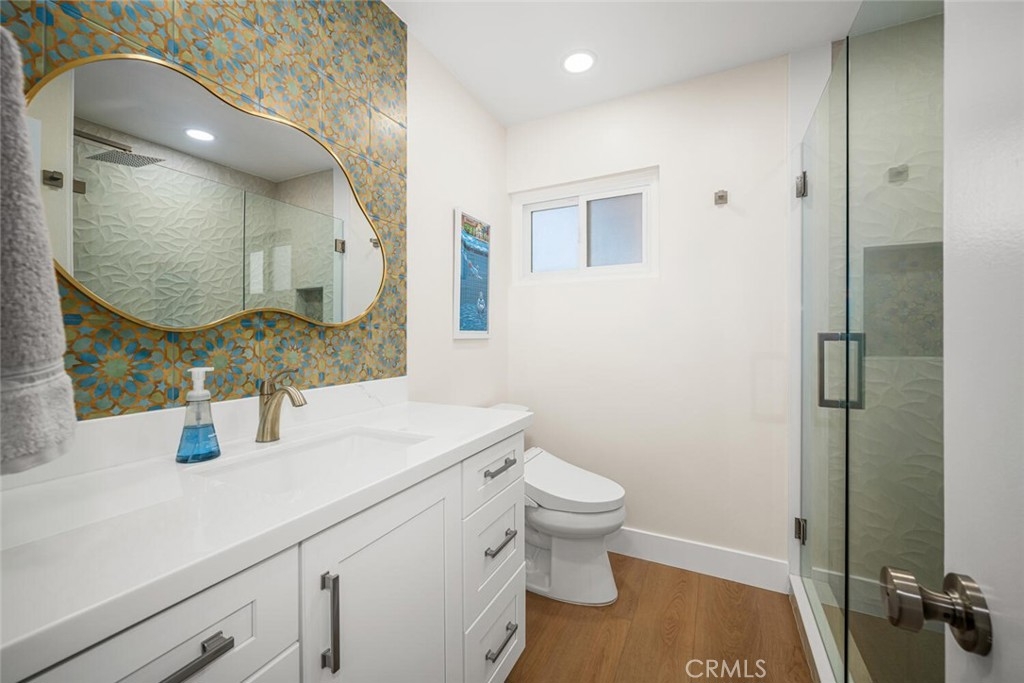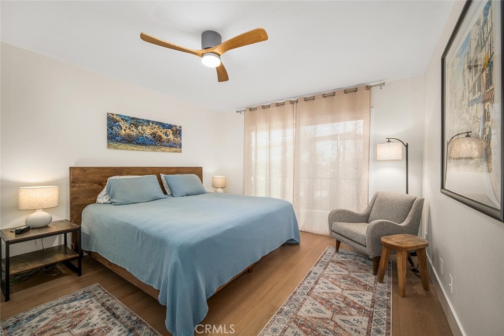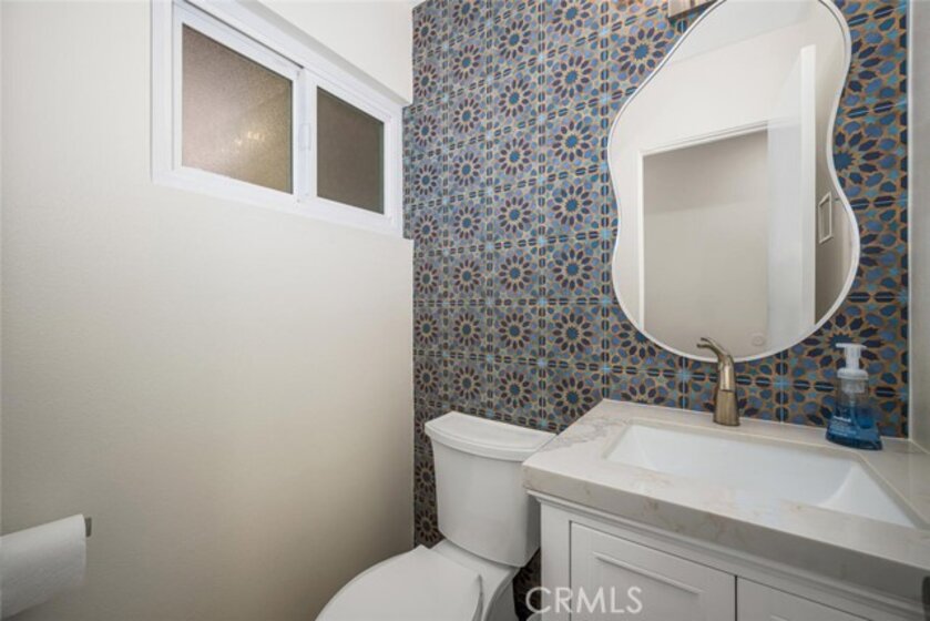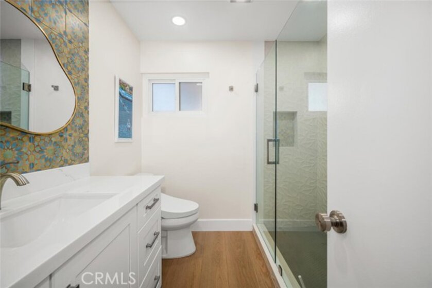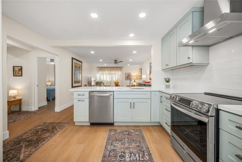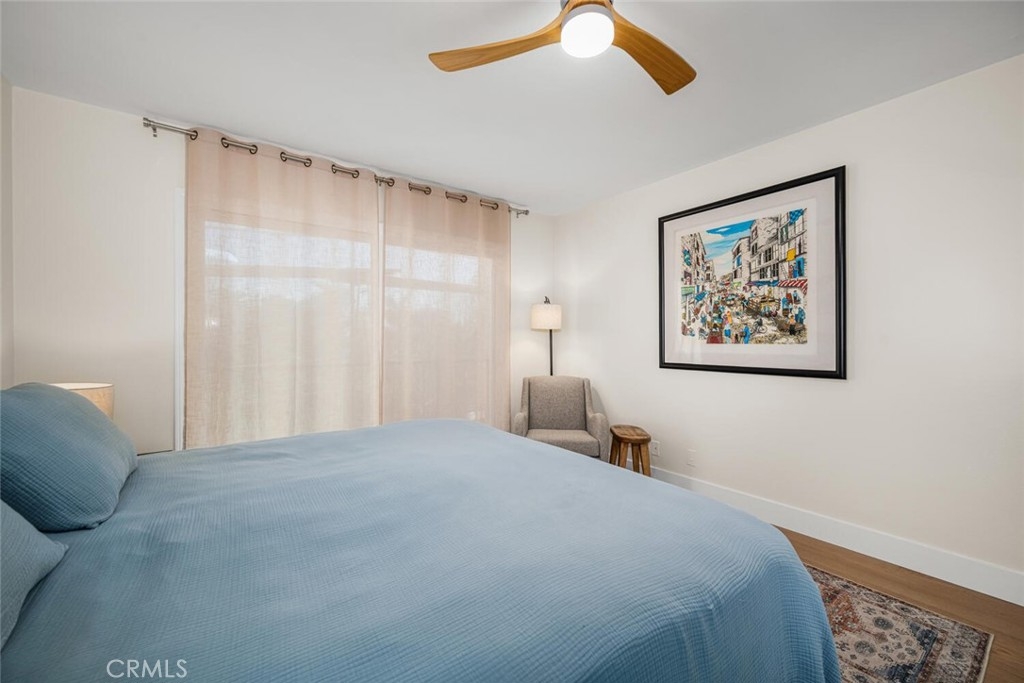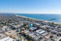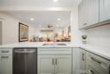 Impeccably remodeled top-floor condominium in a fantastic location just two blocks from the beach, bluff park, restaurants, and shopping. This light-filled home offers 800 square feet of thoughtfully designed living space, ideal for enjoying time by the ocean. The home features an open-concept living and dining area, a fully remodeled kitchen with a redesigned layout, new cabinetry, quartz countertops, new sink and disposal, high-end LG appliances, and a Zephyr oven hood. The spacious bedroom accommodates a king-size bed and opens to a private balcony through sliding glass doors. A bonus room off the kitchen provides flexible space for a home office or reading room. The unit also includes a convenient powder room, ideal for guests. The primary bathroom features a glass-enclosed walk-in rain shower, a large vanity, a Toto bidet seat, and high-end tile accent walls. Additional upgrades include luxury vinyl wide-plank flooring throughout, fully remodeled bathrooms, newer dual-pane windows replacing original aluminum windows, and new ceiling fans with remote controls in the living room and bedroom. The property offers one garage parking space and three large storage cabinets. The building is currently undergoing renovations outdoors to restore its original mid-century modern charm, with completion expected by the end of February.