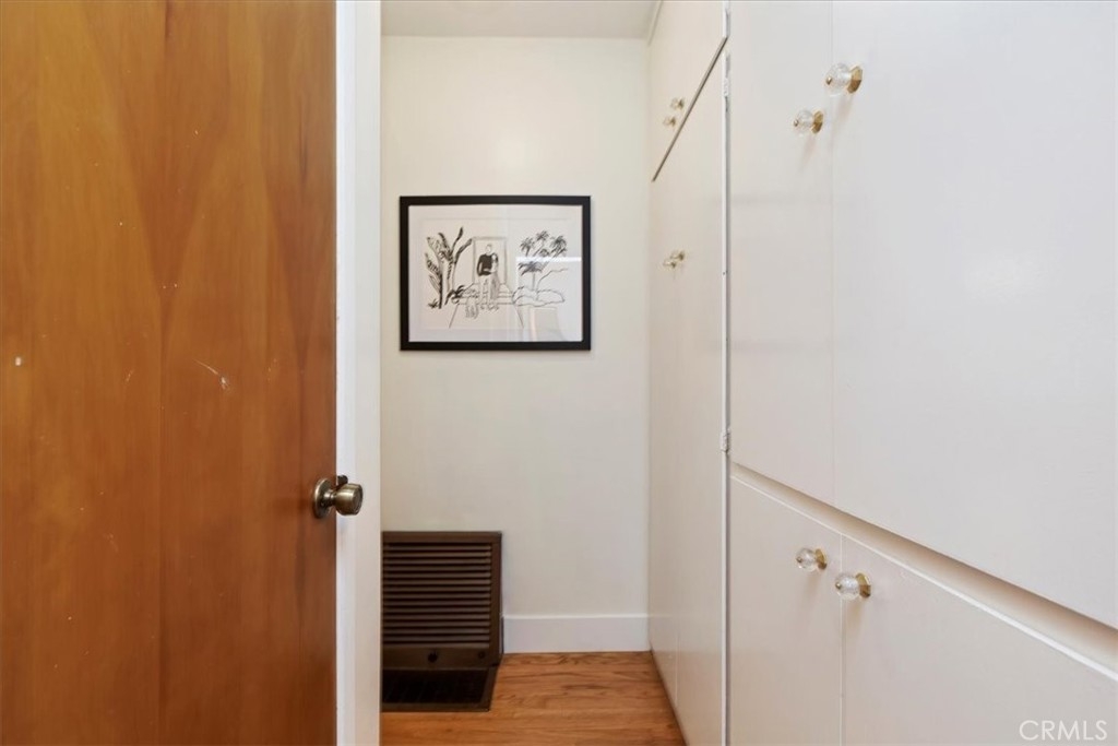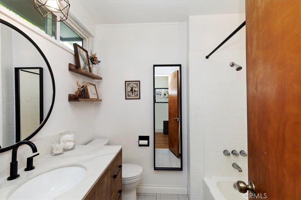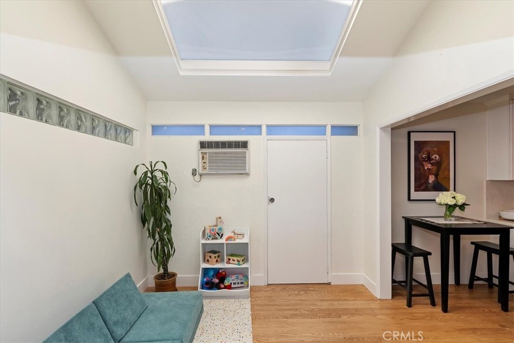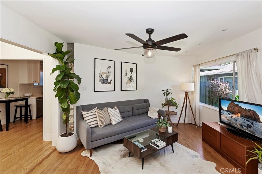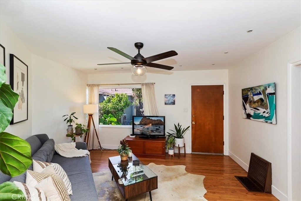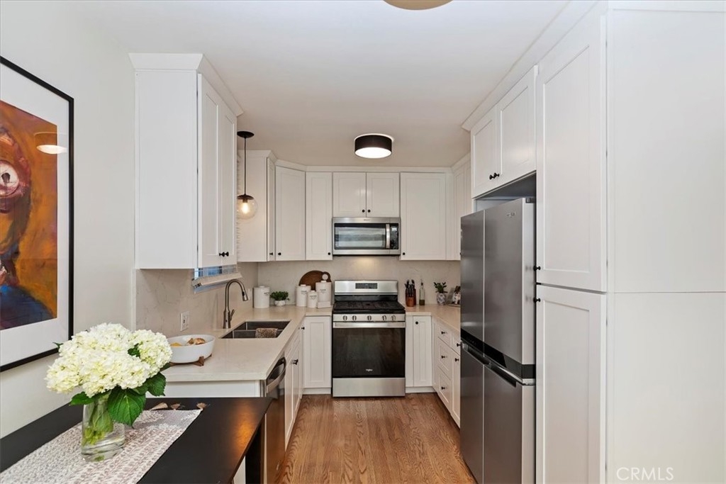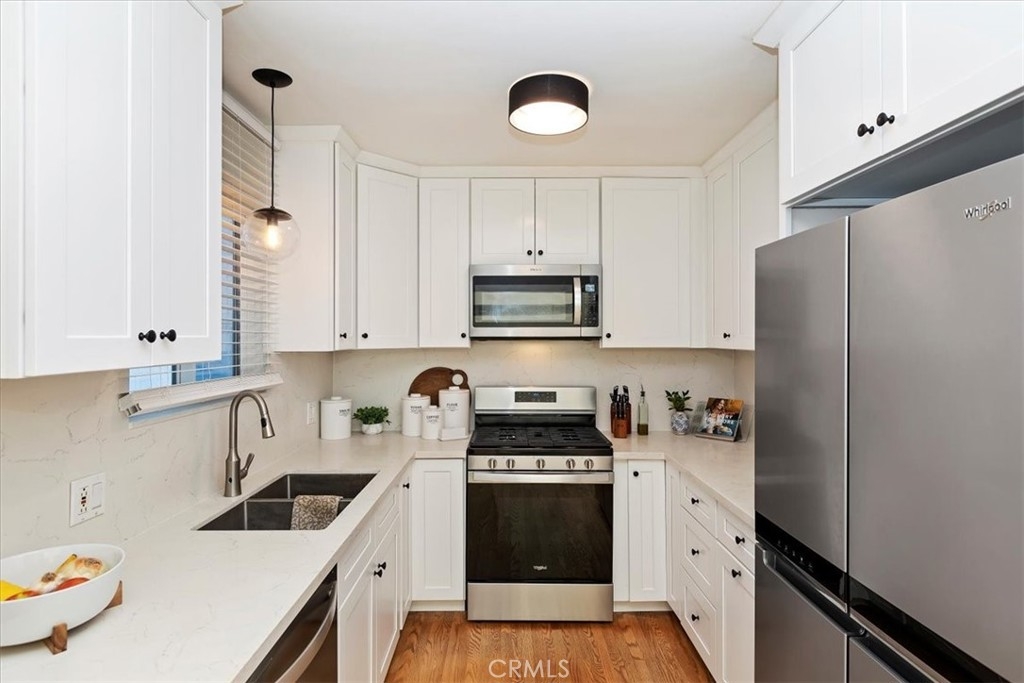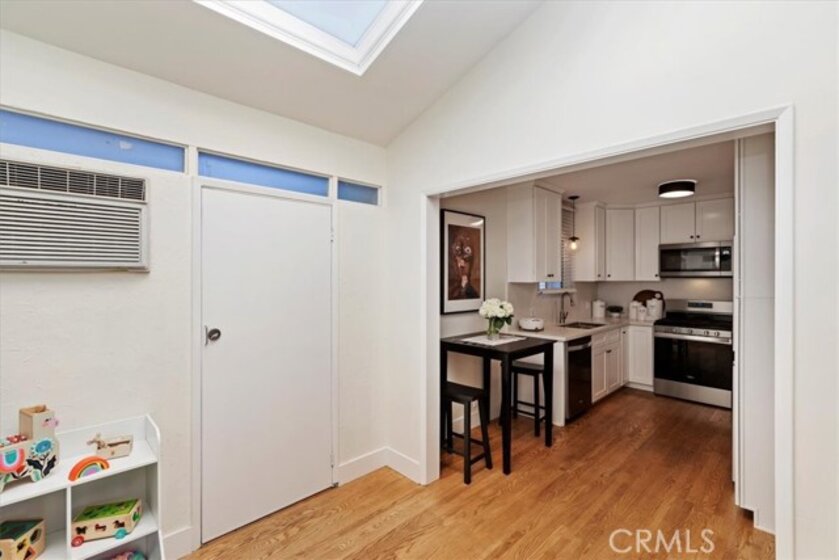 Welcome to a charming midcentury modern beach bungalow located in the highly sought after historic neighborhood of Carroll Park. Carroll Park Manor is centrally located to Downtown Long Beach and Belmont Shore. This 2 bedroom 1 bathroom condo is walking distance to the beach, Retro Row/4th Street Corridor, museums, restaurants, and shops. A warm welcoming of bright natural sunlight is radiated through the large skylight, and original newly restored hardwood floors greet you as you enter through the beautifully landscaped entrance. The newly tastefully remodeled kitchen with soft close cabinets and drawers, quartz countertops and backsplash, and new stainless steel Whirlpool appliances was completed in 2022, along with the remodeled bathroom. Brand new double-pane windows were installed in the primary bedroom, bathroom, and kitchen. Ample closet space, and complete with a detached garage for all your storage needs, and a convenient laundry room on the property. With only 12 units in this remarkable complex, this condo is move in ready.