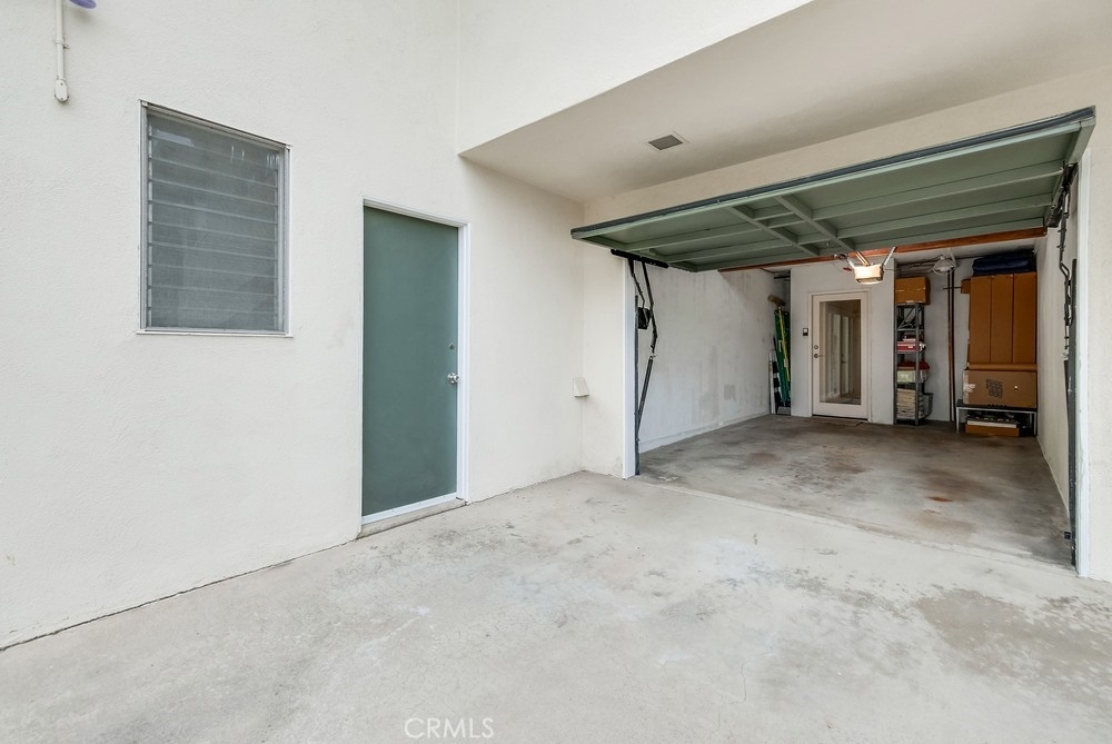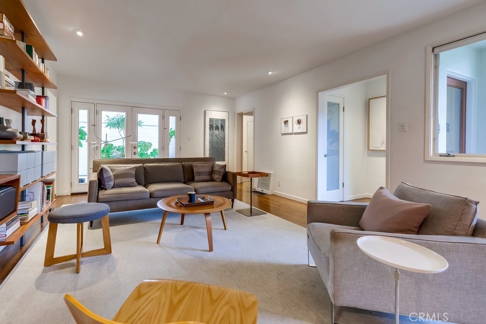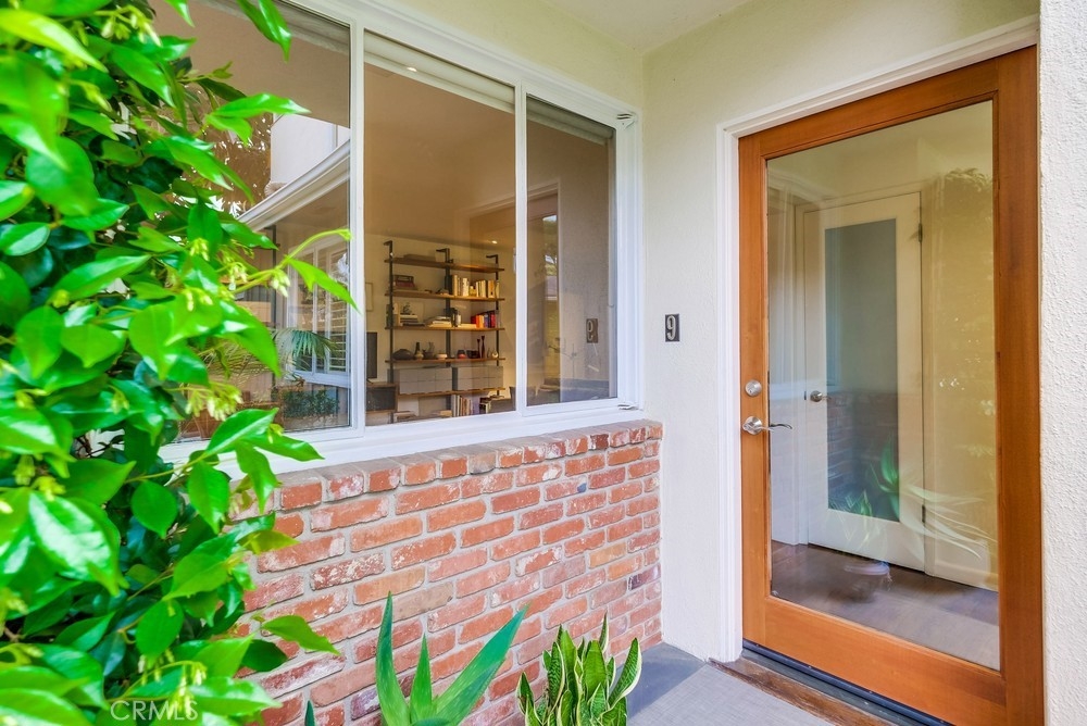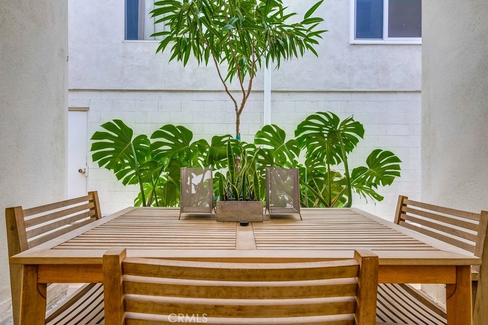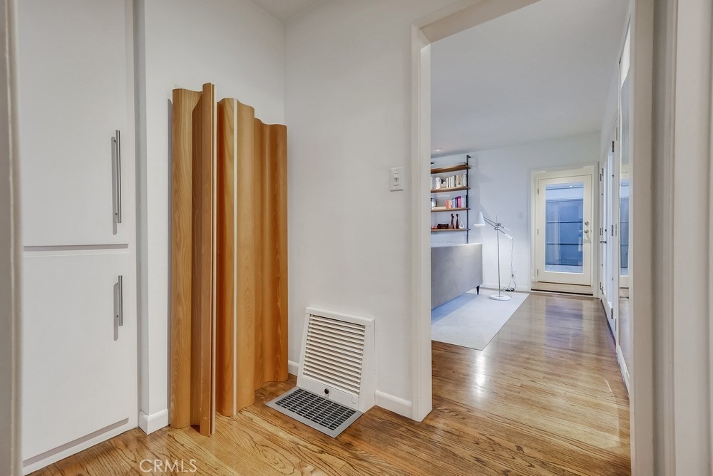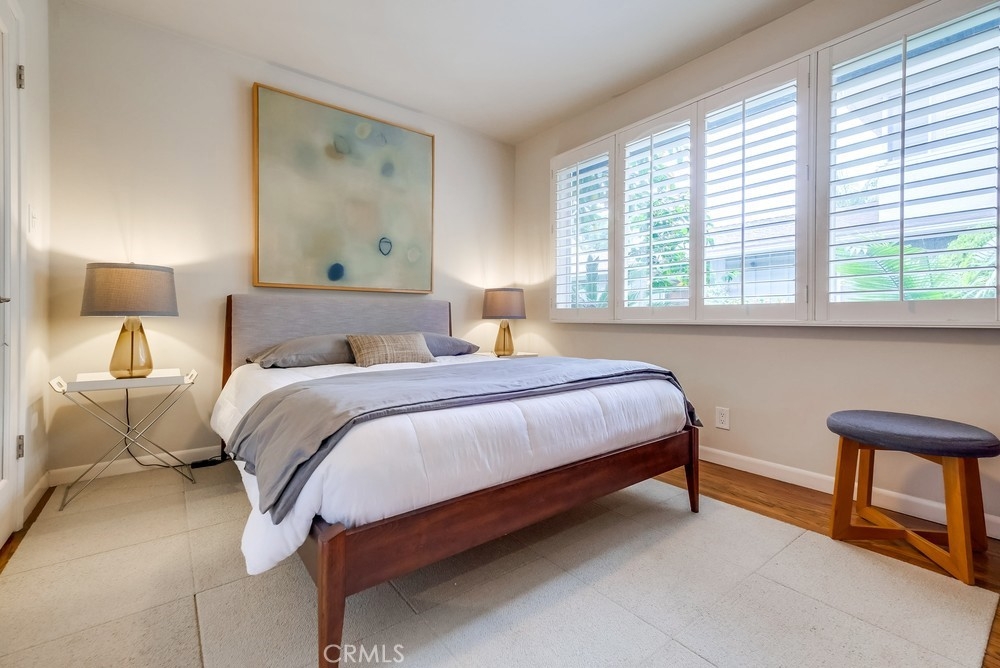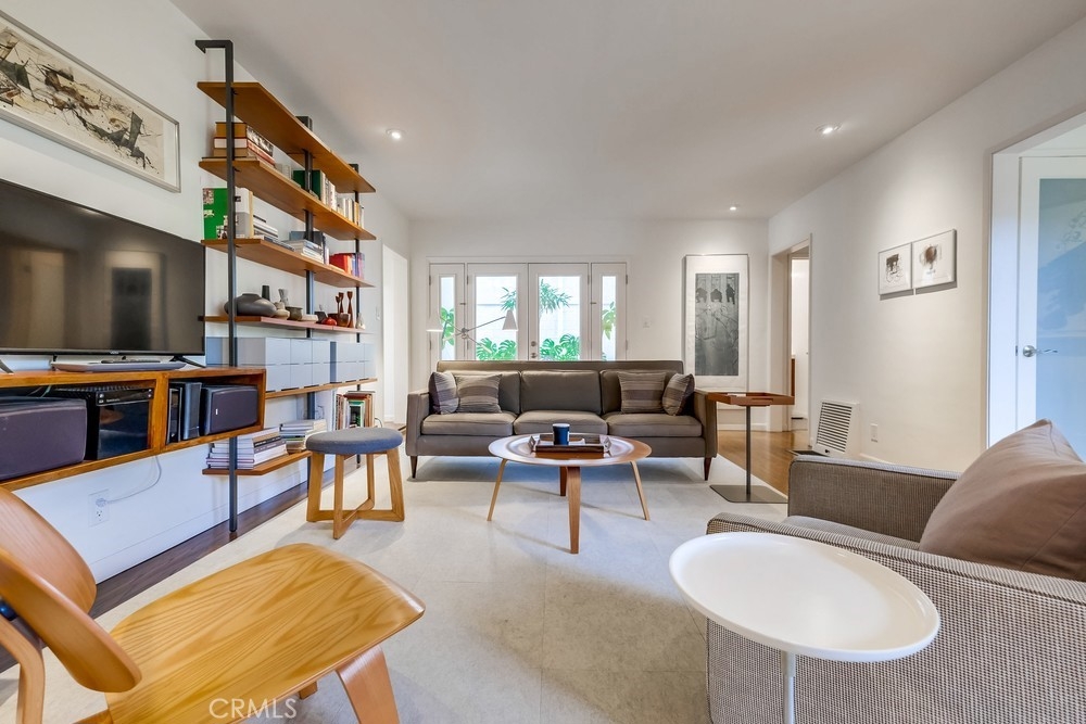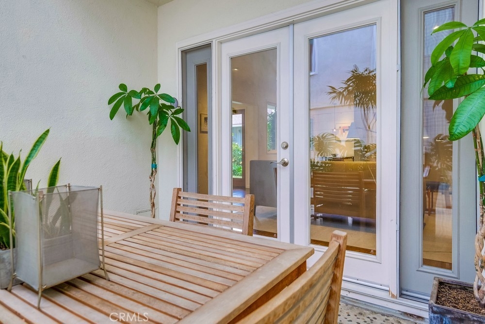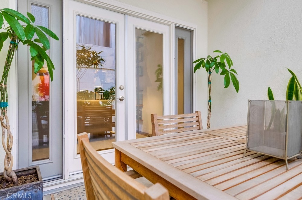 A very stylish & contemporary condo located in the highly sought after historic neighborhood of Carroll Park. Just a short stroll to the beach, chic eateries, unique shopping experiences, wine bars and the Art Theater. An architect's home designed for modern living. Gleaming oak hardwood floors and glass paneled doors throughout to allow light to softly filter from room to room. The entry foyer leads to the spacious living room filled with natural sunlight, smooth ceilings and recessed lighting. The dining area has a large casement window that overlooks the lushly landscaped courtyard. The classic kitchen retains its original immaculate neutral tile counters and white washed cabinets, yet has been updated with stainless steel appliances, contemporary hardware and interior cabinets that have been outfitted with a concealed microwave and interior organizers. The living area leads to a delightful patio accessed by French doors and made private by mature potted monstera plants. The central hallway features dual linen cabinets. The bathroom has been remodeled with a modern wood vanity with white porcelain counter top and frameless glass tub enclosure with rain shower. Both bedrooms are spacious with windows outfitted with louvered plantation shutters. The secondary bedroom has a convenient full size stackable washer and dryer concealed on one side of the closet. Capping off the list of amenities is a very rare private direct access 1 car garage accessed by an entry vestibule off the main living area. The garage has storage nooks on either side of the pedestrian entry. This condominium unit is one of a kind and a property this clean and well designed rarely enters the market.