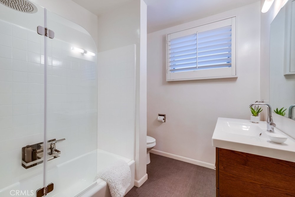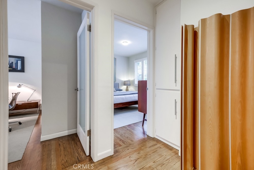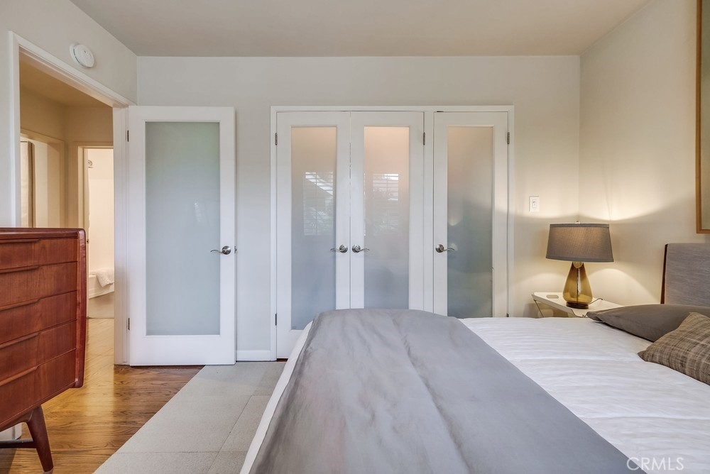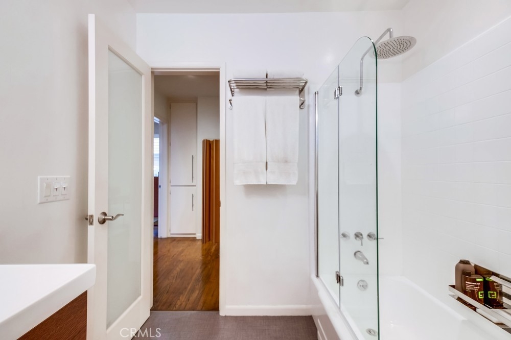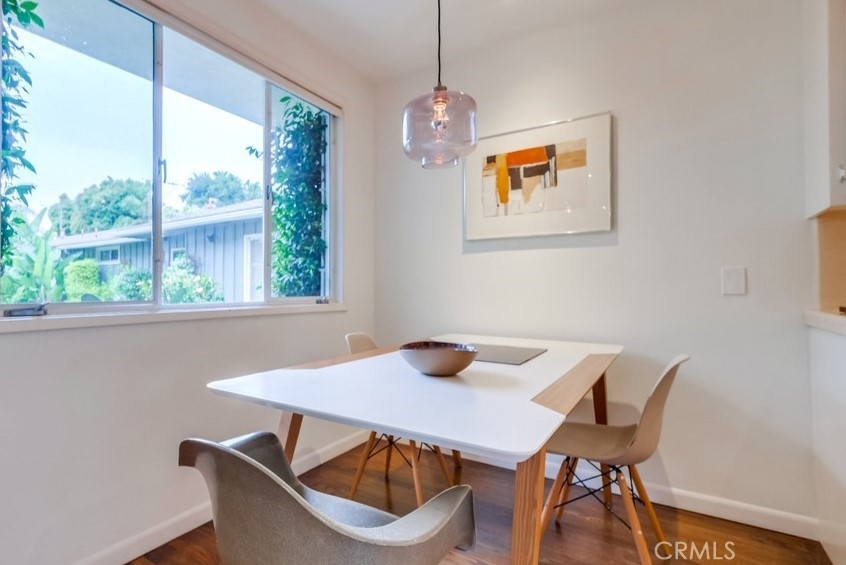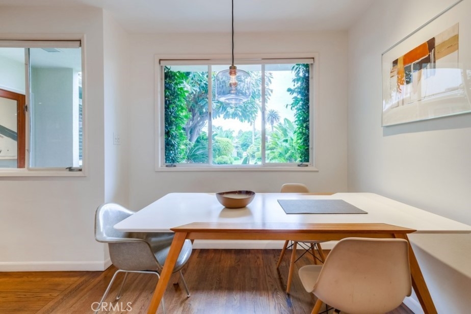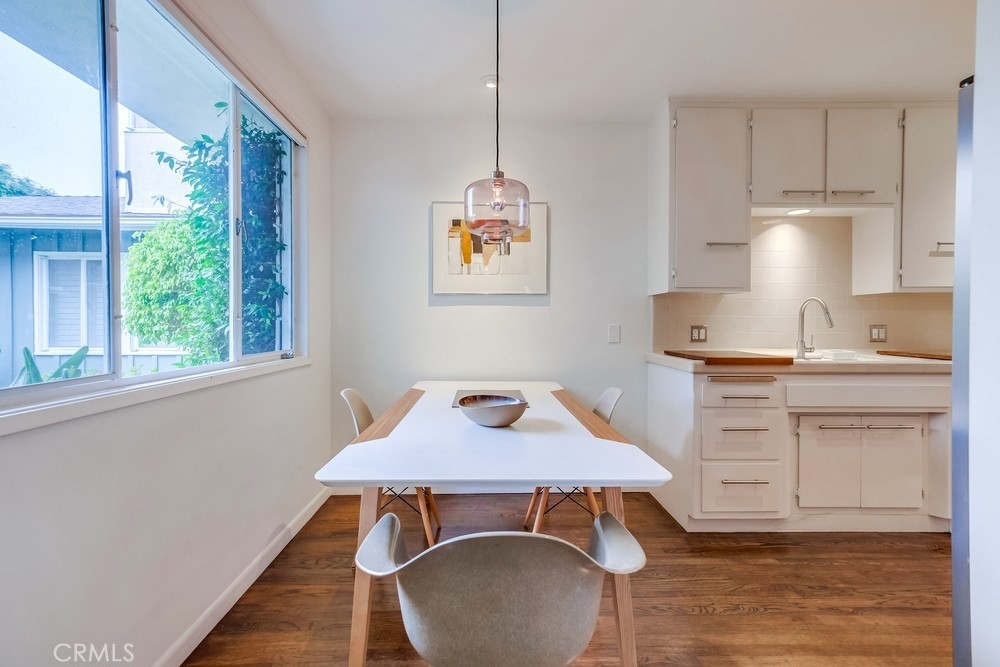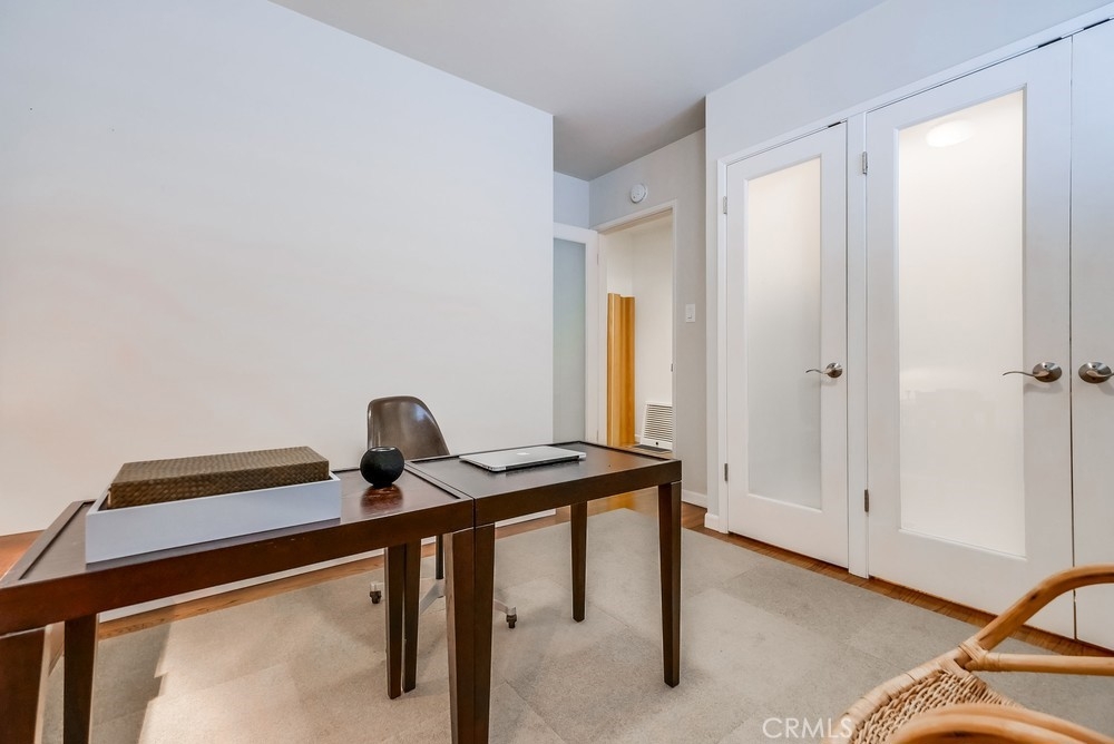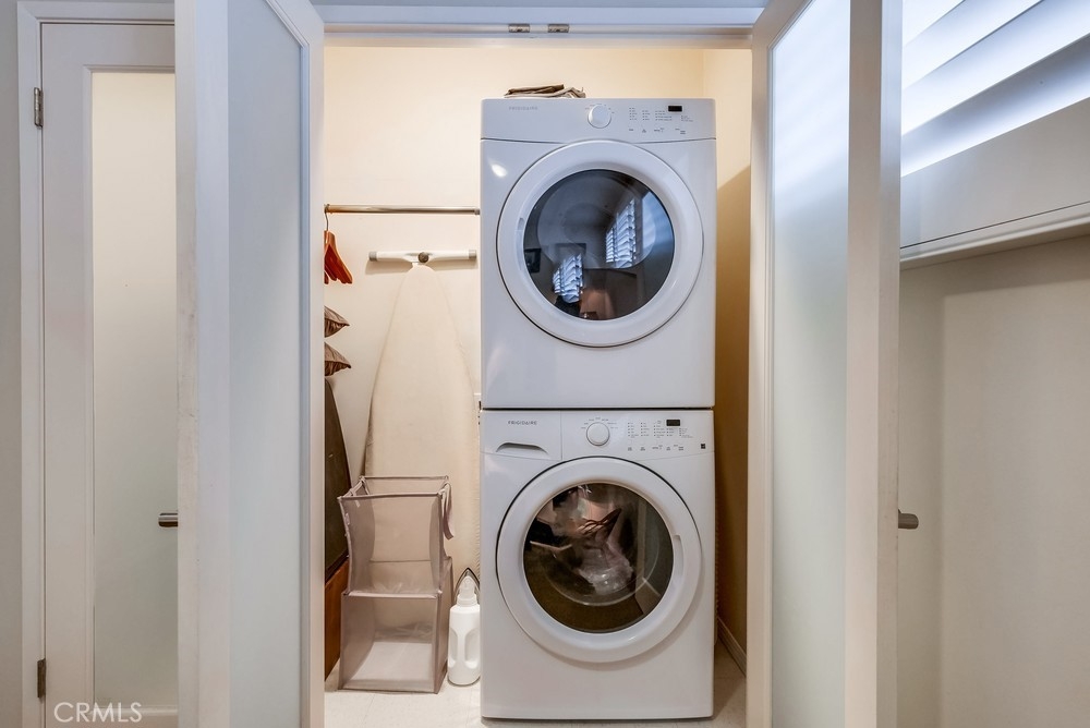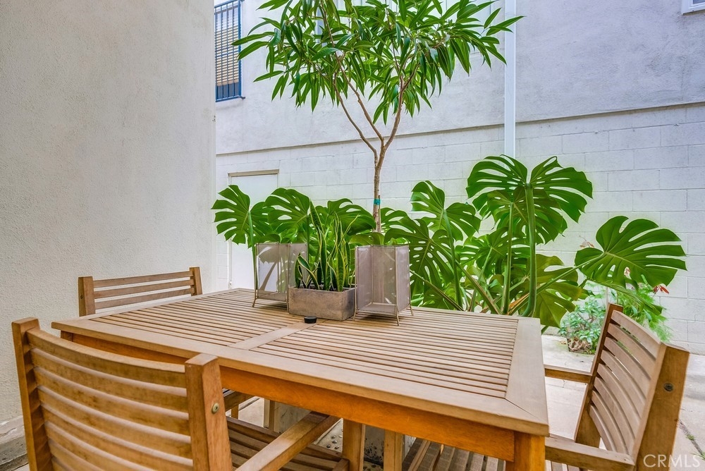A very stylish & contemporary condo located in the highly sought after historic neighborhood of Carroll Park. Just a short stroll to the beach, chic eateries, unique shopping experiences, wine bars and the Art Theater. An architect's home designed for modern living. Gleaming oak hardwood floors and glass paneled doors throughout to allow light to softly filter from room to room. The entry foyer leads to the spacious living room filled with natural sunlight, smooth ceilings and recessed lighting. The dining area has a large casement window that overlooks the lushly landscaped courtyard. The classic kitchen retains its original immaculate neutral tile counters and white washed cabinets, yet has been updated with stainless steel appliances, contemporary hardware and interior cabinets that have been outfitted with a concealed microwave and interior organizers. The living area leads to a delightful patio accessed by French doors and made private by mature potted monstera plants. The central hallway features dual linen cabinets. The bathroom has been remodeled with a modern wood vanity with white porcelain counter top and frameless glass tub enclosure with rain shower. Both bedrooms are spacious with windows outfitted with louvered plantation shutters. The secondary bedroom has a convenient full size stackable washer and dryer concealed on one side of the closet. Capping off the list of amenities is a very rare private direct access 1 car garage accessed by an entry vestibule off the main living area. The garage has storage nooks on either side of the pedestrian entry. This condominium unit is one of a kind and a property this clean and well designed rarely enters the market.