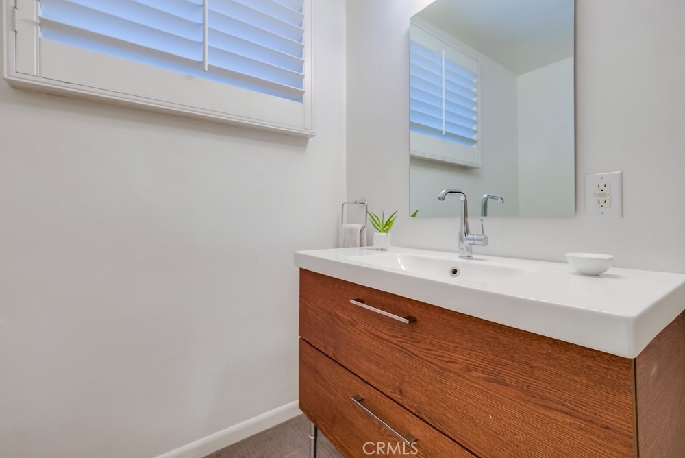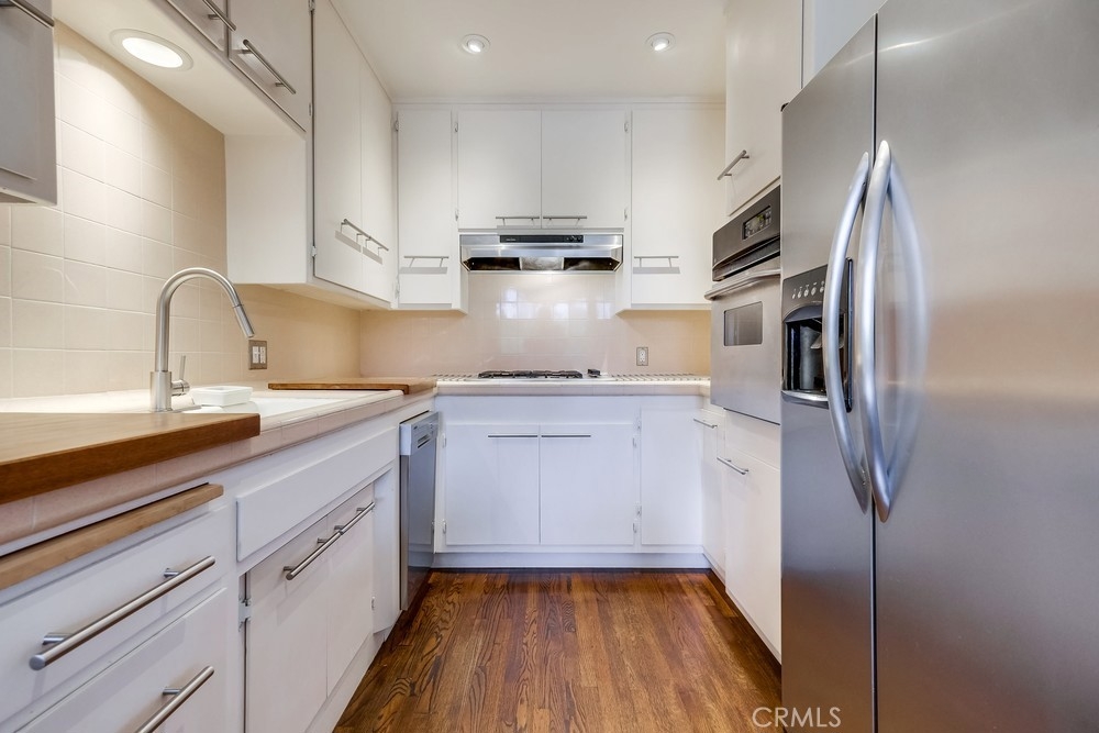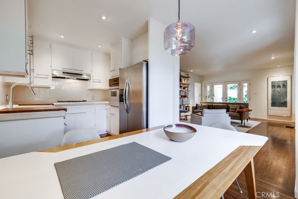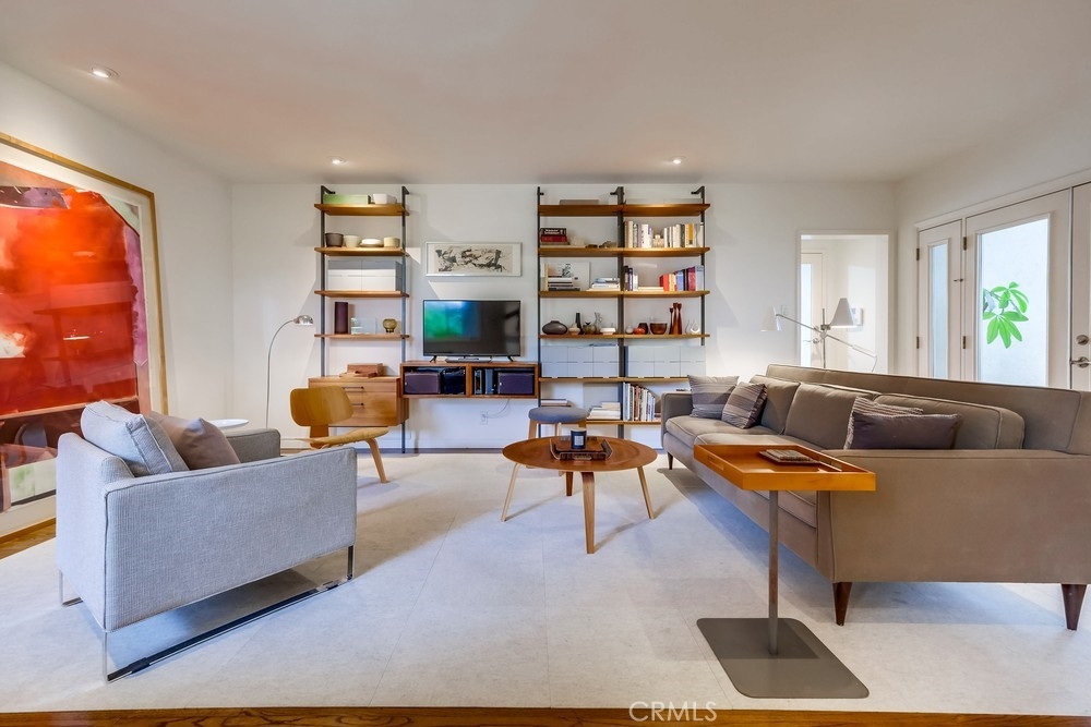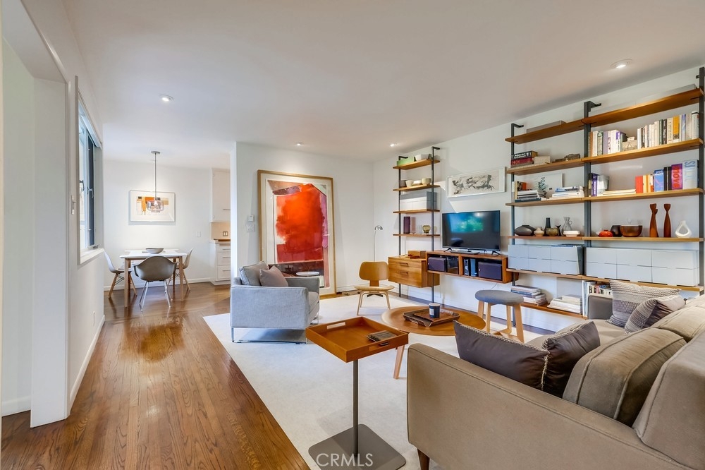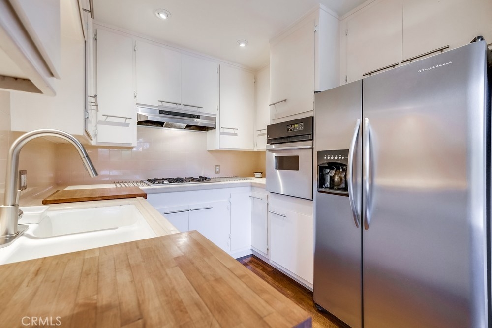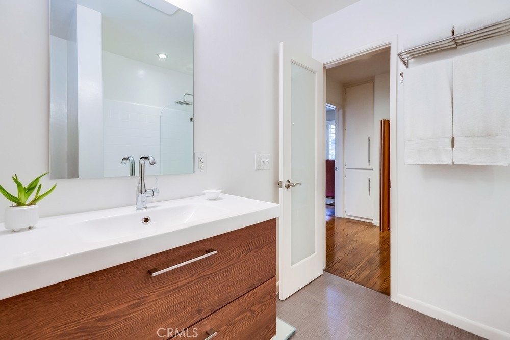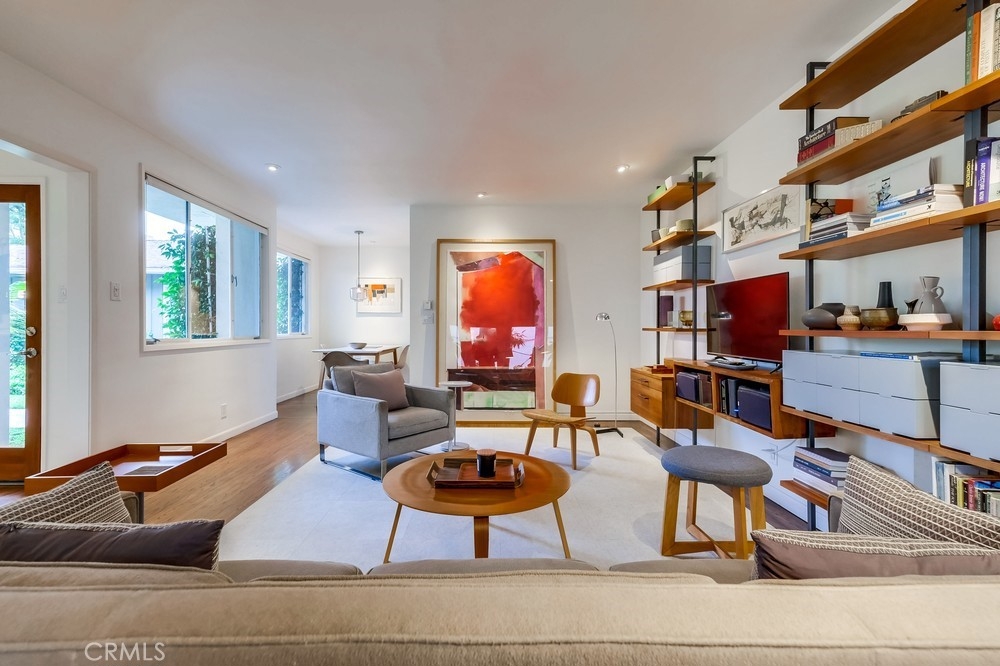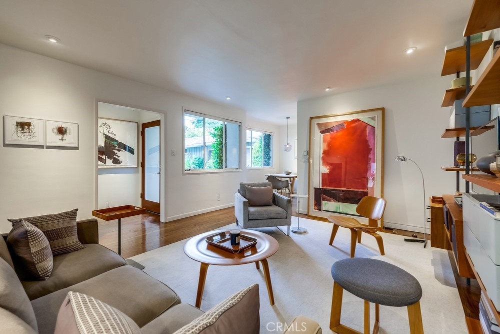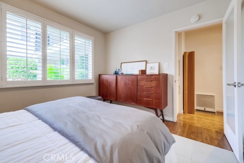 A very stylish & contemporary condo located in the highly sought after historic neighborhood of Carroll Park. Just a short stroll to the beach, chic eateries, unique shopping experiences, wine bars and the Art Theater. An architect's home designed for modern living. Gleaming oak hardwood floors and glass paneled doors throughout to allow light to softly filter from room to room. The entry foyer leads to the spacious living room filled with natural sunlight, smooth ceilings and recessed lighting. The dining area has a large casement window that overlooks the lushly landscaped courtyard. The classic kitchen retains its original immaculate neutral tile counters and white washed cabinets, yet has been updated with stainless steel appliances, contemporary hardware and interior cabinets that have been outfitted with a concealed microwave and interior organizers. The living area leads to a delightful patio accessed by French doors and made private by mature potted monstera plants. The central hallway features dual linen cabinets. The bathroom has been remodeled with a modern wood vanity with white porcelain counter top and frameless glass tub enclosure with rain shower. Both bedrooms are spacious with windows outfitted with louvered plantation shutters. The secondary bedroom has a convenient full size stackable washer and dryer concealed on one side of the closet. Capping off the list of amenities is a very rare private direct access 1 car garage accessed by an entry vestibule off the main living area. The garage has storage nooks on either side of the pedestrian entry. This condominium unit is one of a kind and a property this clean and well designed rarely enters the market.
