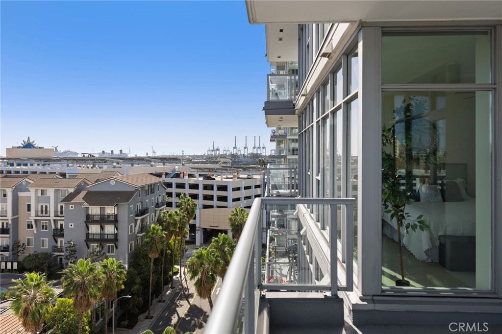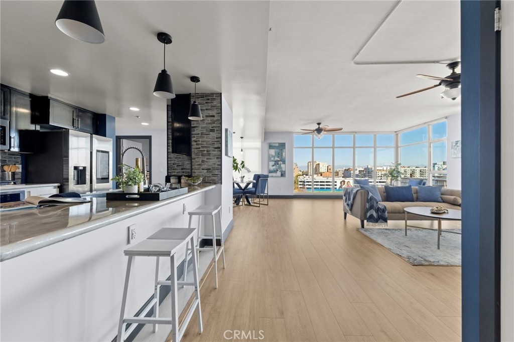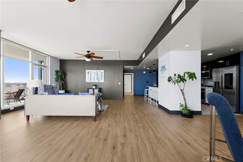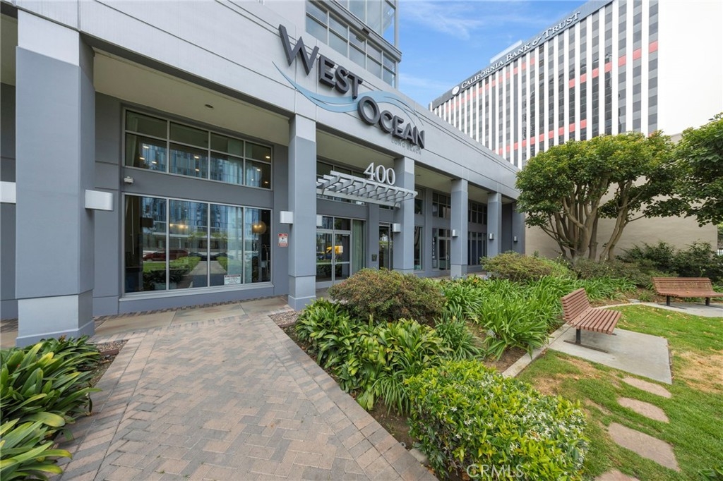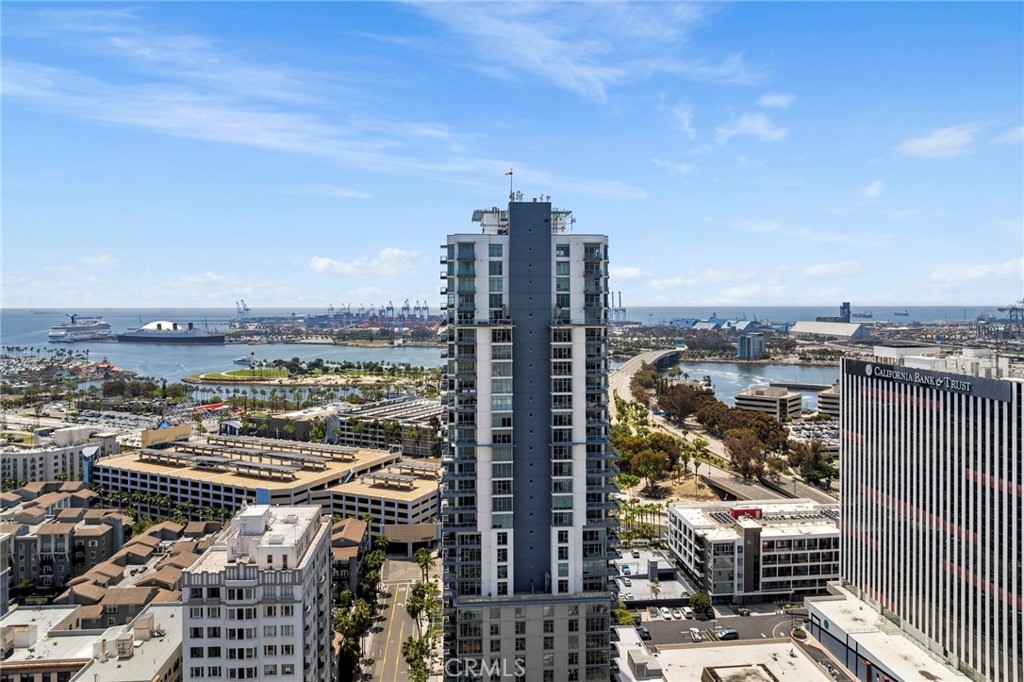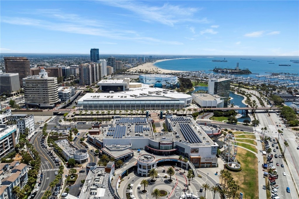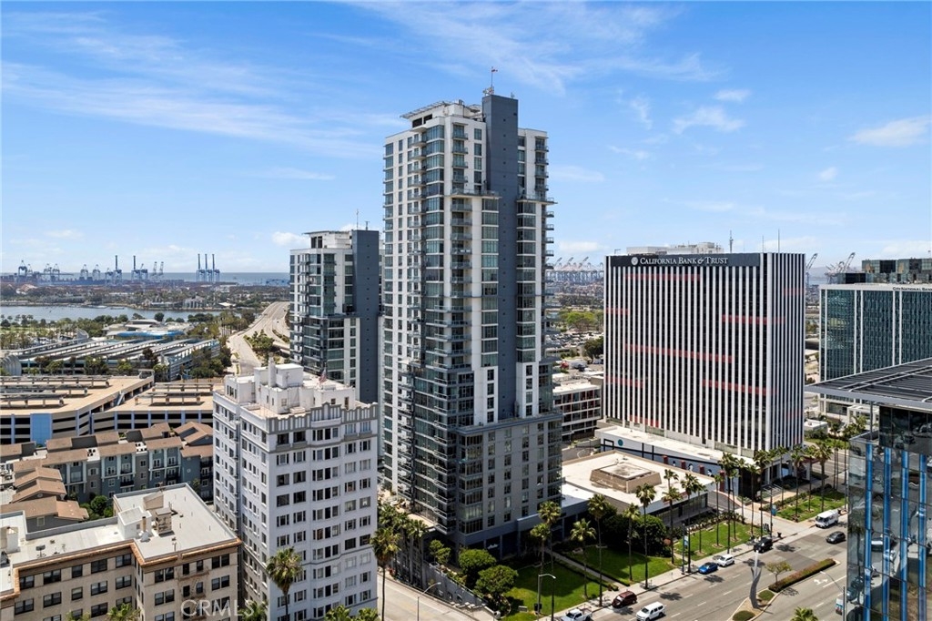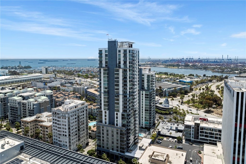 This stylish two-bedroom, two-bath residence in a sought-after downtown Long Beach high-rise blends contemporary comfort with sweeping city and harbor views. Floor-to-ceiling windows bathe the open-concept interior in natural light, accentuating the sleek plank flooring that flows throughout the home. The thoughtfully designed kitchen is ideal for both everyday living and entertaining, anchored by a generous eat-in island and finished with epoxied granite countertops for a polished, modern look. Striking two-tone cabinetry, crisp white lowers paired with bold black uppers, adds visual depth, complemented by a stylish backsplash and a dedicated dining area just beyond. The primary suite offers a tranquil retreat with dual closets and a private bath featuring dual vanities and a sophisticated glass-enclosed shower. A spacious secondary bedroom is conveniently located near a full guest bathroom, complete with a soaking tub and illuminated vanity mirror. Additional highlights include in-unit stackable washer/dryer hookups discreetly tucked into a closet and an expansive balcony, perfect for relaxing or entertaining while taking in iconic views of the Queen Mary. Residents enjoy two assigned parking spaces, guest parking, and access to an exceptional collection of building amenities, including controlled access, concierge and security services, a mail room, a catering kitchen, a resort-style pool and spa, a sauna, a fitness center, outdoor dining and BBQ areas, and an inviting outdoor fireplace. Where sophisticated design, sweeping views, and premier amenities come together in one exceptional residence.
