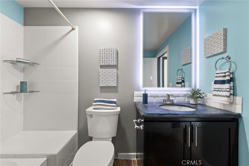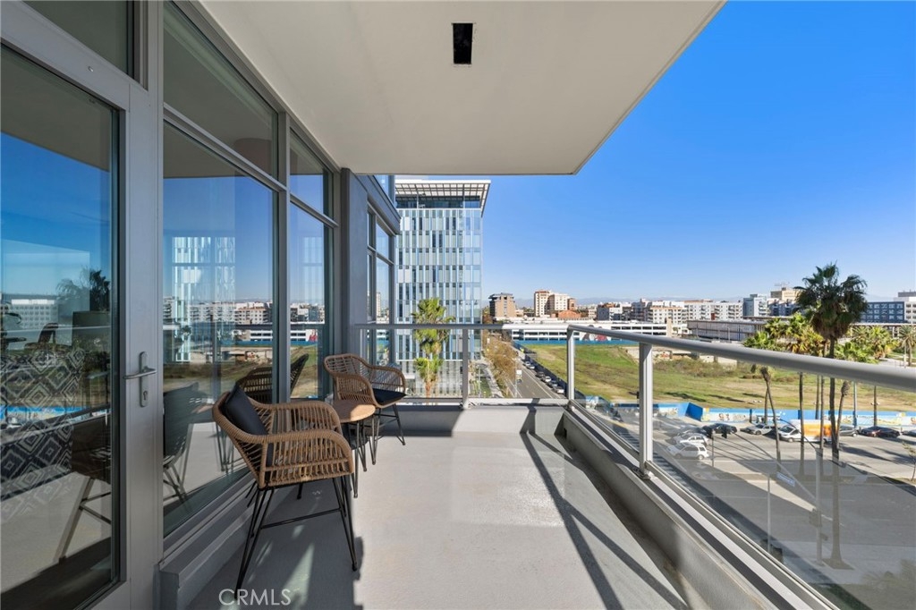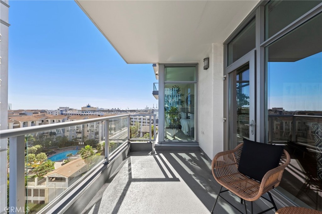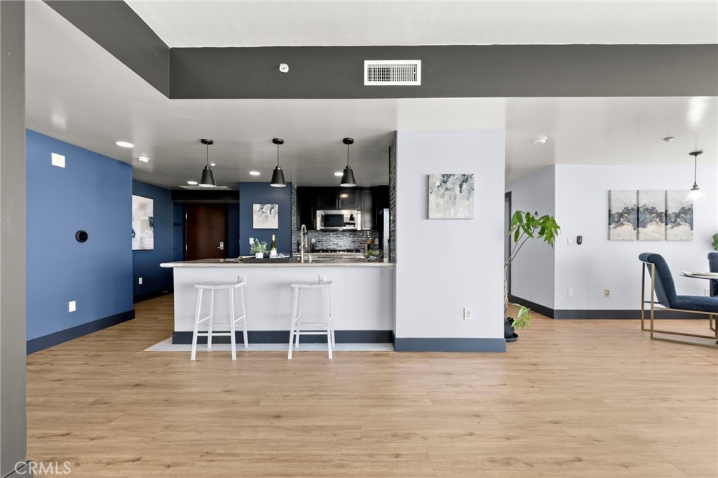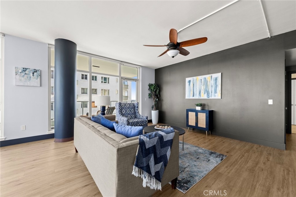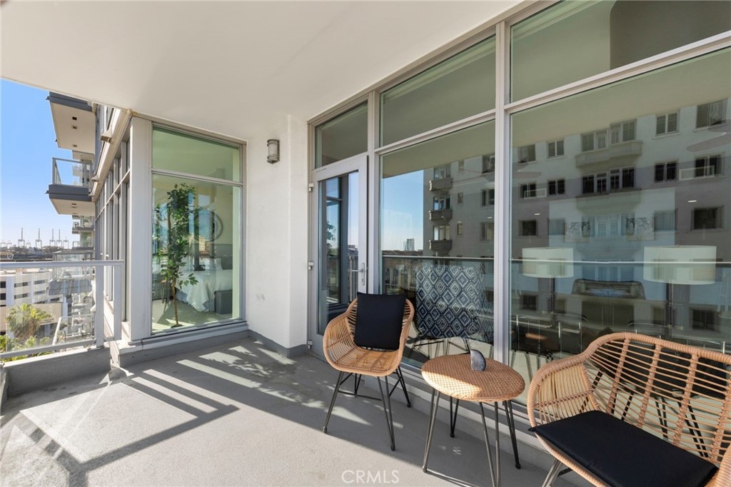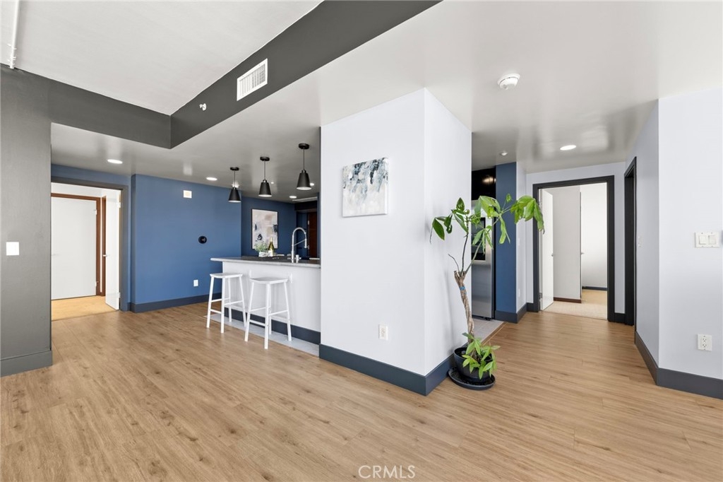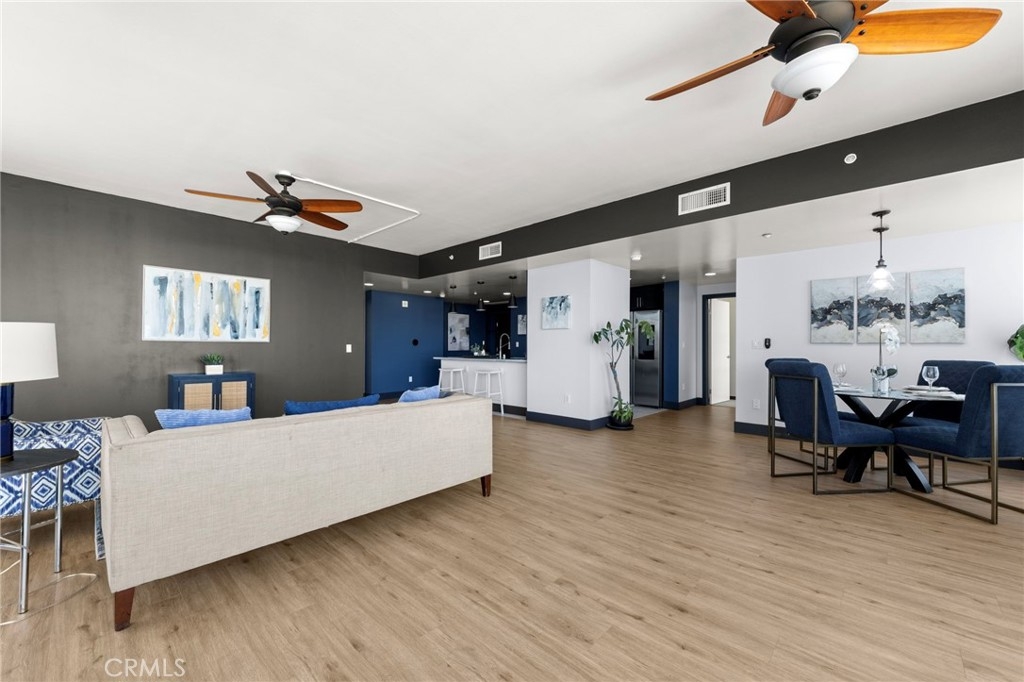 This stylish two-bedroom, two-bath residence in a sought-after downtown Long Beach high-rise blends contemporary comfort with sweeping city and harbor views. Floor-to-ceiling windows bathe the open-concept interior in natural light, accentuating the sleek plank flooring that flows throughout the home. The thoughtfully designed kitchen is ideal for both everyday living and entertaining, anchored by a generous eat-in island and finished with epoxied granite countertops for a polished, modern look. Striking two-tone cabinetry, crisp white lowers paired with bold black uppers, adds visual depth, complemented by a stylish backsplash and a dedicated dining area just beyond. The primary suite offers a tranquil retreat with dual closets and a private bath featuring dual vanities and a sophisticated glass-enclosed shower. A spacious secondary bedroom is conveniently located near a full guest bathroom, complete with a soaking tub and illuminated vanity mirror. Additional highlights include in-unit stackable washer/dryer hookups discreetly tucked into a closet and an expansive balcony, perfect for relaxing or entertaining while taking in iconic views of the Queen Mary. Residents enjoy two assigned parking spaces, guest parking, and access to an exceptional collection of building amenities, including controlled access, concierge and security services, a mail room, a catering kitchen, a resort-style pool and spa, a sauna, a fitness center, outdoor dining and BBQ areas, and an inviting outdoor fireplace. Where sophisticated design, sweeping views, and premier amenities come together in one exceptional residence.