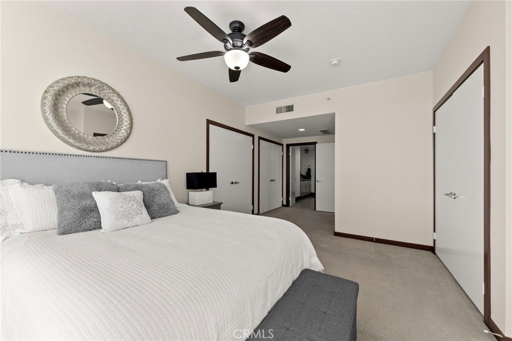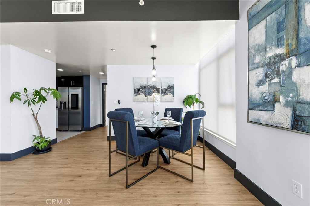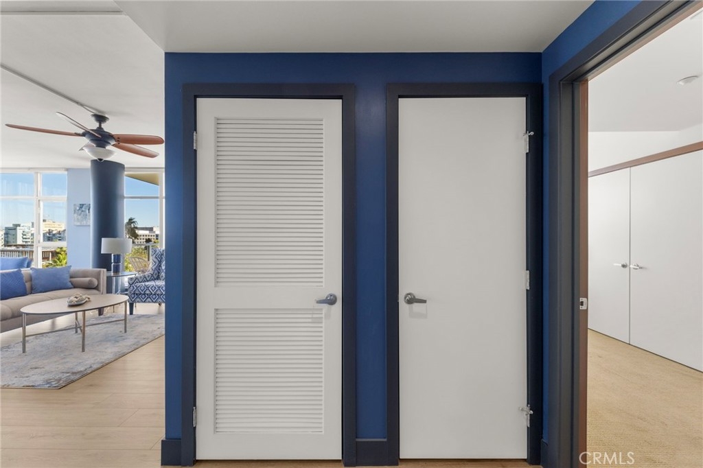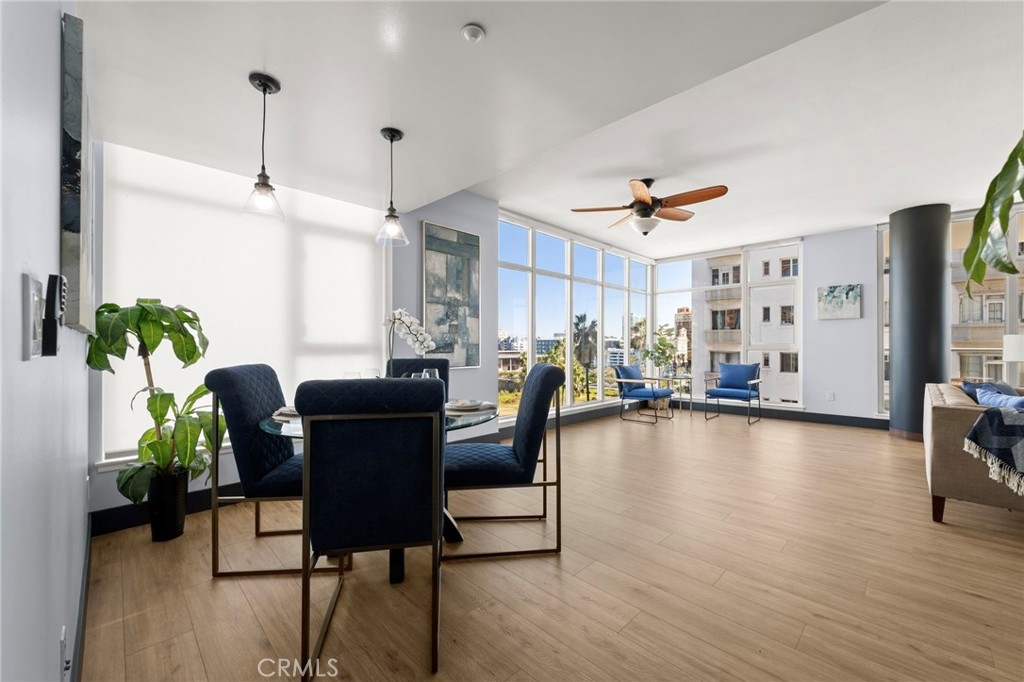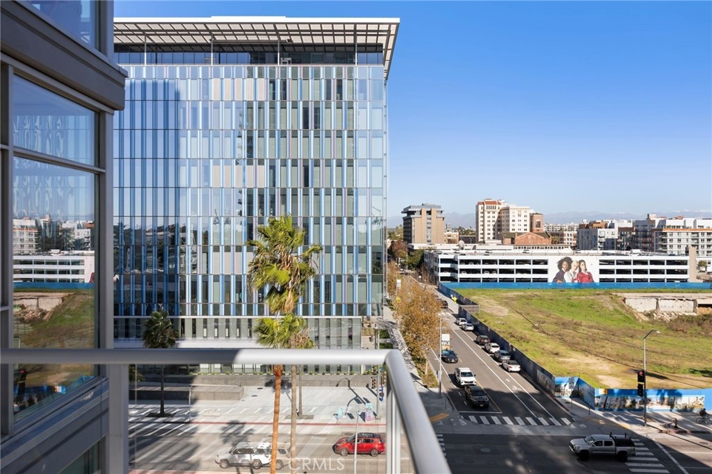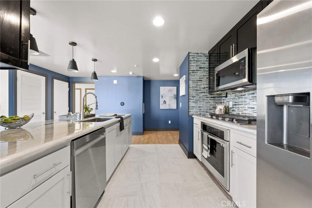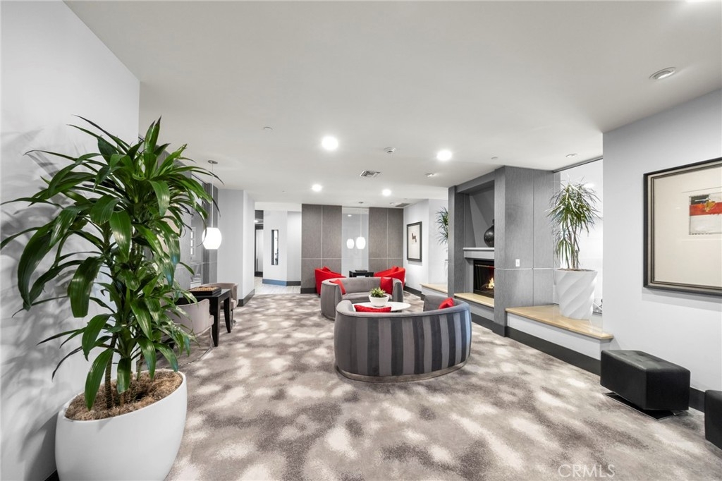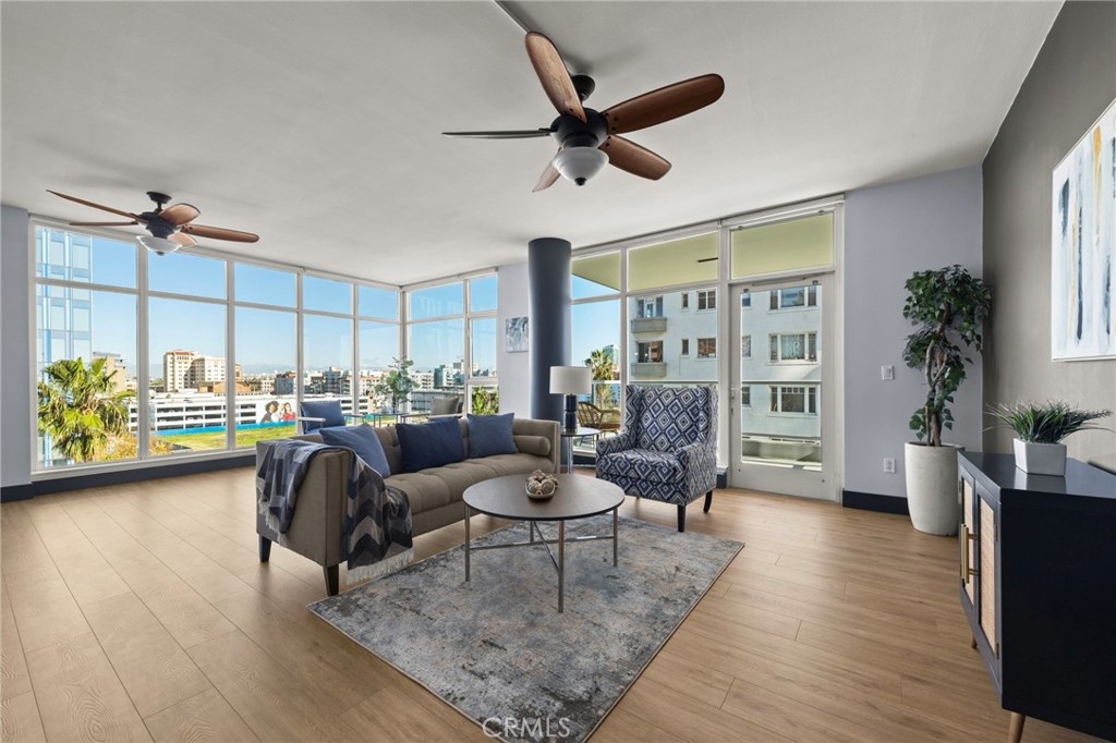 This stylish two-bedroom, two-bath residence in a sought-after downtown Long Beach high-rise blends contemporary comfort with sweeping city and harbor views. Floor-to-ceiling windows bathe the open-concept interior in natural light, accentuating the sleek plank flooring that flows throughout the home. The thoughtfully designed kitchen is ideal for both everyday living and entertaining, anchored by a generous eat-in island and finished with epoxied granite countertops for a polished, modern look. Striking two-tone cabinetry, crisp white lowers paired with bold black uppers, adds visual depth, complemented by a stylish backsplash and a dedicated dining area just beyond. The primary suite offers a tranquil retreat with dual closets and a private bath featuring dual vanities and a sophisticated glass-enclosed shower. A spacious secondary bedroom is conveniently located near a full guest bathroom, complete with a soaking tub and illuminated vanity mirror. Additional highlights include in-unit stackable washer/dryer hookups discreetly tucked into a closet and an expansive balcony, perfect for relaxing or entertaining while taking in iconic views of the Queen Mary. Residents enjoy two assigned parking spaces, guest parking, and access to an exceptional collection of building amenities, including controlled access, concierge and security services, a mail room, a catering kitchen, a resort-style pool and spa, a sauna, a fitness center, outdoor dining and BBQ areas, and an inviting outdoor fireplace. Where sophisticated design, sweeping views, and premier amenities come together in one exceptional residence.